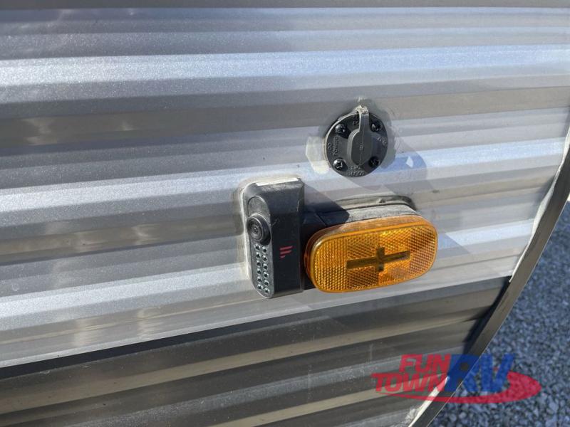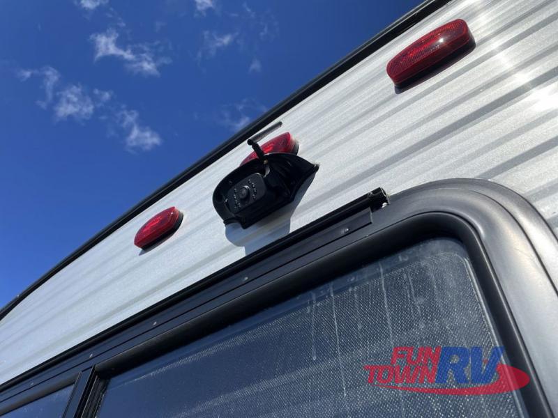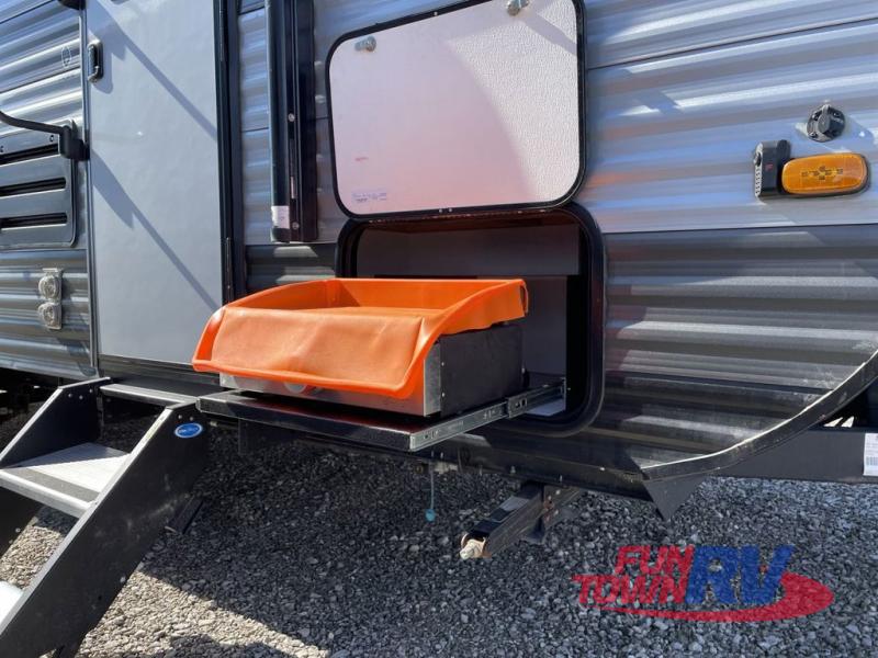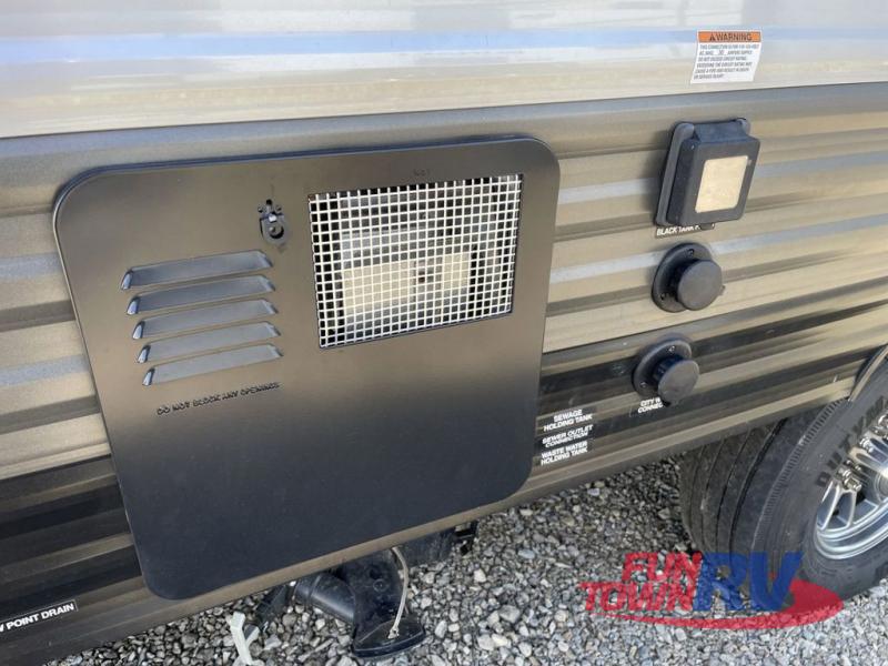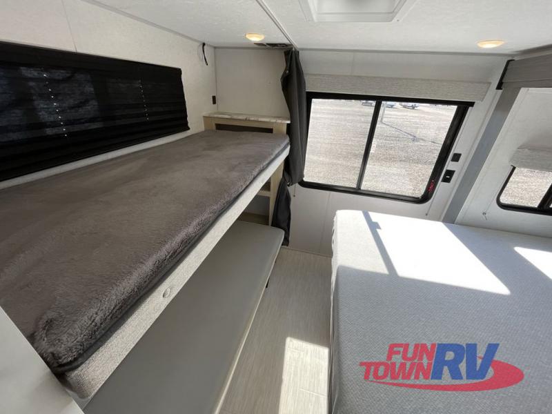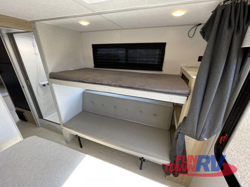 The whole family can go camping in this travel trailer! The kiddos can sleep on the set of bunk beds with bunk cubbies and you can sleep on the queen bed slide next to them. The split style bathroom makes it easy for one person to freshen up in the shower with a skylight while another uses the private toilet and sink. The fully equipped kitchen has everything you need to prepare delicious meals and there is even an outside kitchen to enjoy under the 15' power awning. The front U-shaped dinette offers a comfortable place to eat your meals, play card games, and even transform into an extra sleeping space!