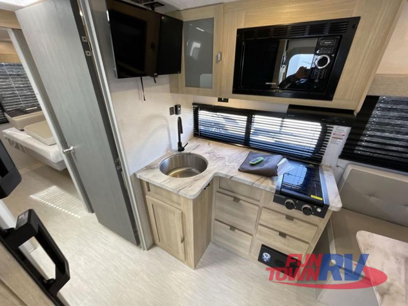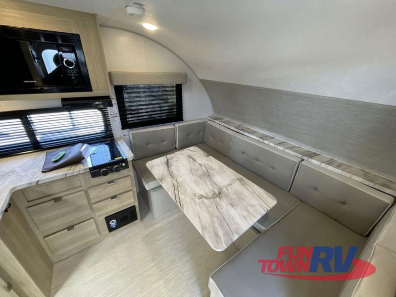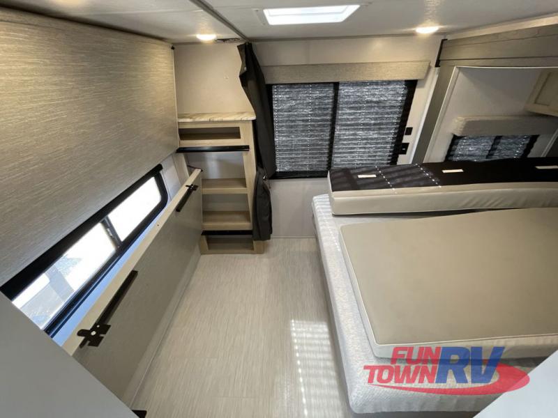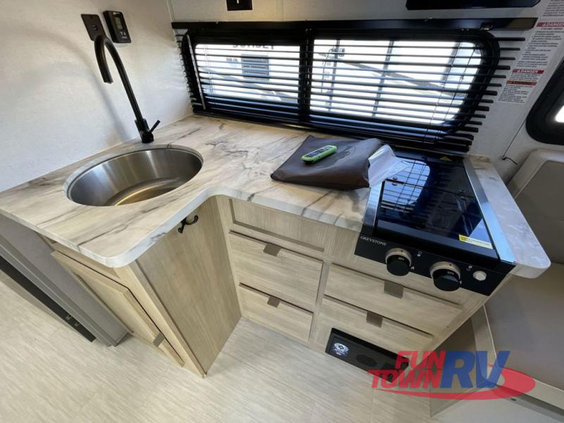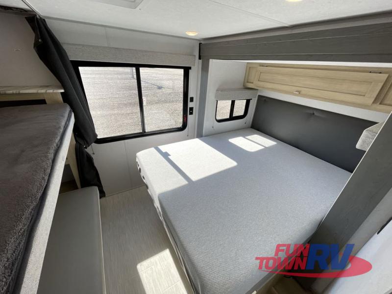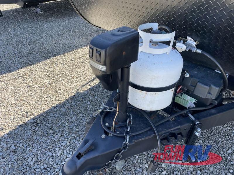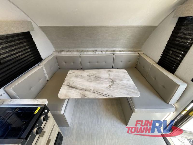The whole family can go camping in this travel trailer! The kiddos can sleep on the set of bunk beds with bunk cubbies and you can sleep on the queen bed slide next to them. The split style bathroom makes it easy for one person to freshen up in the shower with a skylight while another uses the private toilet and sink. The fully equipped kitchen has everything you need to prepare delicious meals and there is even an outside kitchen to enjoy under the 15' power awning. The front U-shaped dinette offers a comfortable place to eat your meals, play card games, and even transform into an extra sleeping space!