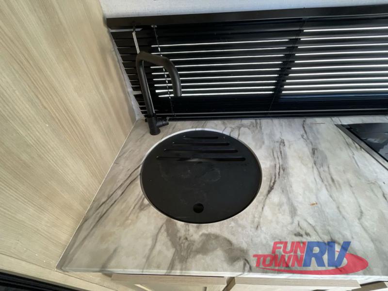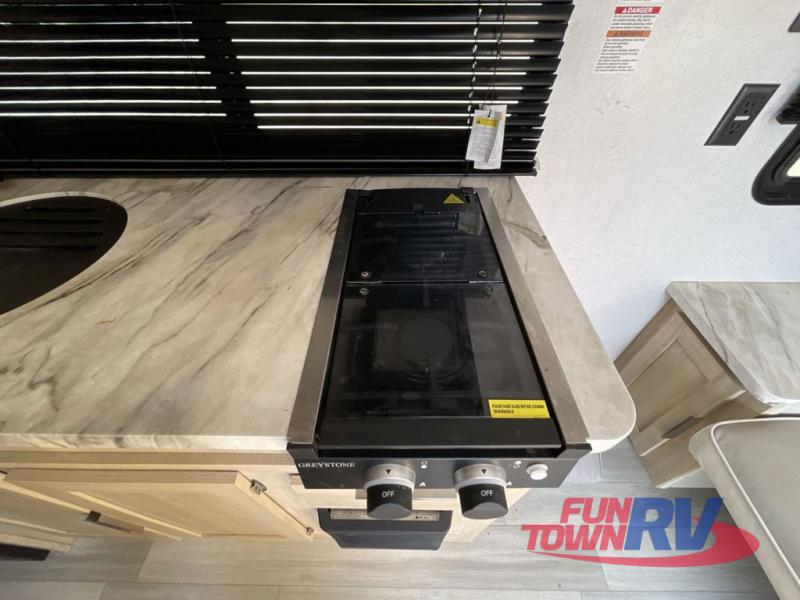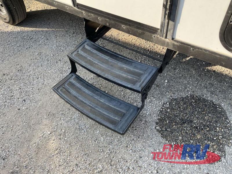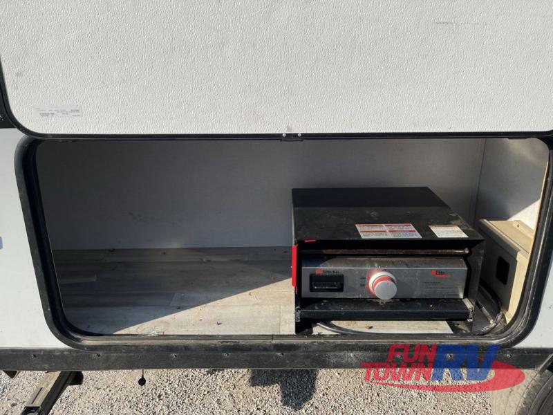 No need will go unmet with this travel trailer! It features a front Murphy bed that will double as seating and sleeping space, double-size bunk beds with storage, plus a booth dinette. You can prepare your best home cooked meals indoors with the two burner cooktop or head to the outside kitchen to fry up some burgers while breathing in some fresh air. You will also appreciate the outside shower and the front exterior full pass-through storage area for all your outdoor gear.