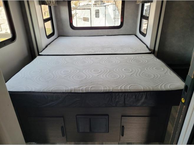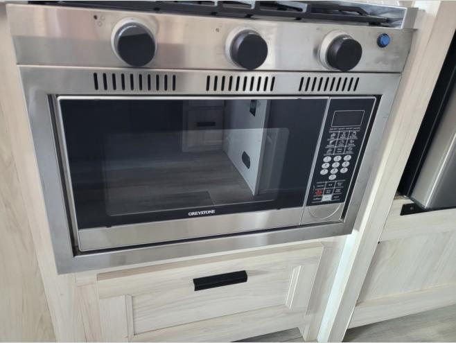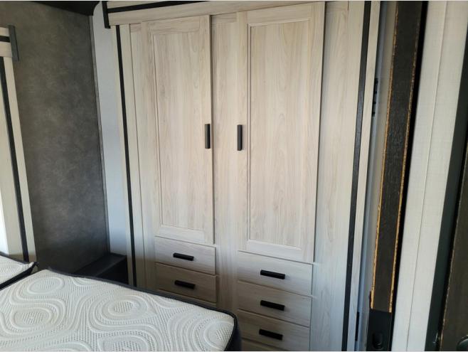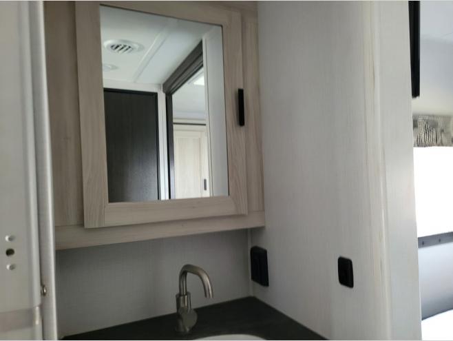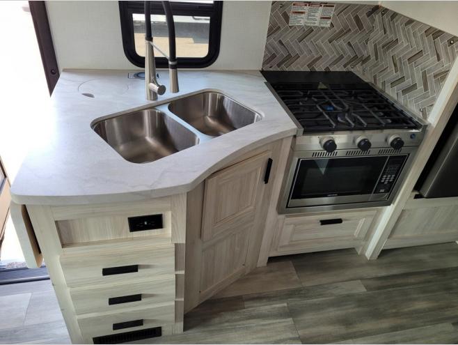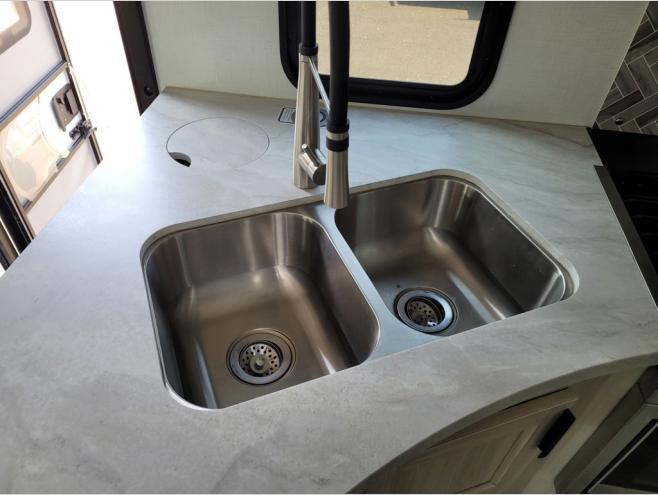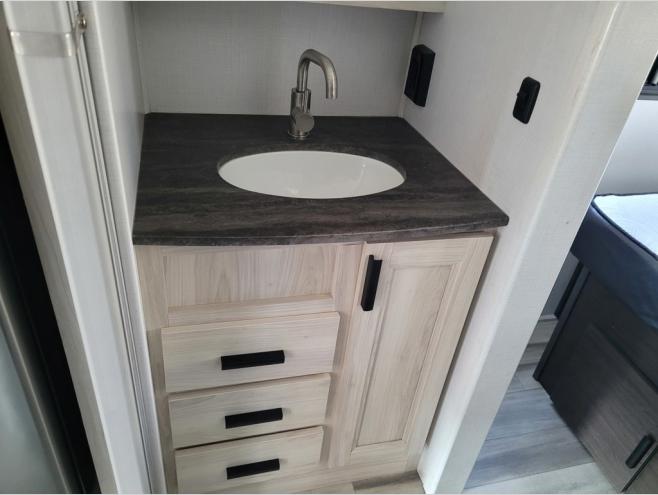 This Sunseeker Classic Class C gas motorhome has a rear private bedroom that holds the queen-size bed on a unique rear slide out. The bedroom also has its own 12V TV and wardrobe slide, so you have extra space without adding travel length. Another slide holds the U-shaped dinette out in the main living area, and you can watch the second LED TV out there. The separated bathroom has the toilet and 24" x 36" shower on one side of the coach and the medicine cabinet and sink on the other side. The kitchen has everything needed for a full weekend of delicious meals with the pantry, convection microwave, flip-up countertop, and 10.7-cubic foot refrigerator.