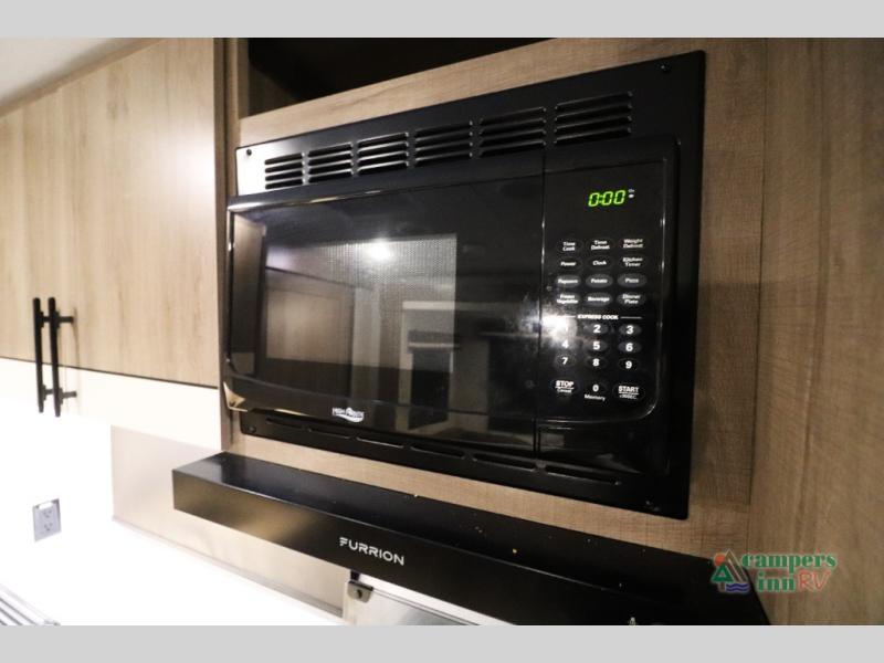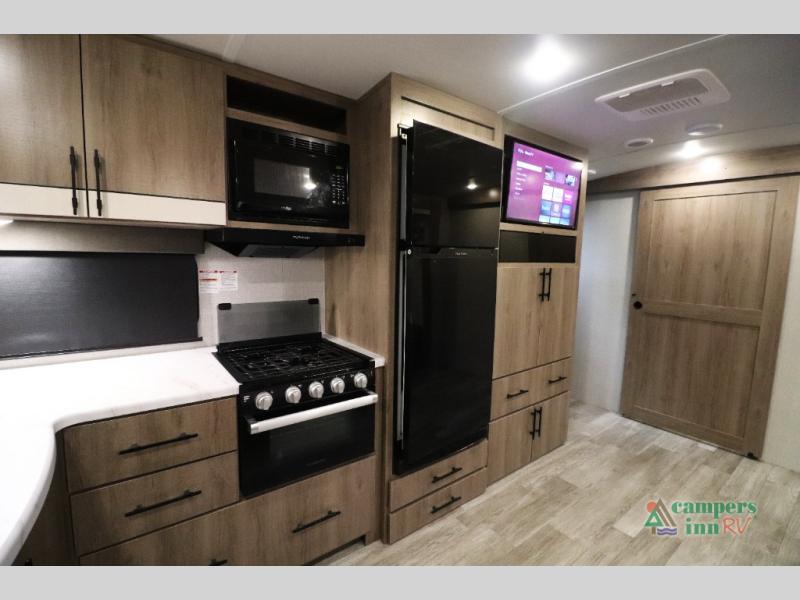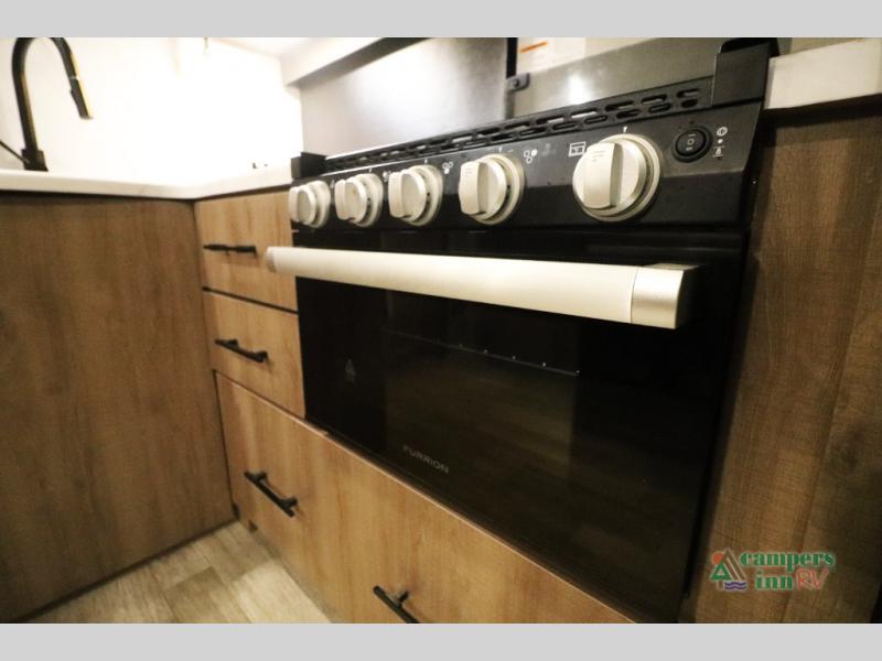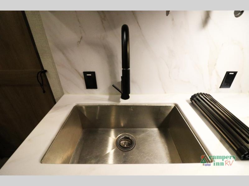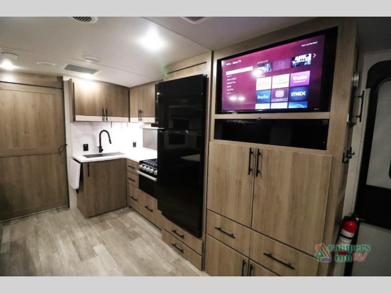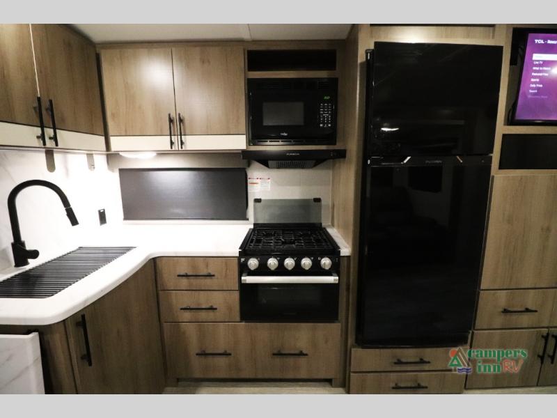 Modern Kitchen: Prepare meals with ease using the 3-burner range with oven, microwave, and a 12V 10 cu. ft. refrigerator, all complemented by residential countertops and a stainless steel sink.