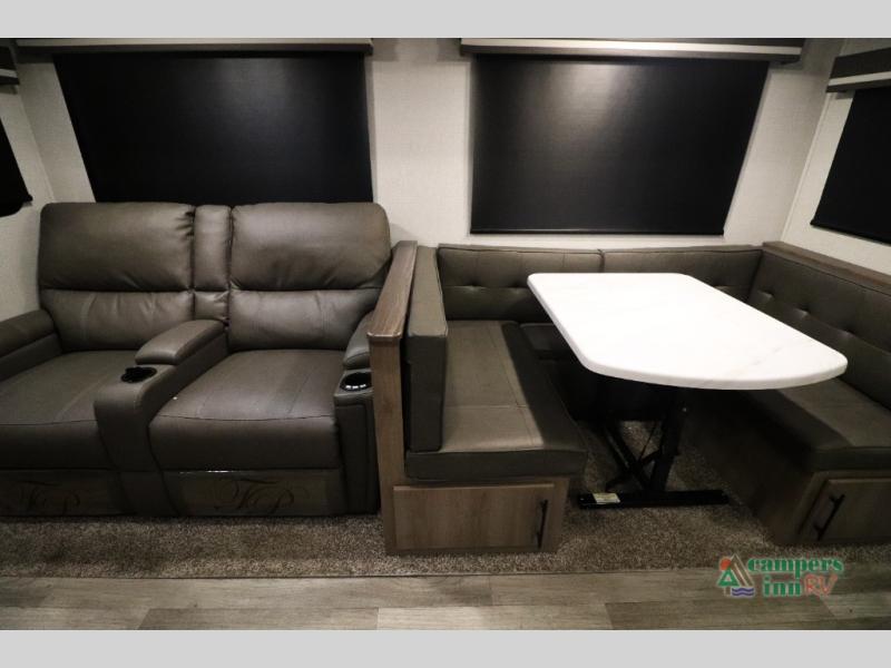 Comfortable Living Area: Unwind on upgraded residential furniture, including a tri-fold sofa and a U-shaped dinette, all illuminated by large panoramic windows.
