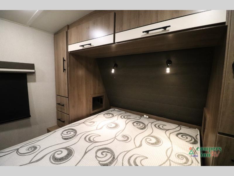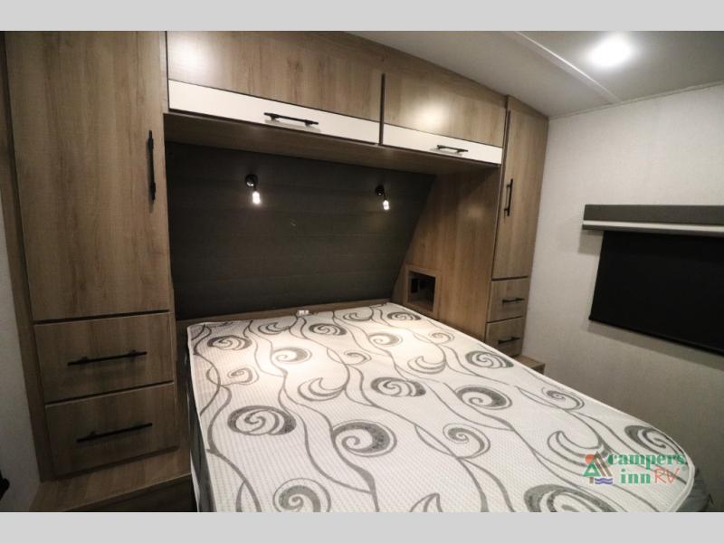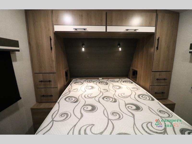 Master Suite: Relax in a private bedroom featuring a 60" x 80" queen bed, underbed storage with a sliding cargo tray, and built-in wardrobe cubby storage with USB-C charging stations and 110V outlets