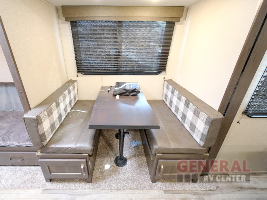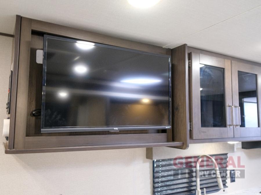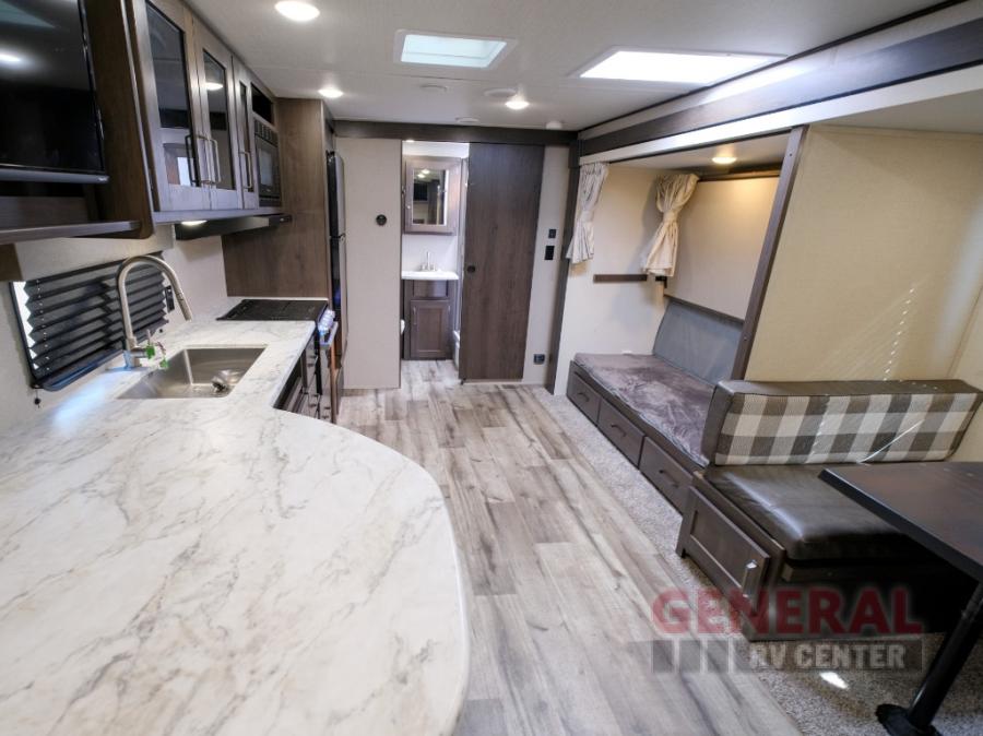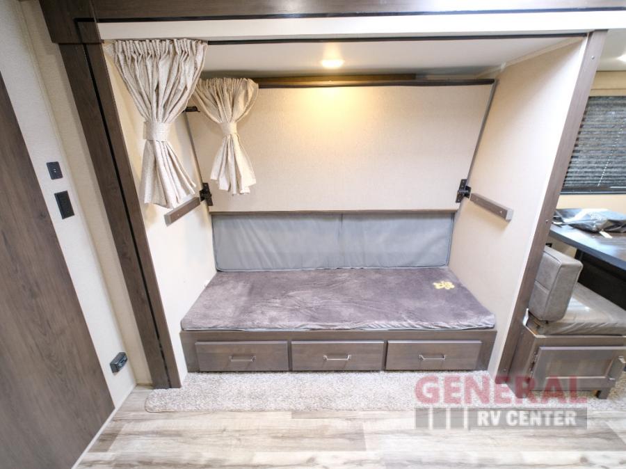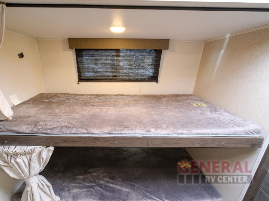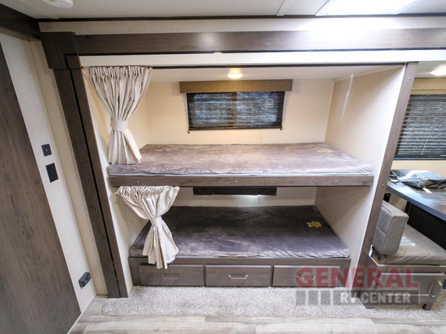 Camping trips in this travel trailer are fun for everyone. You will love the versatile queen Murphy bed up front that can fold away each morning; now you can relax on the sofa! There are bunk beds with drawers and a booth dinette within the large slide out. Everyone will stay entertained with having a 32" LED TV on board, or you can enjoy fresh air outdoors under the 19' power awning. There is even an outside kitchen here! And when you're ready to call it a night, you can clean up in the full rear bath that includes plenty of storage for all your necessities.