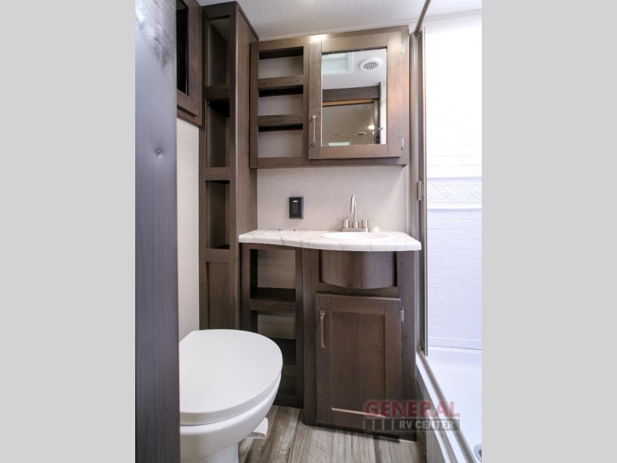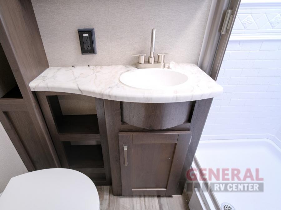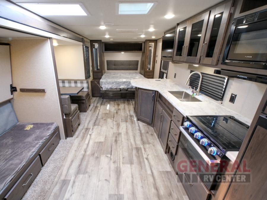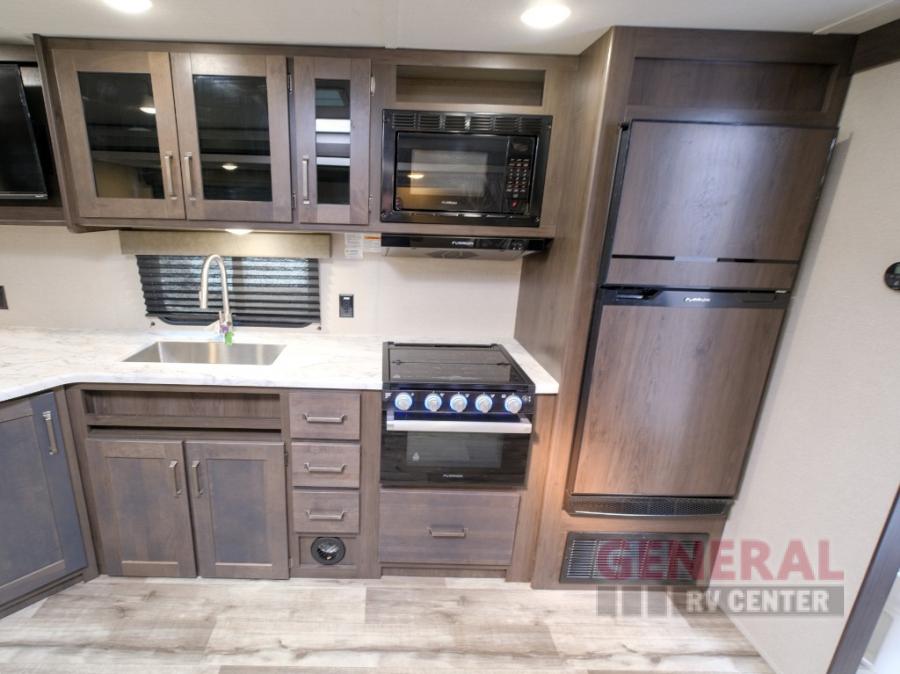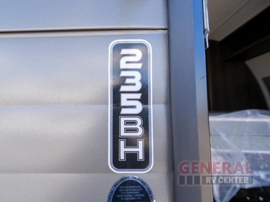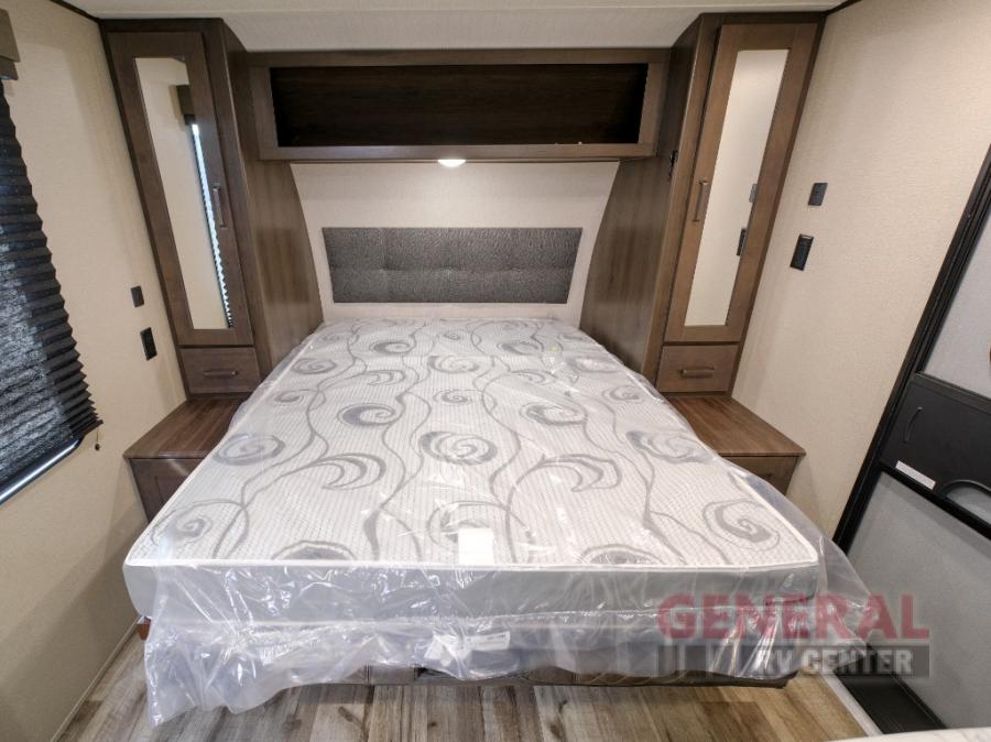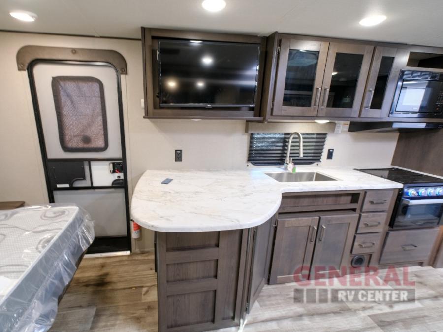 Camping trips in this travel trailer are fun for everyone. You will love the versatile queen Murphy bed up front that can fold away each morning; now you can relax on the sofa! There are bunk beds with drawers and a booth dinette within the large slide out. Everyone will stay entertained with having a 32" LED TV on board, or you can enjoy fresh air outdoors under the 19' power awning. There is even an outside kitchen here! And when you're ready to call it a night, you can clean up in the full rear bath that includes plenty of storage for all your necessities.