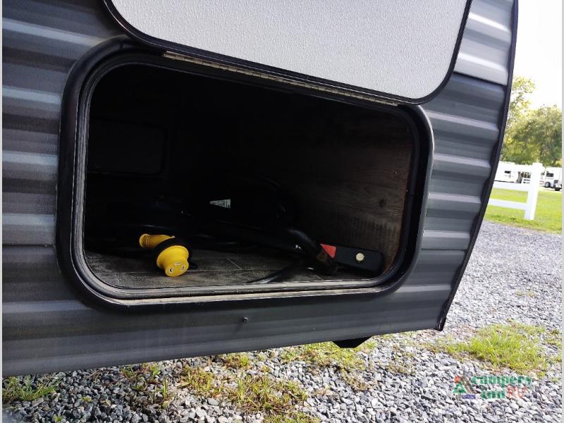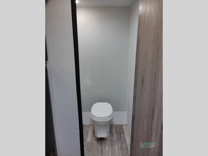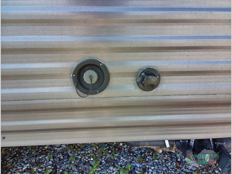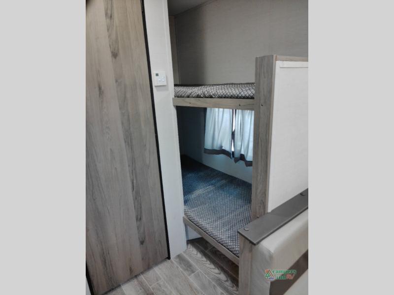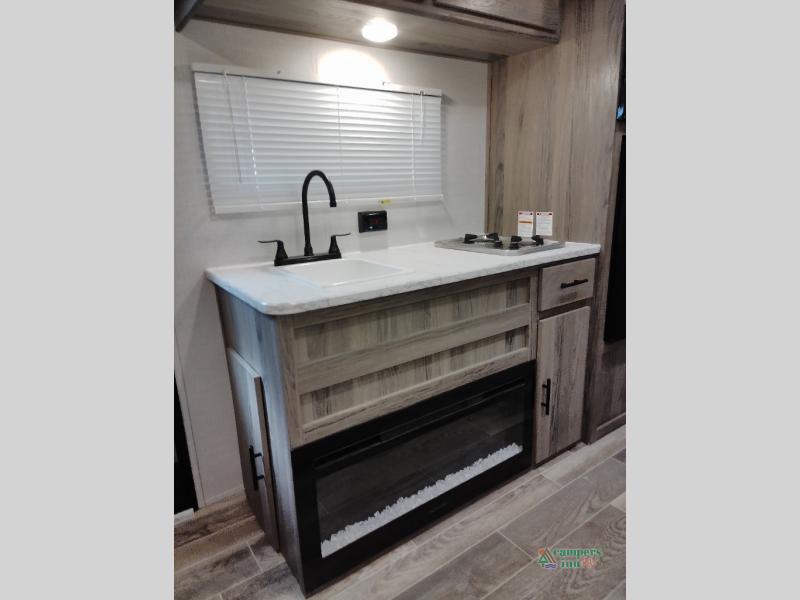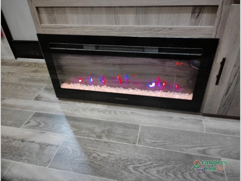 Your family or group of five will feel right at home in this cozy travel trailer. There is a front corner bed with a night stand for your things, bunk beds for the little ones, plus a booth dinette that can double as dining and sleeping space. The private toilet and shower will allow you to stay clean throughout your trip, and since the sink is in the kitchen, one camper can shower, while the other brushes their teeth. You'll find everything you need to prepare meals each day, including a two burner cooktop, a microwave oven, plus an electric refrigerator for perishables. This model also includes a fireplace for a more at-home, cozy feel!