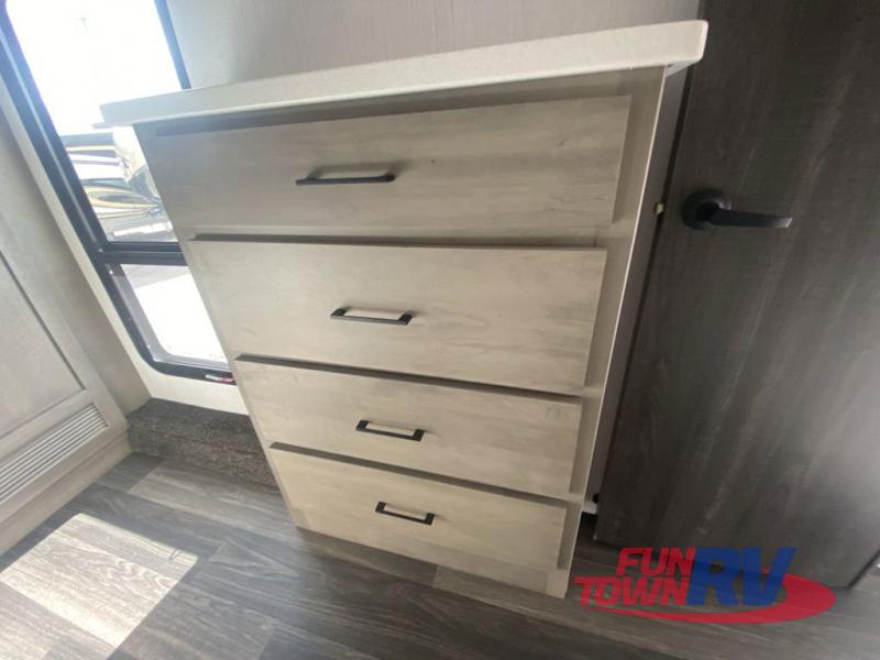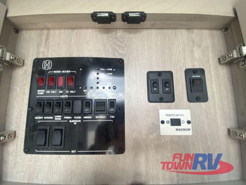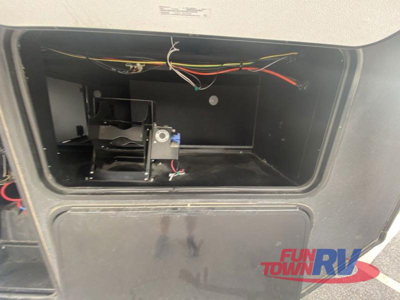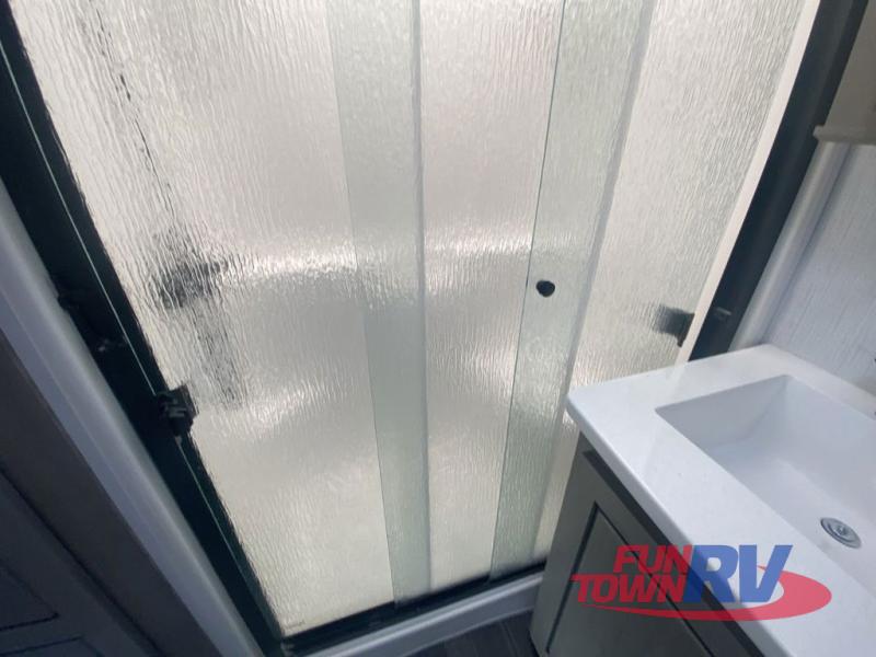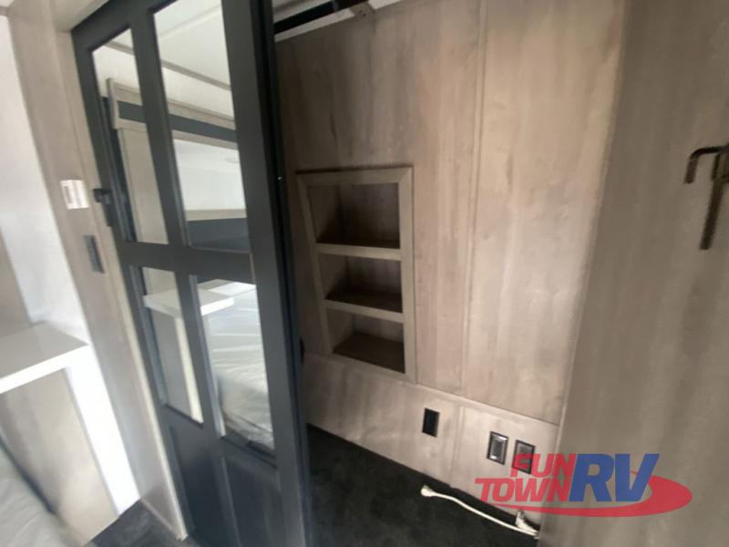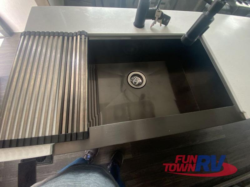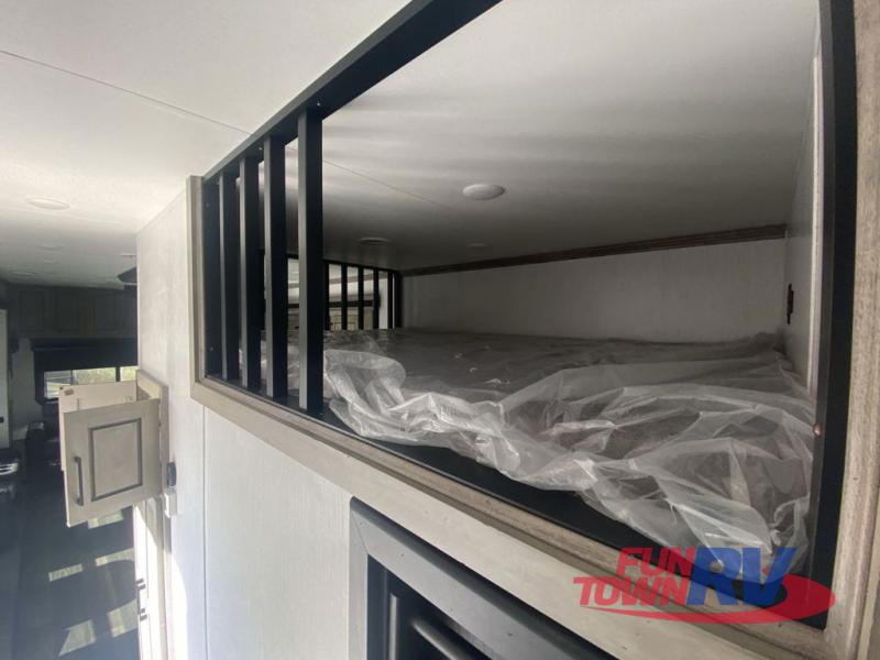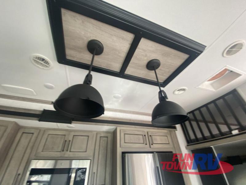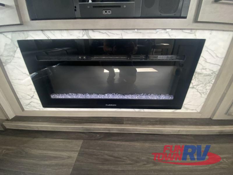 When you travel to see new places and sometimes have to work while away, this fifth wheel gives you a private office with a desk that can also be utilize as a second living area and bedroom thanks to the sofa slide and storage. There is a loft above for more sleeping space and storage that can be accessed using the ladder in the hallway. The double entry bathroom is convenient, and the front bedroom offers a king bed slide, lots of clothing storage, plus a space prepped for a washer/dryer option. The main living and kitchen area is spacious as well with dual slides, and you can relax on the tri-fold sleeper sofa or in the theater seats with heat and massage. There is also a 55" big screen TV and a built-in 40" electric fireplace to add more coziness. The cook will love the stainless steel appliances, the farm style sink, the full-size pantry and being able to dine at the free-standing dinette.
