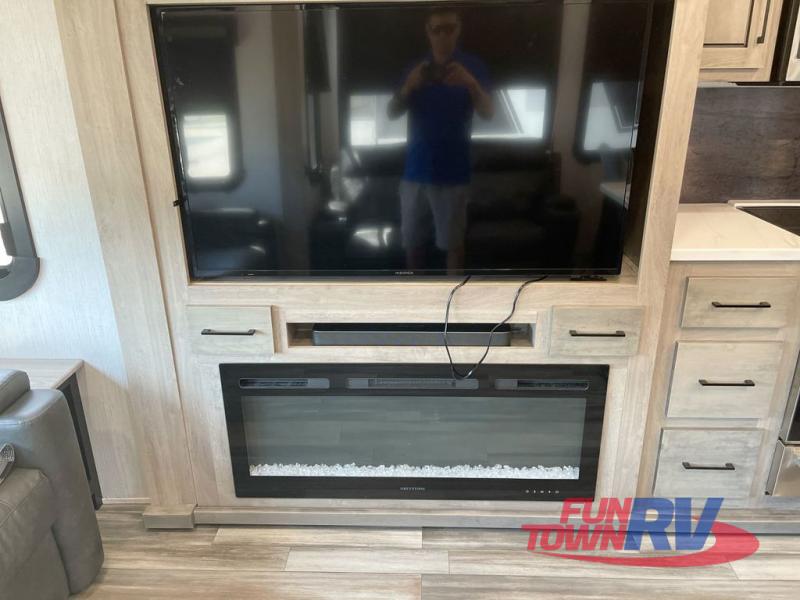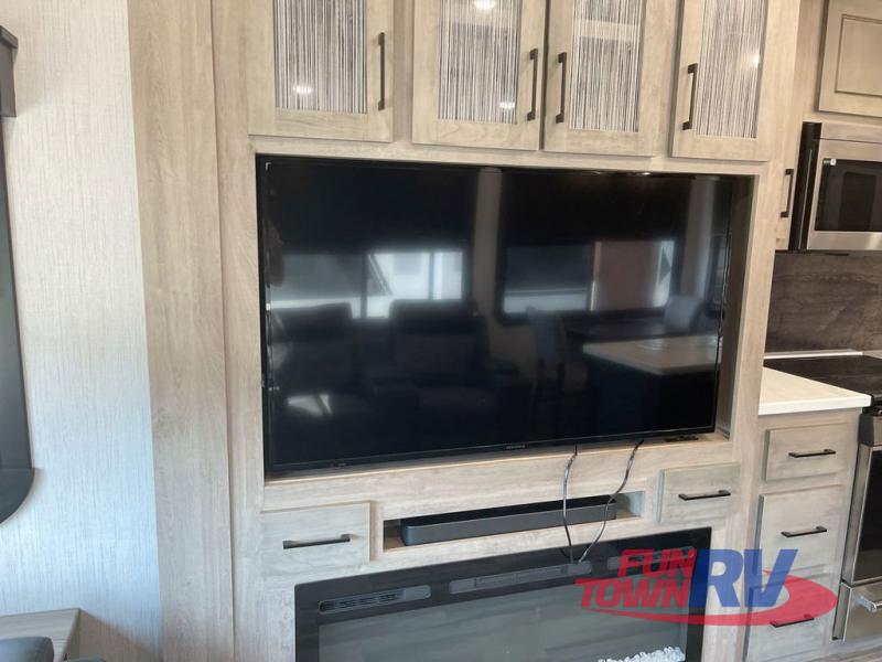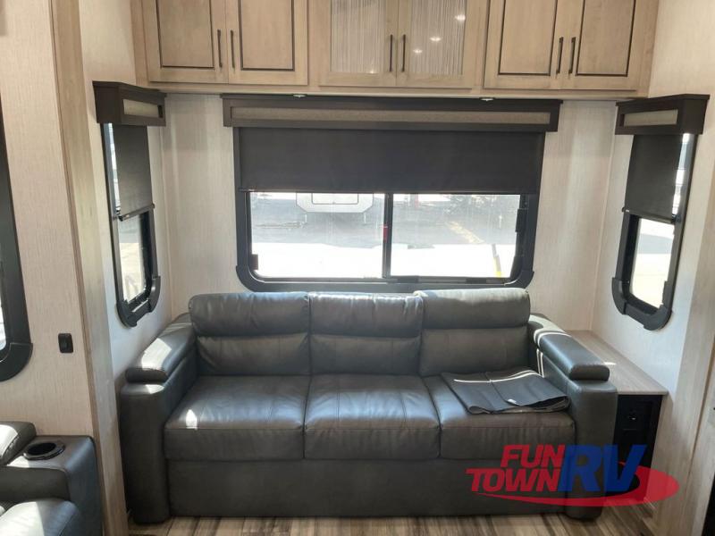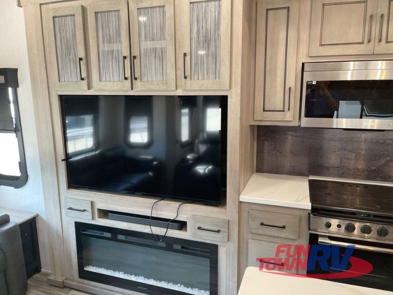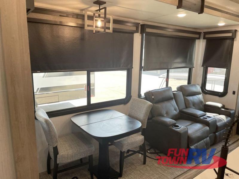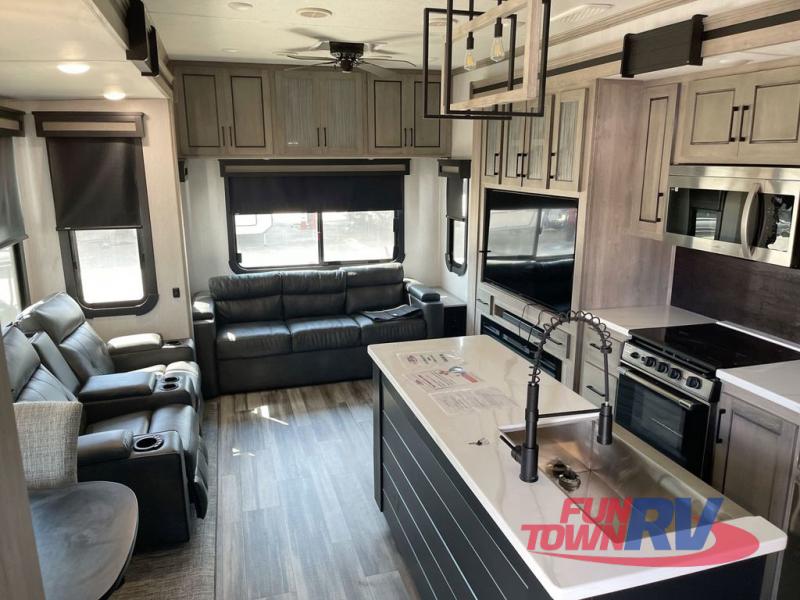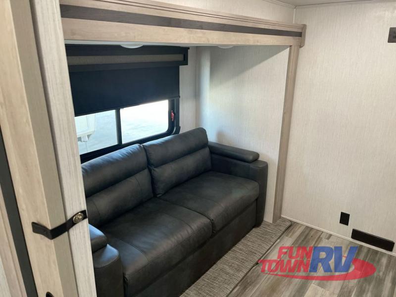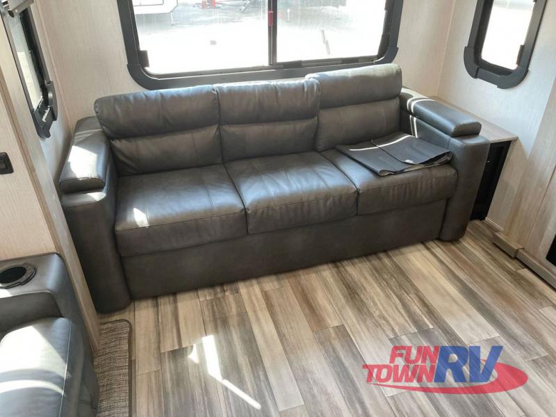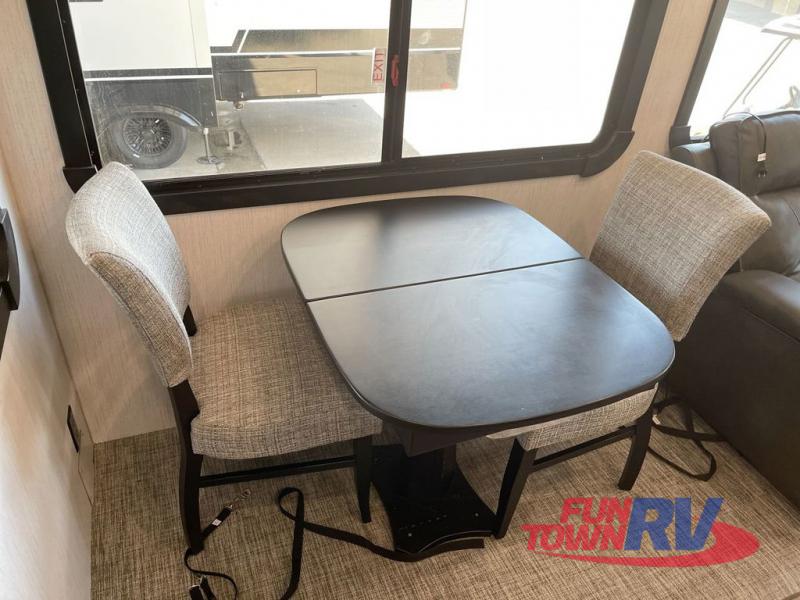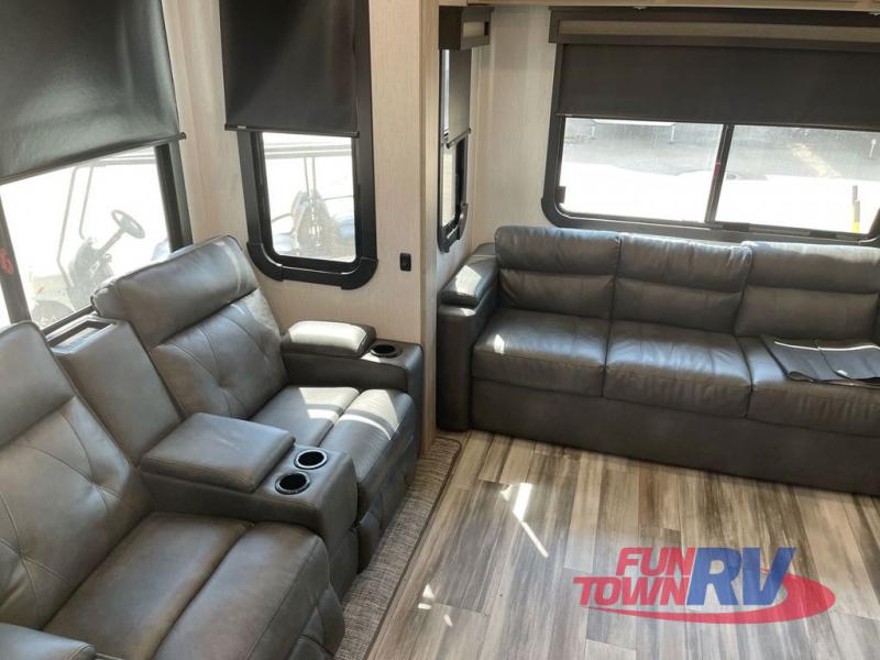 This fifth wheel is big enough for the whole family to join in on the fun at the campground! There is not only a front private bedroom with a king bed slide and a closet prepped to add an optional washer and dryer, but also a second bedroom with a loft above a sofa, a desk, and a wardrobe. The dual entry bathroom is easy for everyone to access especially those staying in the front bedroom. Meal prepping is made easy with a kitchen island and with a four burner cooktop you can cook more at one time. There is a two chair free standing dinette to enjoy your meals and once you are full you can head to the rear sofa or the power theater seating to relax while you watch the 40" electric fireplace and 55" big screen TV!
