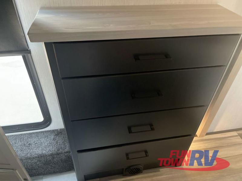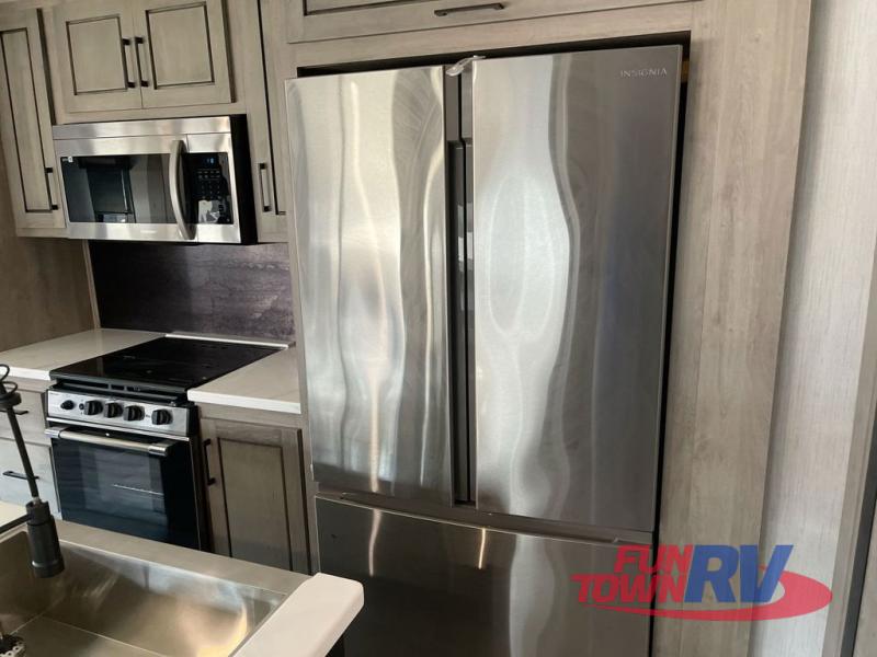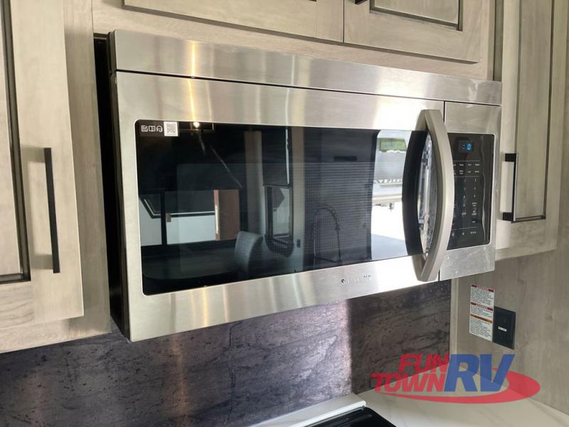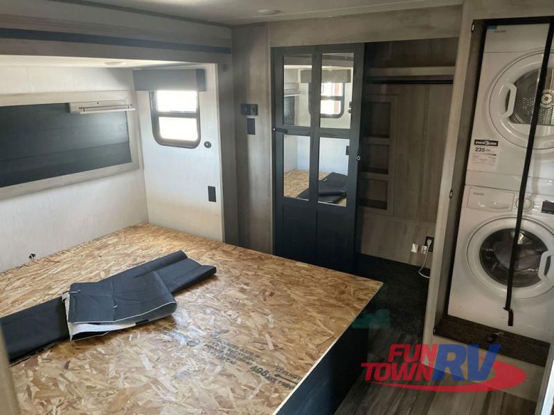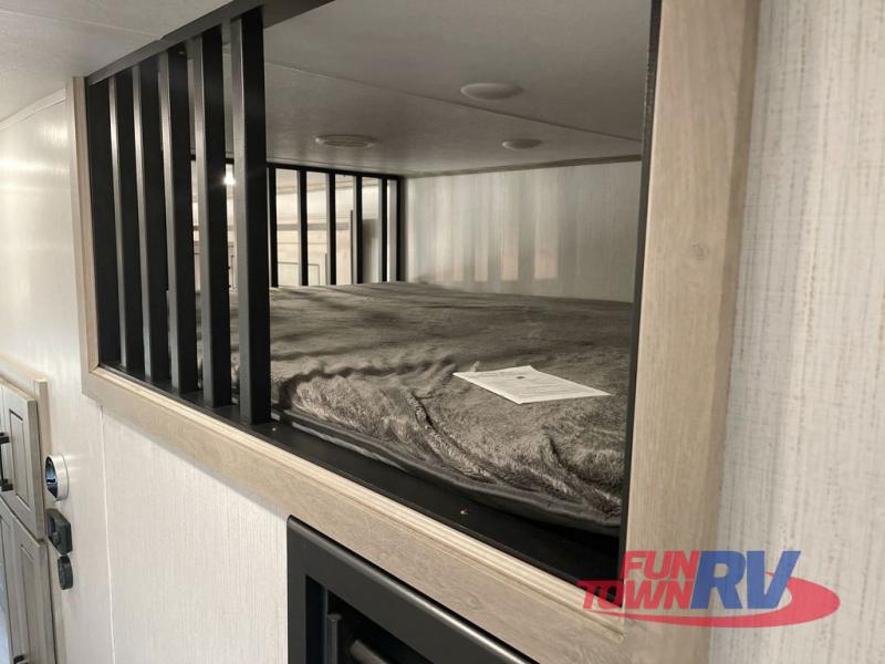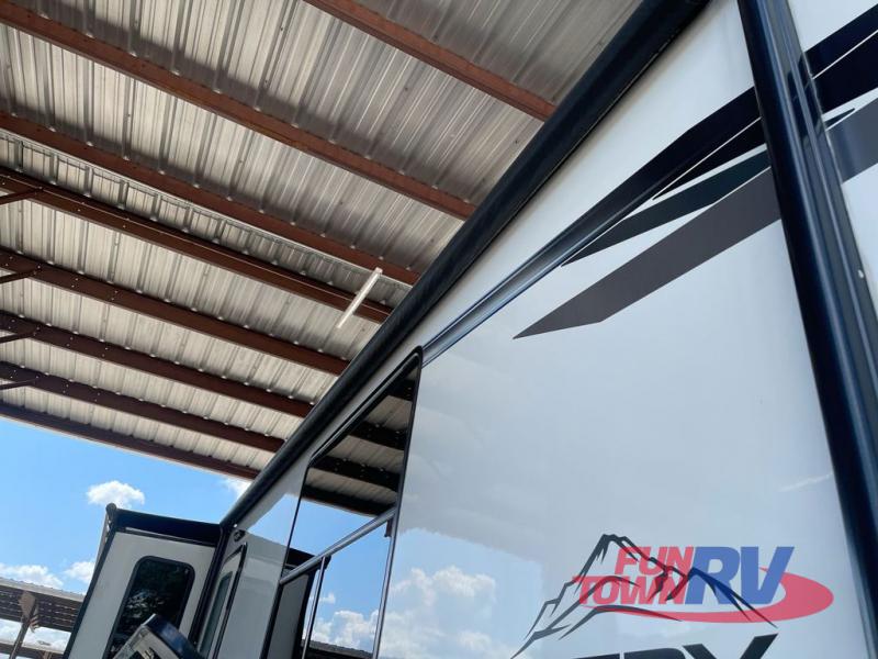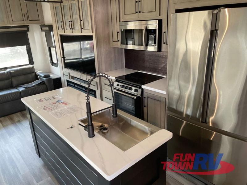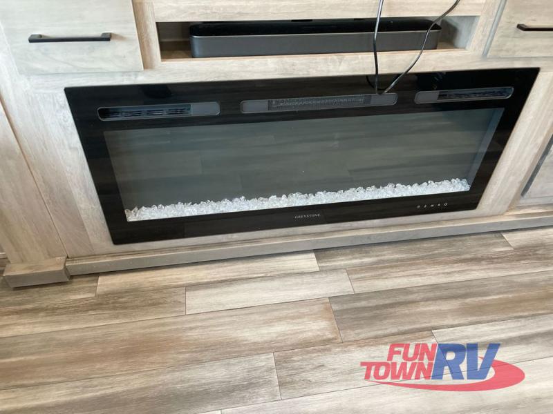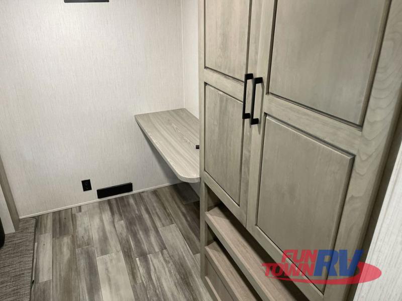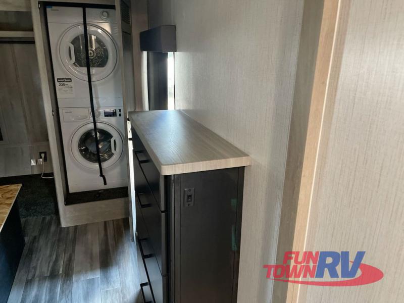 This fifth wheel is big enough for the whole family to join in on the fun at the campground! There is not only a front private bedroom with a king bed slide and a closet prepped to add an optional washer and dryer, but also a second bedroom with a loft above a sofa, a desk, and a wardrobe. The dual entry bathroom is easy for everyone to access especially those staying in the front bedroom. Meal prepping is made easy with a kitchen island and with a four burner cooktop you can cook more at one time. There is a two chair free standing dinette to enjoy your meals and once you are full you can head to the rear sofa or the power theater seating to relax while you watch the 40" electric fireplace and 55" big screen TV!