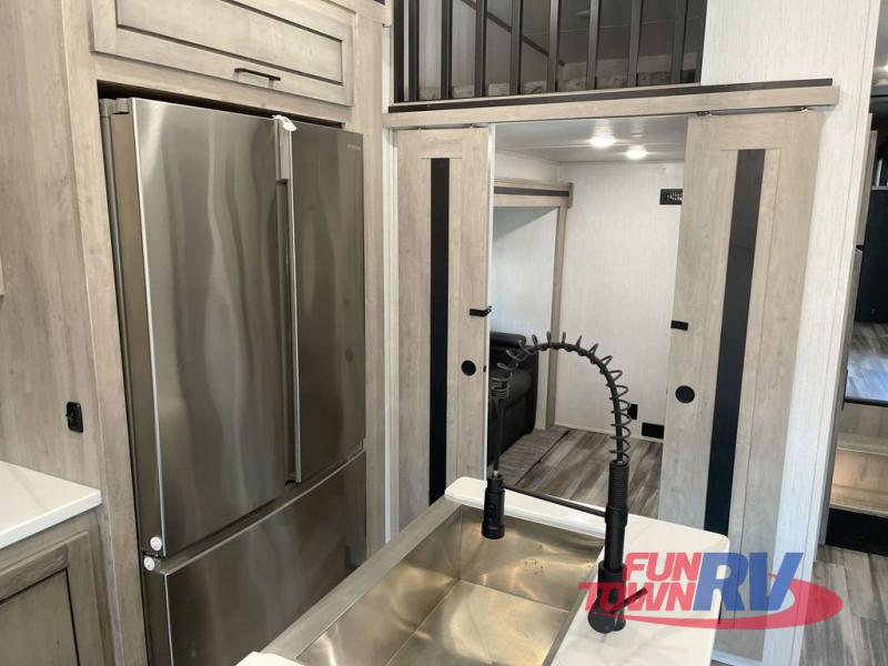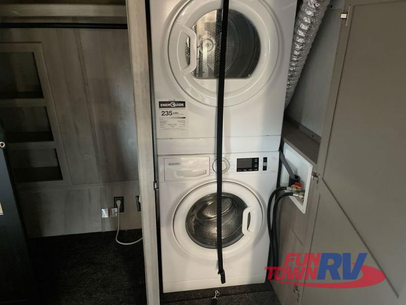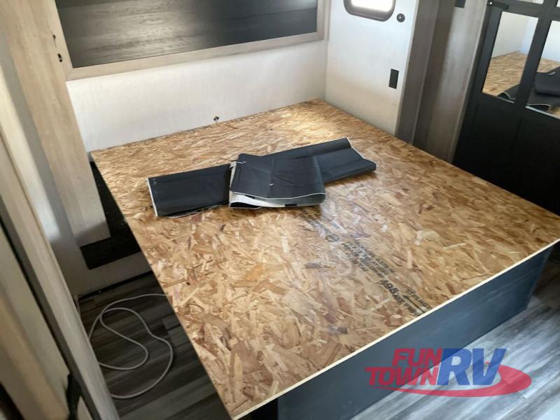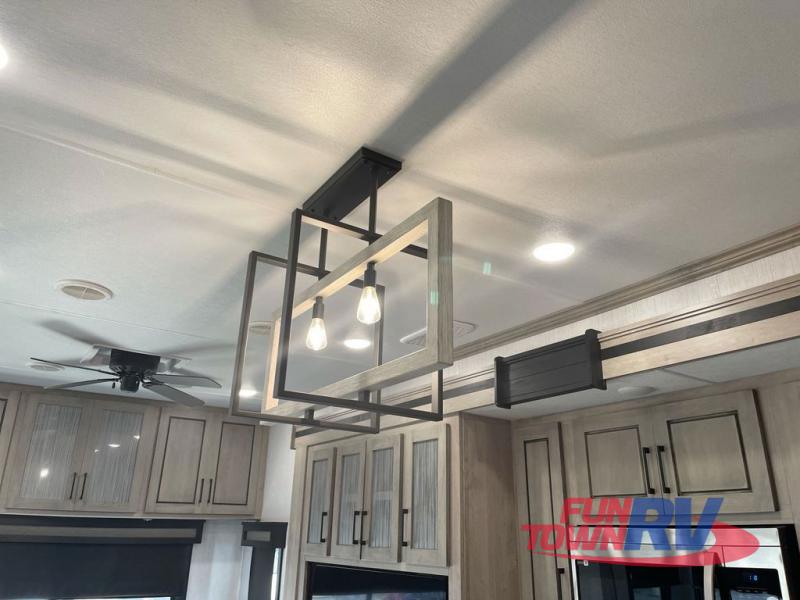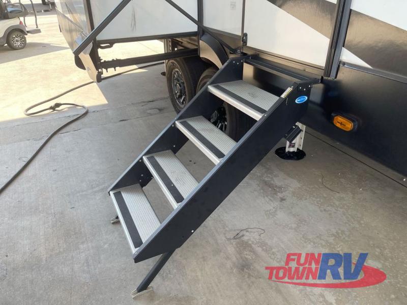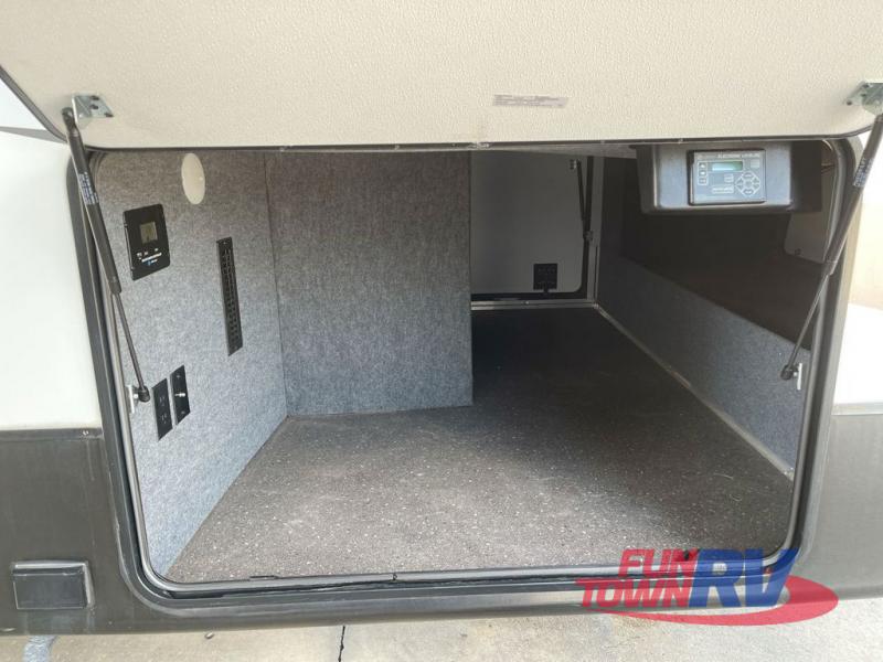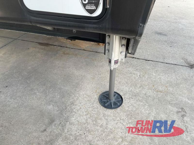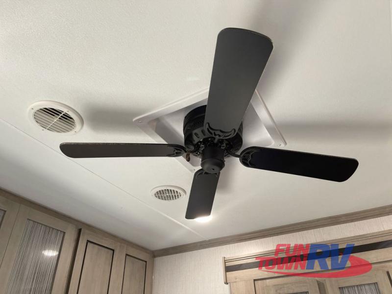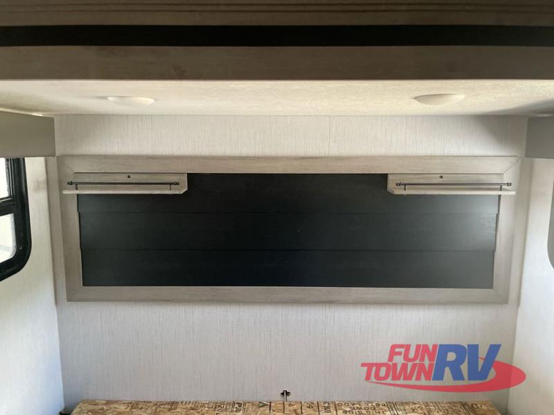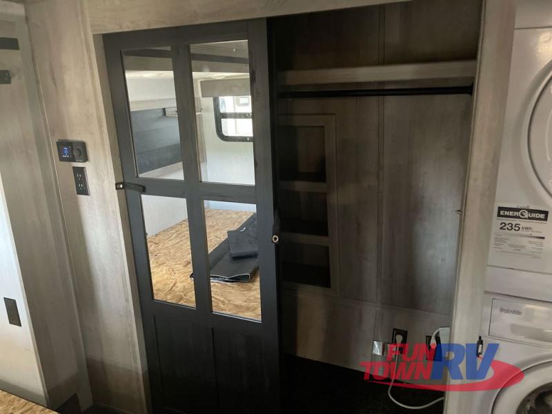 This fifth wheel is big enough for the whole family to join in on the fun at the campground! There is not only a front private bedroom with a king bed slide and a closet prepped to add an optional washer and dryer, but also a second bedroom with a loft above a sofa, a desk, and a wardrobe. The dual entry bathroom is easy for everyone to access especially those staying in the front bedroom. Meal prepping is made easy with a kitchen island and with a four burner cooktop you can cook more at one time. There is a two chair free standing dinette to enjoy your meals and once you are full you can head to the rear sofa or the power theater seating to relax while you watch the 40" electric fireplace and 55" big screen TV!