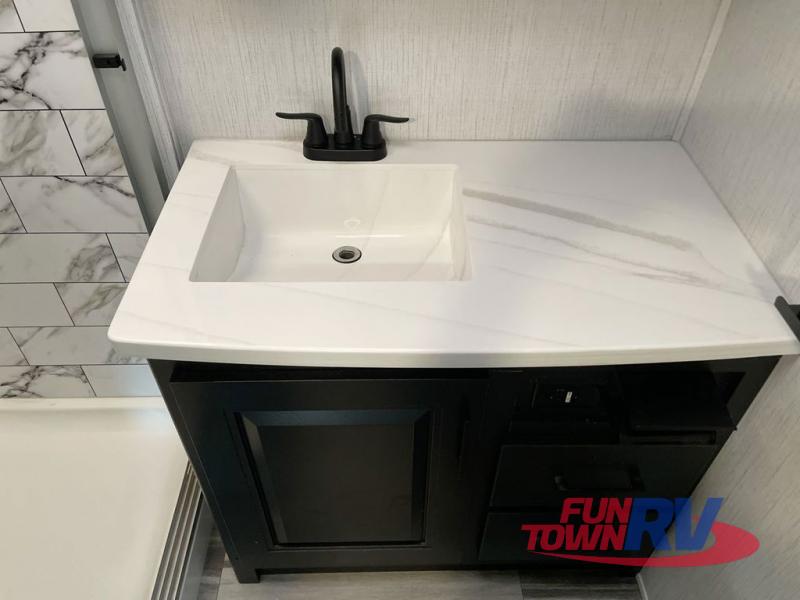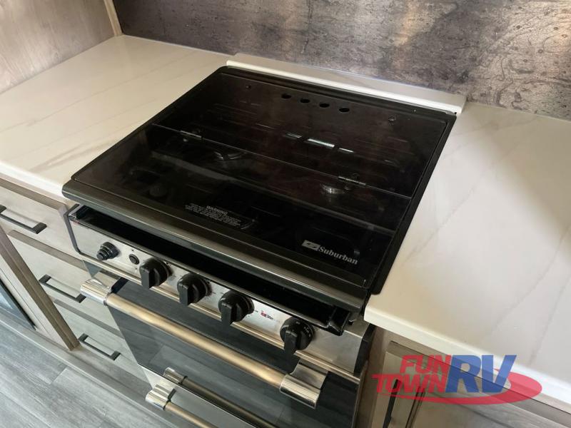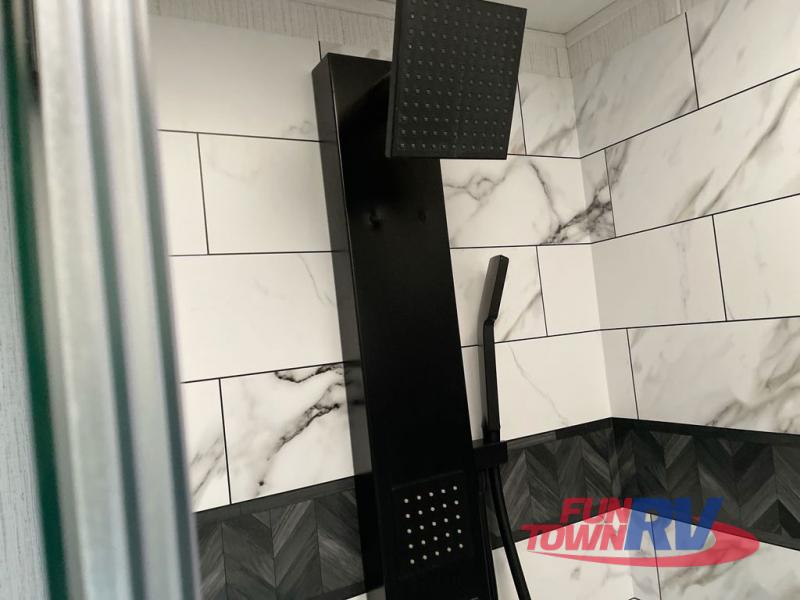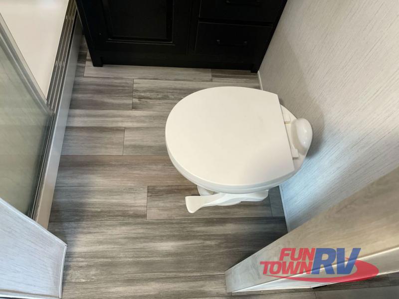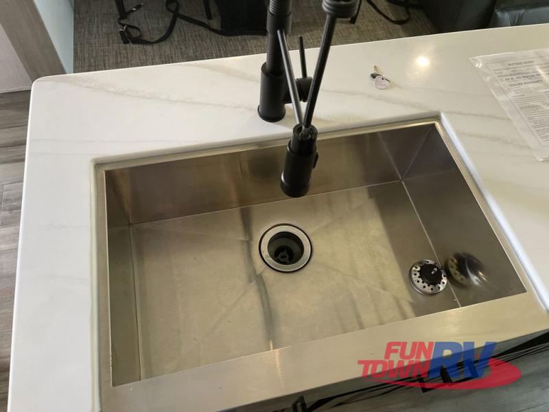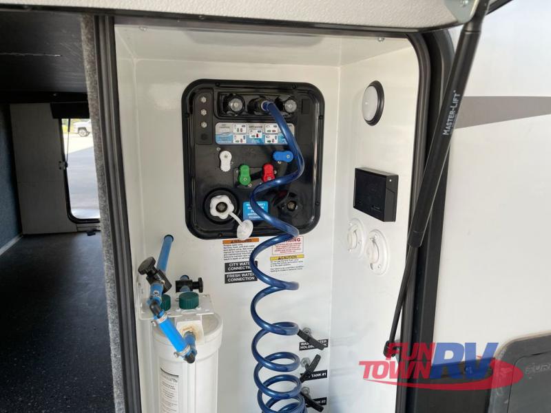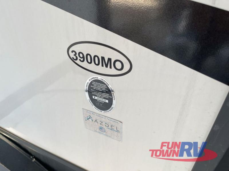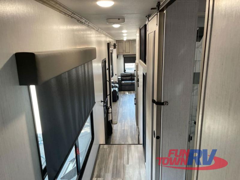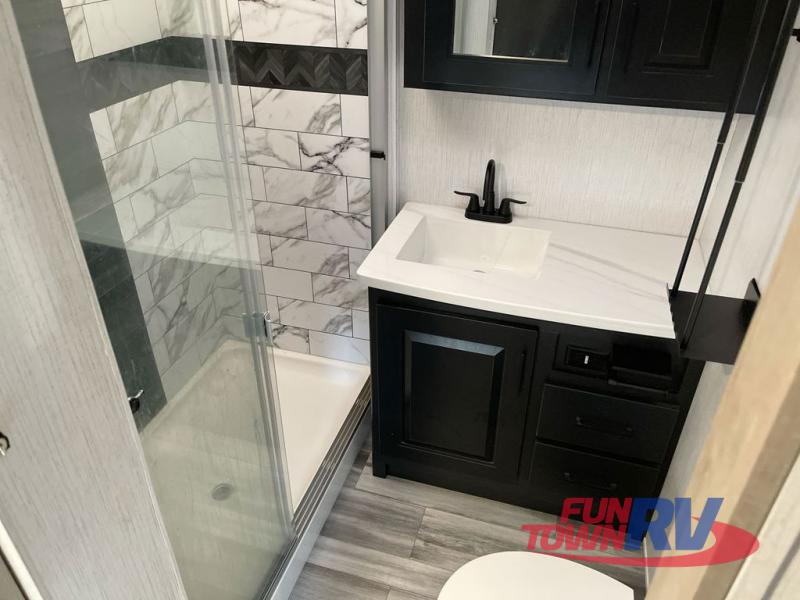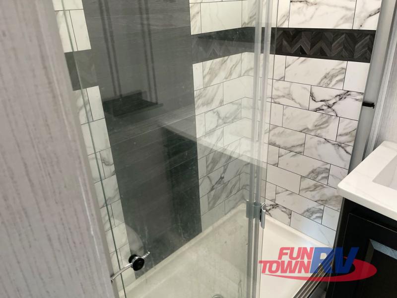 This fifth wheel is big enough for the whole family to join in on the fun at the campground! There is not only a front private bedroom with a king bed slide and a closet prepped to add an optional washer and dryer, but also a second bedroom with a loft above a sofa, a desk, and a wardrobe. The dual entry bathroom is easy for everyone to access especially those staying in the front bedroom. Meal prepping is made easy with a kitchen island and with a four burner cooktop you can cook more at one time. There is a two chair free standing dinette to enjoy your meals and once you are full you can head to the rear sofa or the power theater seating to relax while you watch the 40" electric fireplace and 55" big screen TV!