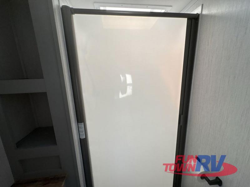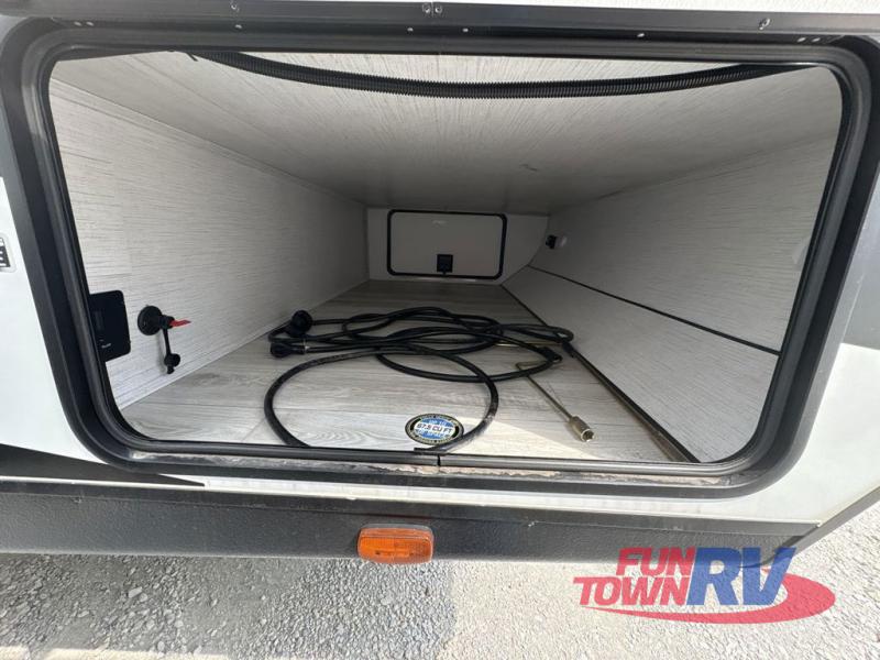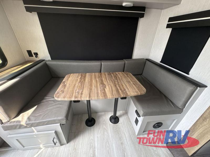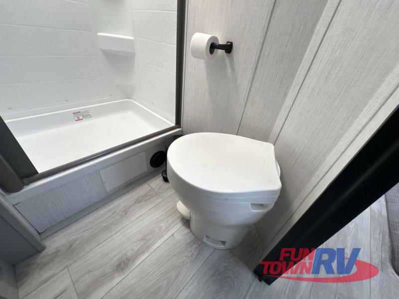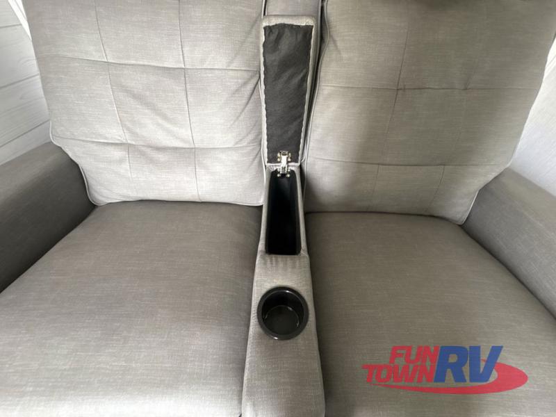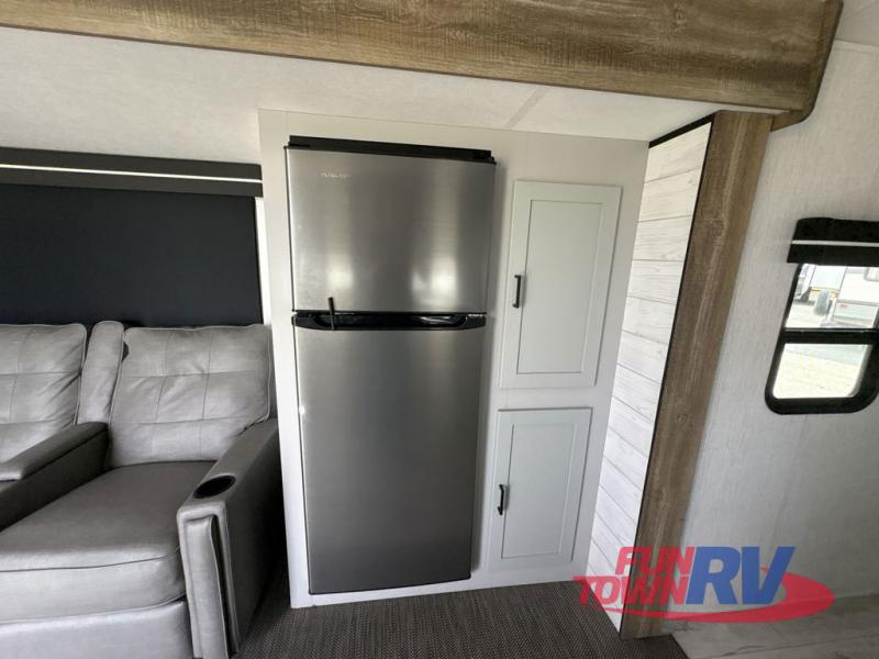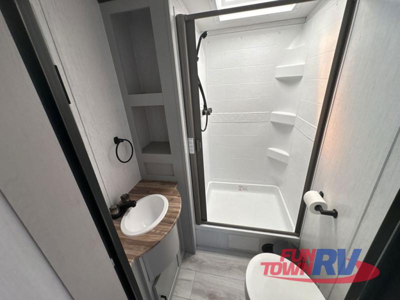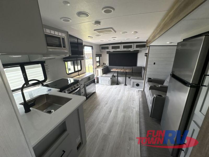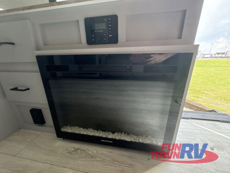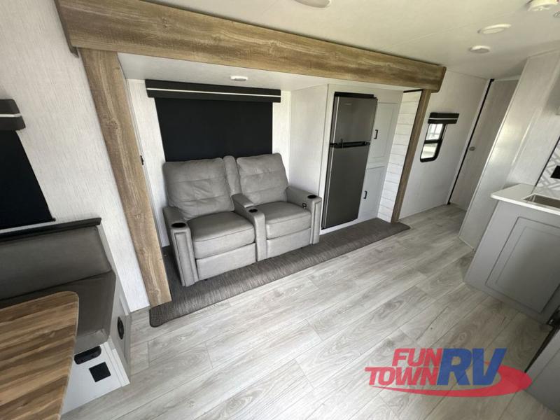 You and your spouse will love camping in this travel trailer! It features a front private bedroom with a king bed to lay your head on at night. Freshen up each morning in the full bathroom with a shower that has a skylight above to bring the outdoors inside. The chef can prepare their best home cooked meals with the four burner cooktop, conventional oven, and 10.7 cu. ft. refrigerator. Enjoy all of your meals and play games at the rear U-shaped dinette, plus it can transform into an extra sleeping space for an extra guest or two depending on their size. With theater seating and an entertainment center with a fireplace, you can have a truly relaxing evening indoors!