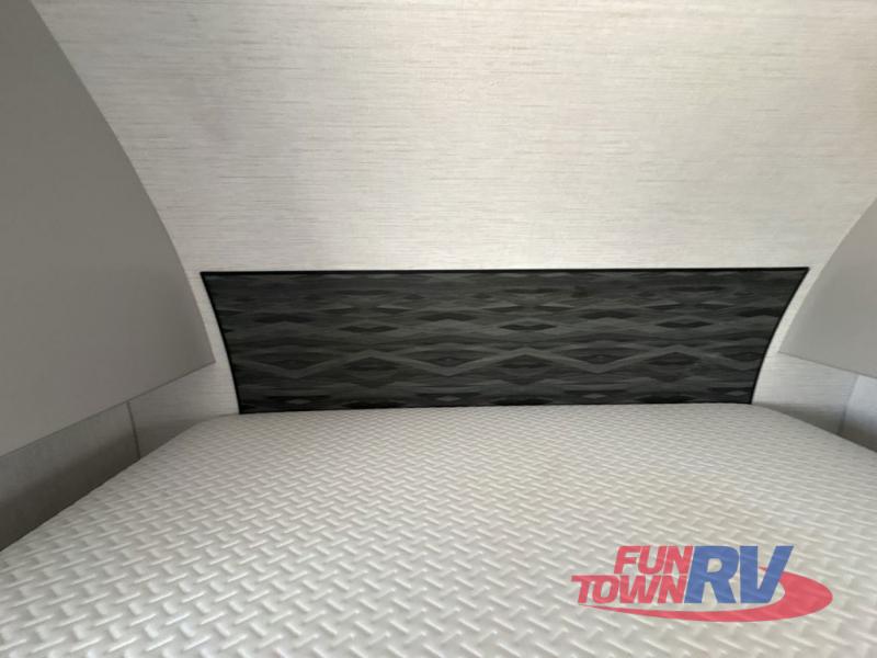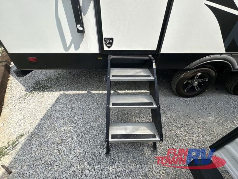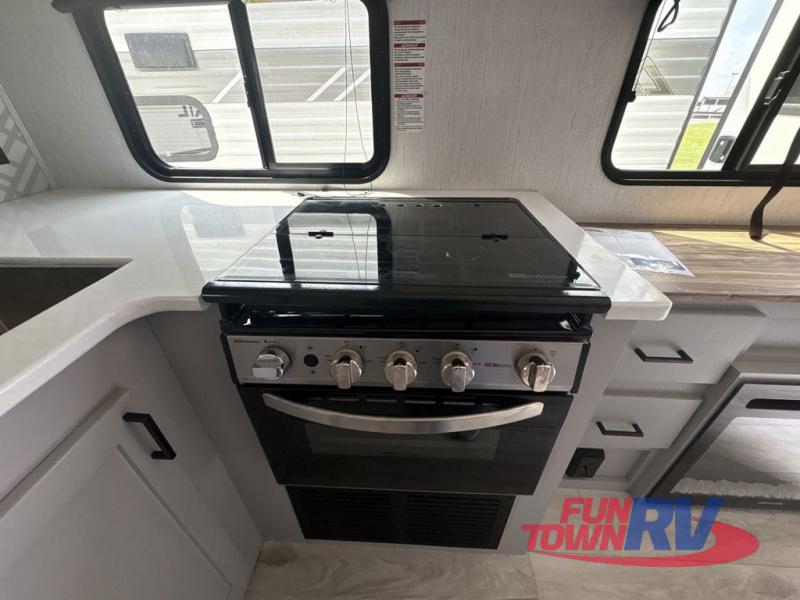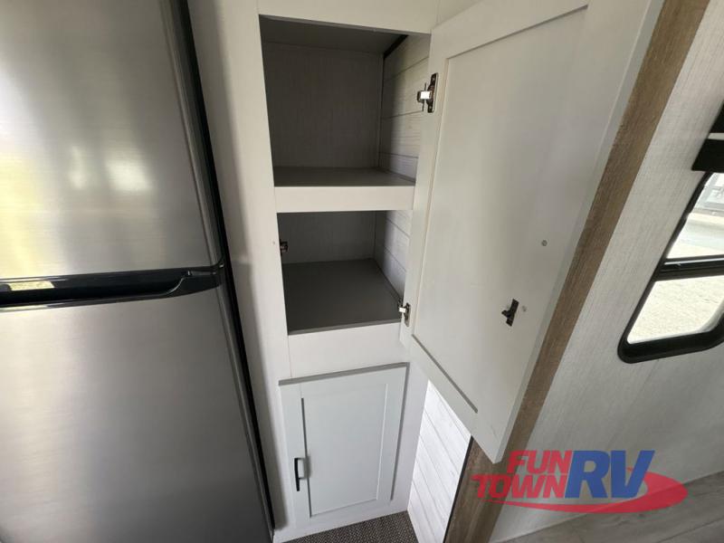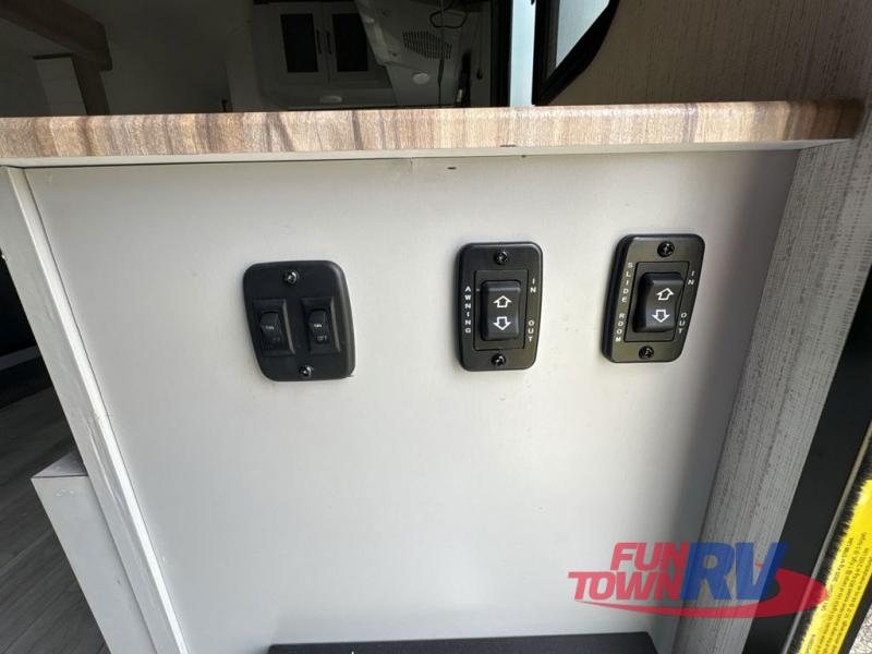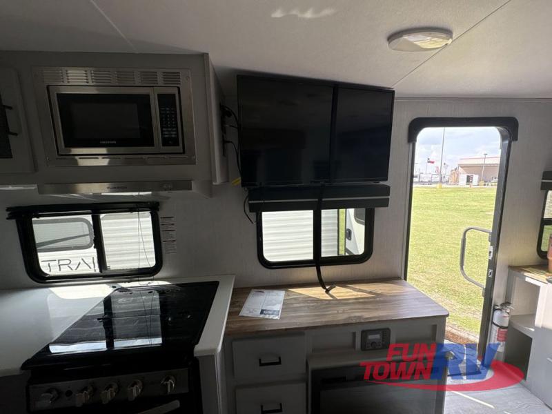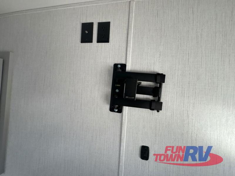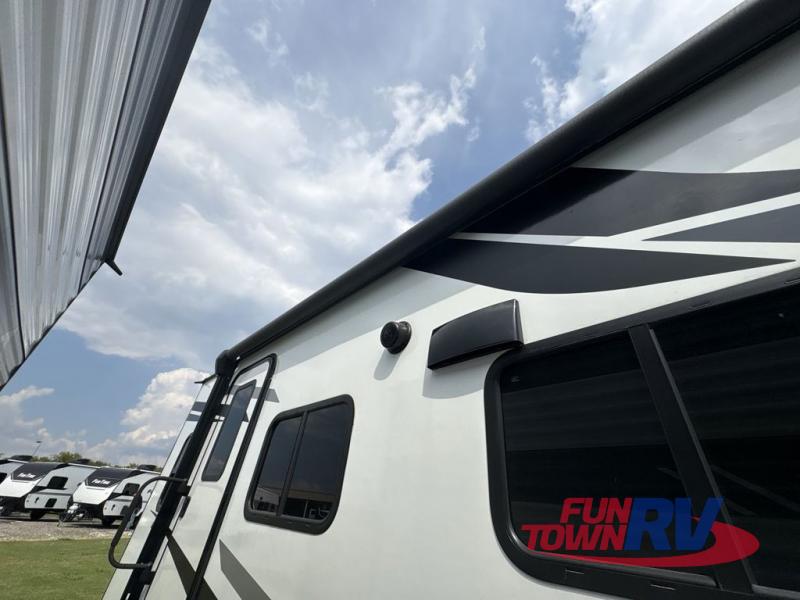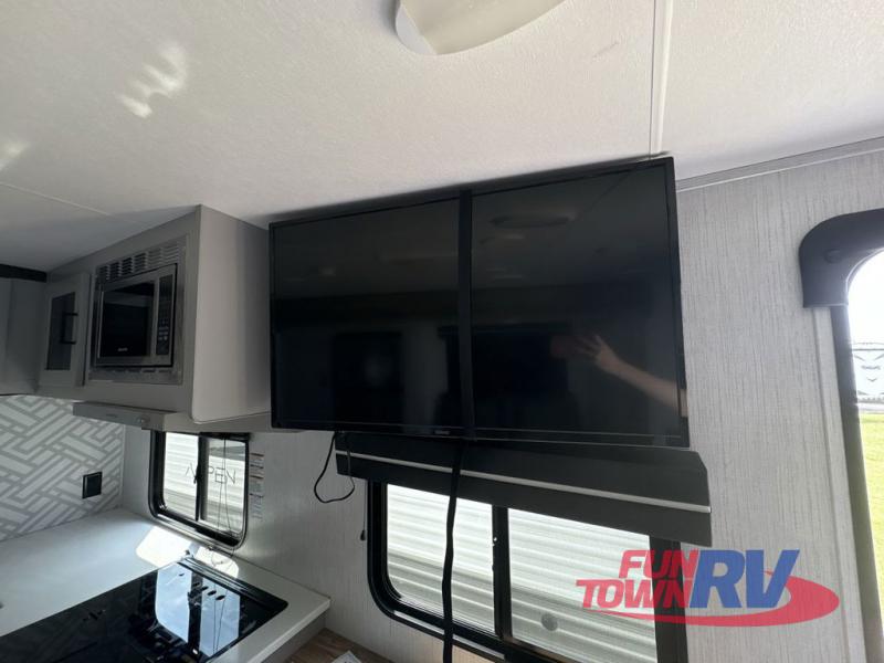 You and your spouse will love camping in this travel trailer! It features a front private bedroom with a king bed to lay your head on at night. Freshen up each morning in the full bathroom with a shower that has a skylight above to bring the outdoors inside. The chef can prepare their best home cooked meals with the four burner cooktop, conventional oven, and 10.7 cu. ft. refrigerator. Enjoy all of your meals and play games at the rear U-shaped dinette, plus it can transform into an extra sleeping space for an extra guest or two depending on their size. With theater seating and an entertainment center with a fireplace, you can have a truly relaxing evening indoors!