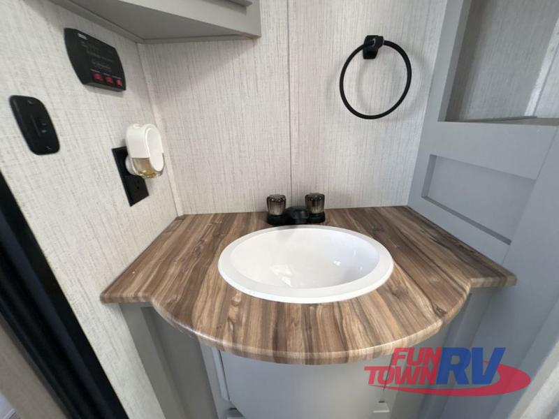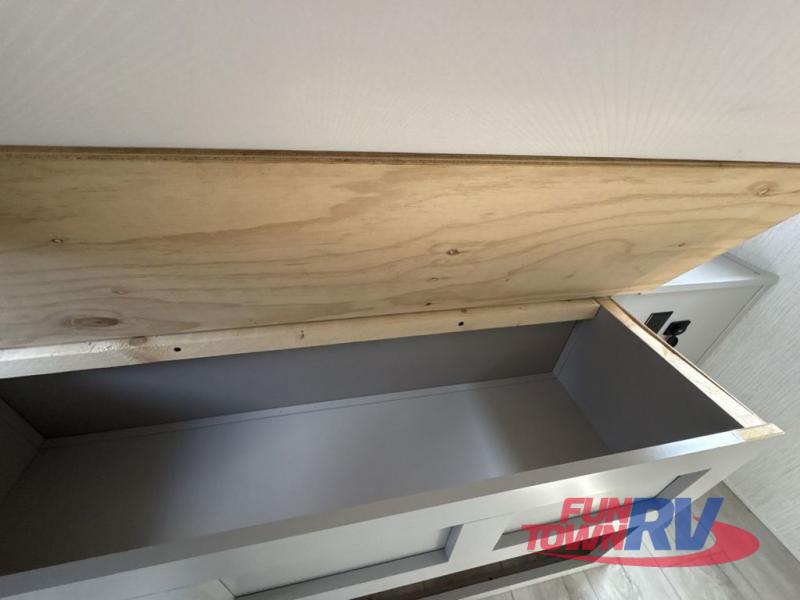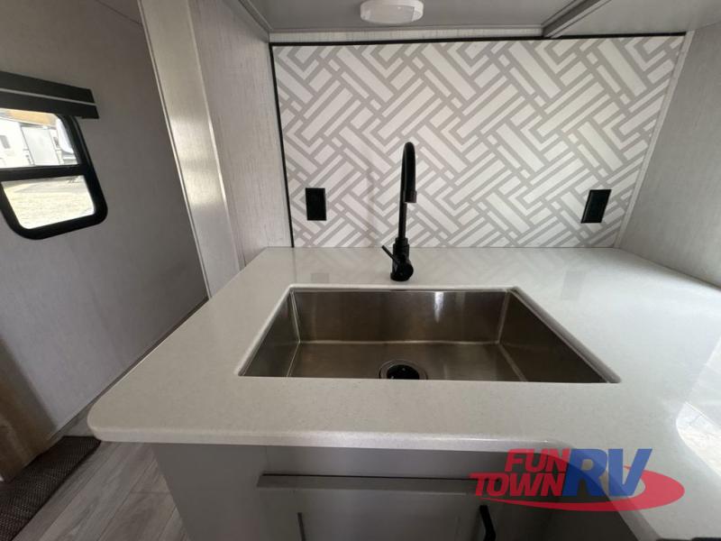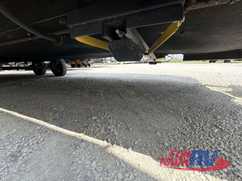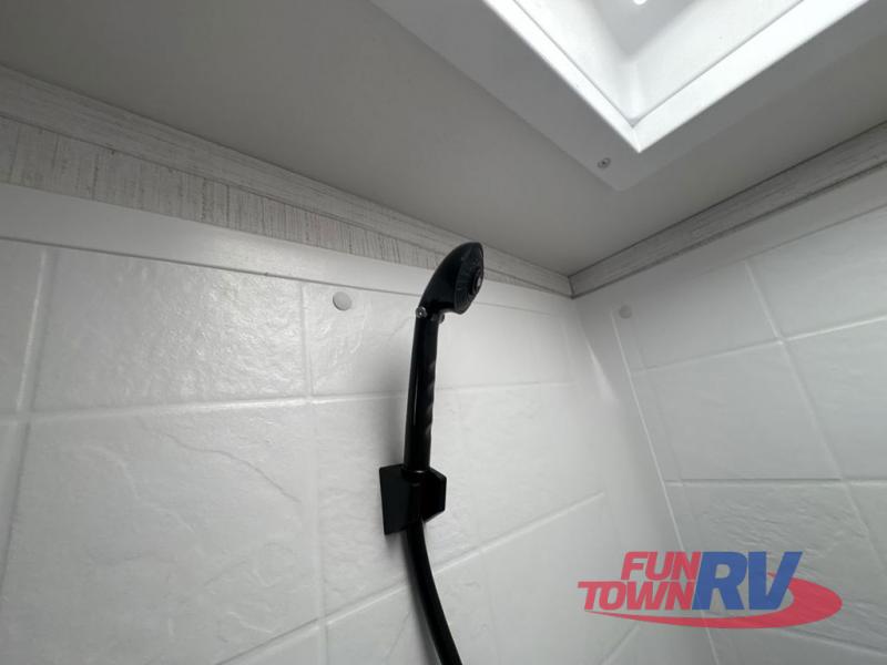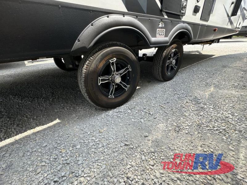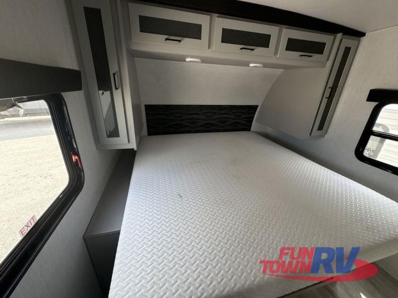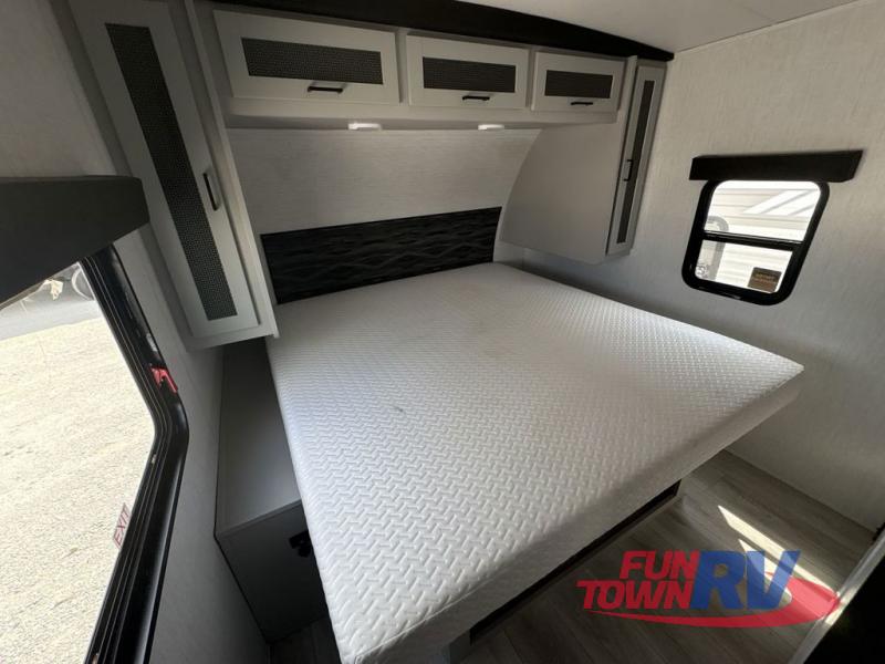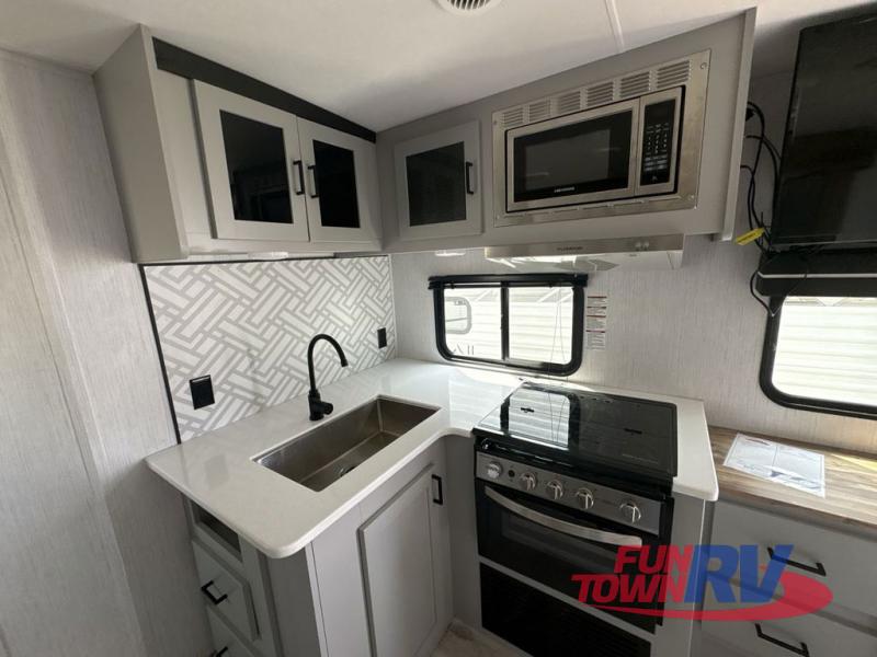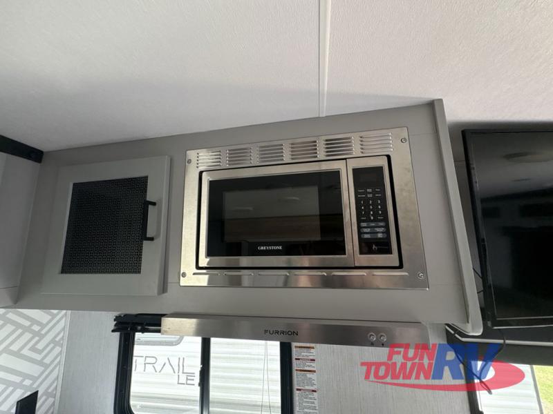 You and your spouse will love camping in this travel trailer! It features a front private bedroom with a king bed to lay your head on at night. Freshen up each morning in the full bathroom with a shower that has a skylight above to bring the outdoors inside. The chef can prepare their best home cooked meals with the four burner cooktop, conventional oven, and 10.7 cu. ft. refrigerator. Enjoy all of your meals and play games at the rear U-shaped dinette, plus it can transform into an extra sleeping space for an extra guest or two depending on their size. With theater seating and an entertainment center with a fireplace, you can have a truly relaxing evening indoors!