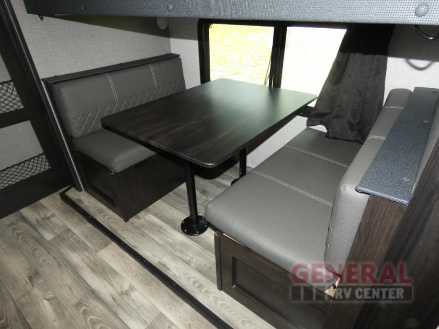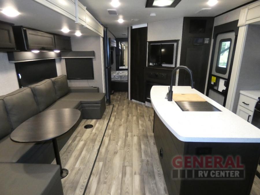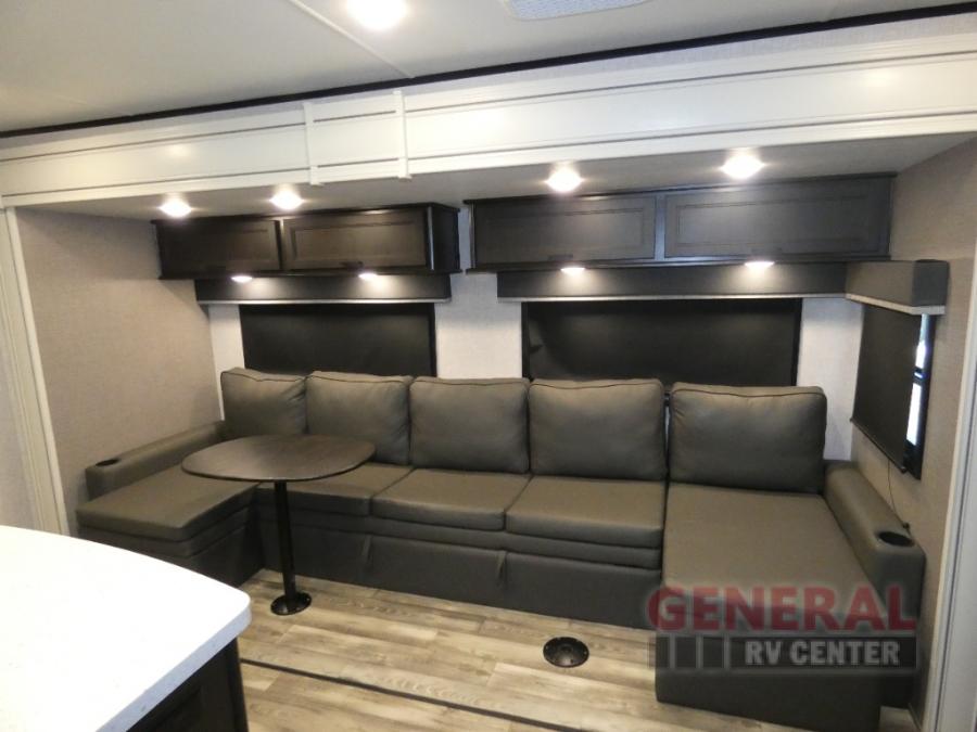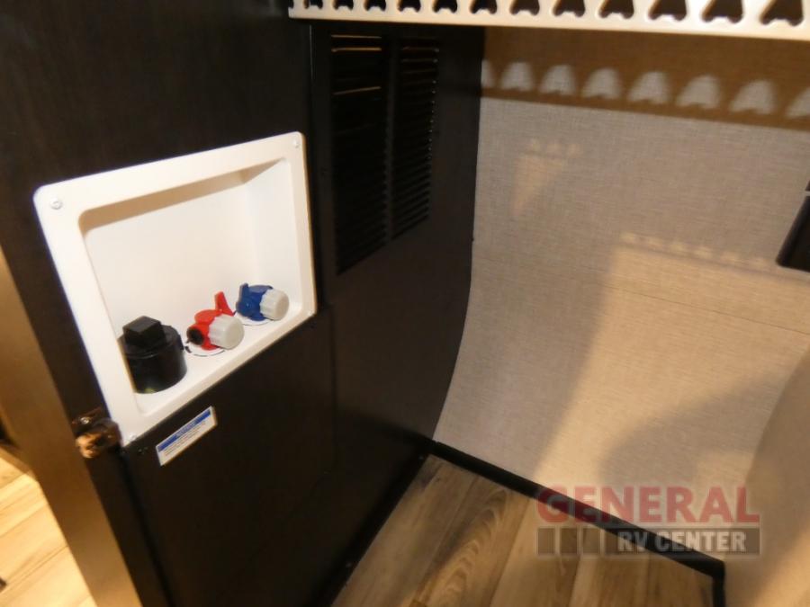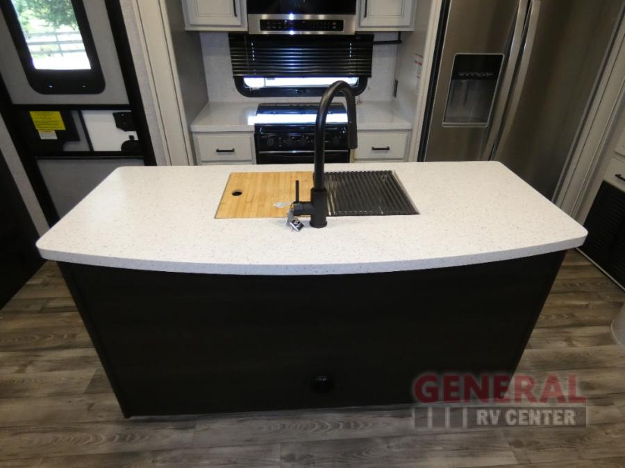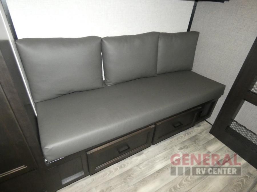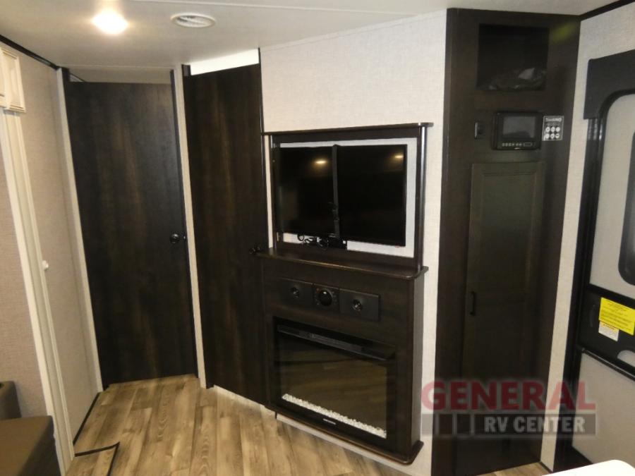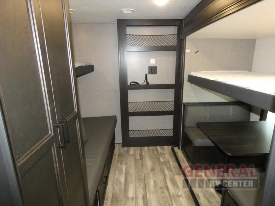 Invite your friends to join you on a road trip thanks to the private bunkhouse with two bunks, a dinette and a bench seat as well as a hutch and wardrobe for their things. You will have your own privacy in the front bedroom with a queen bed slide, a dresser with a window above, a mirrored wardrobe for your clothes and a wardrobe prepped for a washer/dryer. You will also appreciate easy access to the double entry bath which includes a radius shower and linen storage. The cook can make meals with full amenities including a kitchen island and a pantry, and everyone can eat at the U-Lounge with two tables. You will also enjoy watching a show on the 39" LED HDTV with a fireplace below. And the outside kitchen, shower and storage will all come in handy as well.
