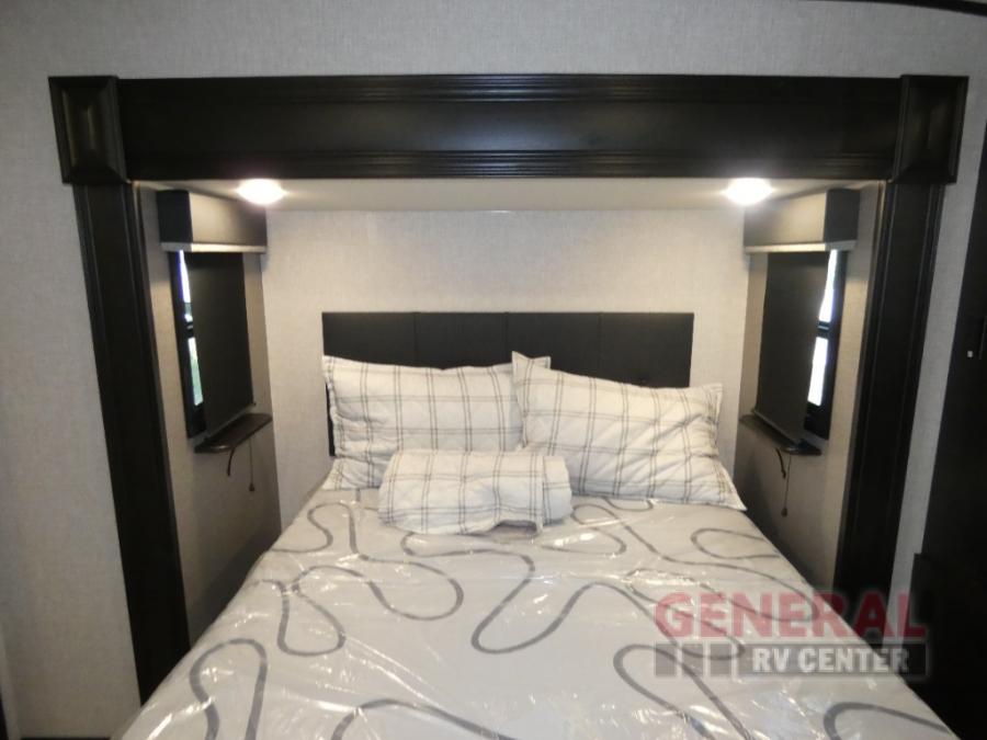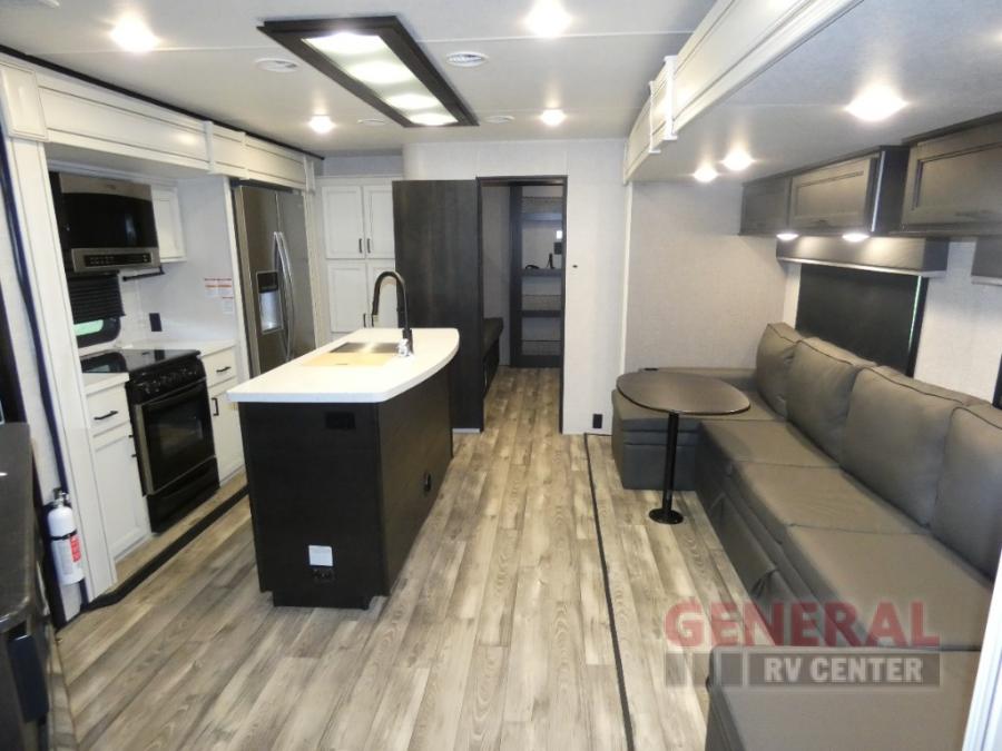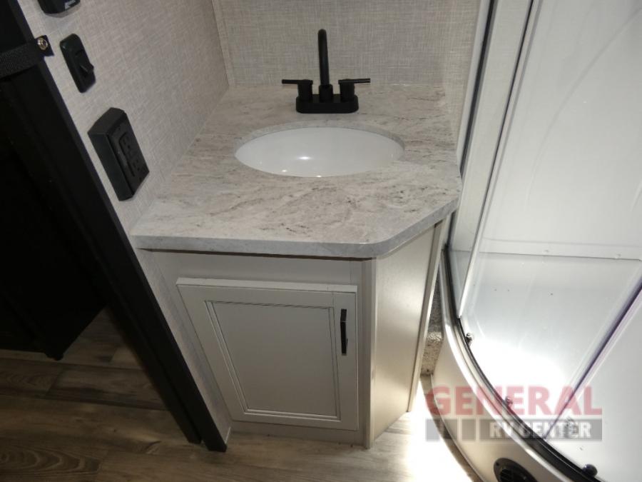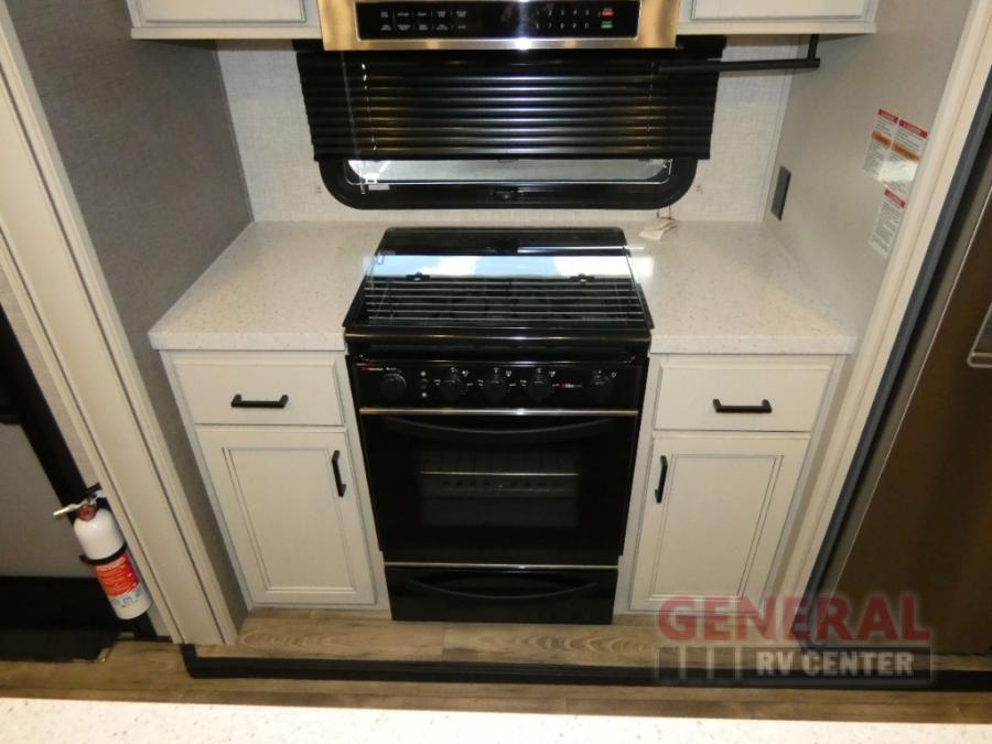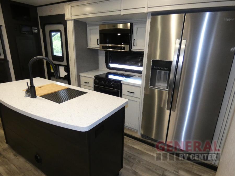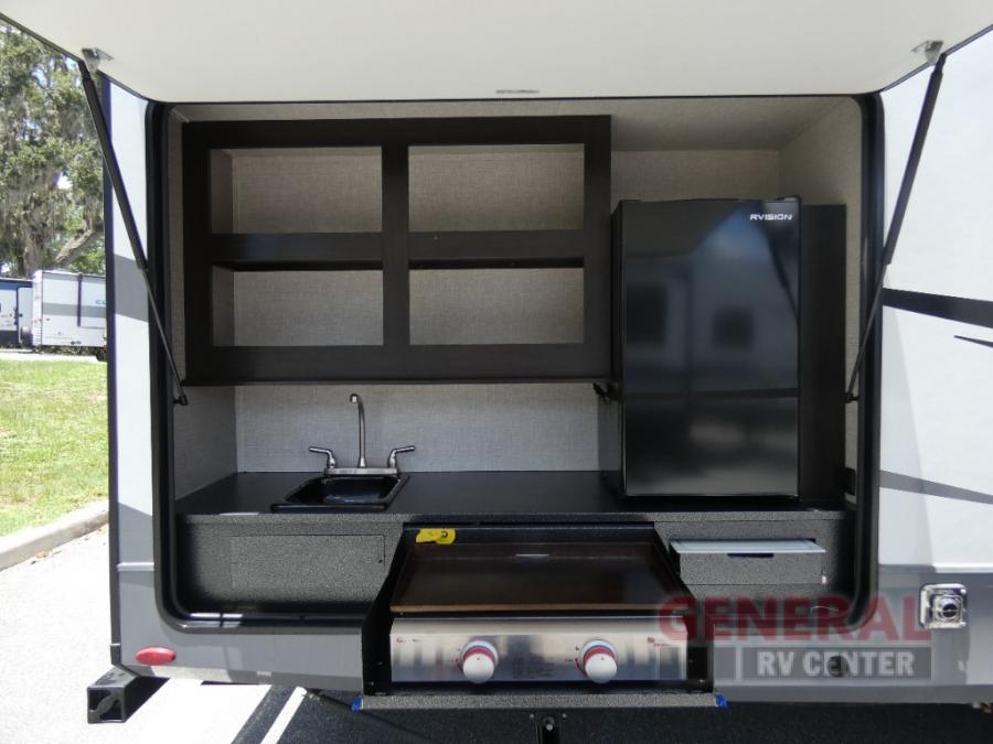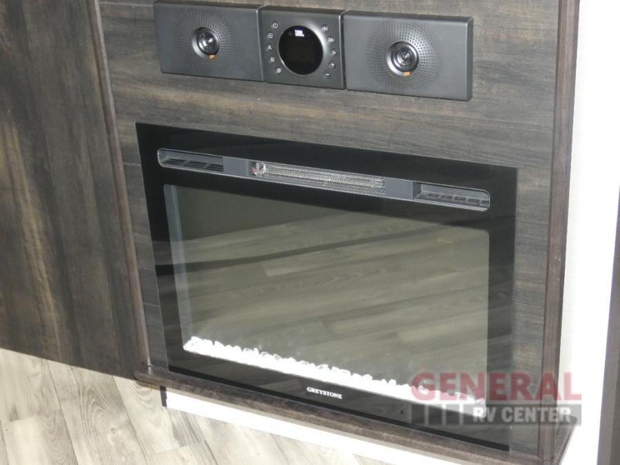 Invite your friends to join you on a road trip thanks to the private bunkhouse with two bunks, a dinette and a bench seat as well as a hutch and wardrobe for their things. You will have your own privacy in the front bedroom with a queen bed slide, a dresser with a window above, a mirrored wardrobe for your clothes and a wardrobe prepped for a washer/dryer. You will also appreciate easy access to the double entry bath which includes a radius shower and linen storage. The cook can make meals with full amenities including a kitchen island and a pantry, and everyone can eat at the U-Lounge with two tables. You will also enjoy watching a show on the 39" LED HDTV with a fireplace below. And the outside kitchen, shower and storage will all come in handy as well.