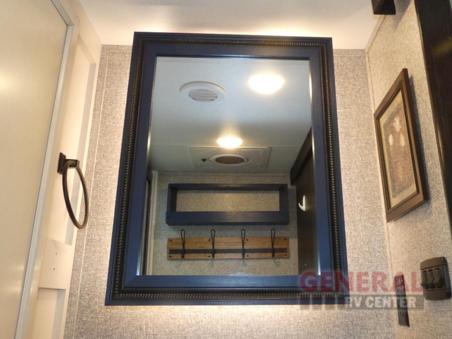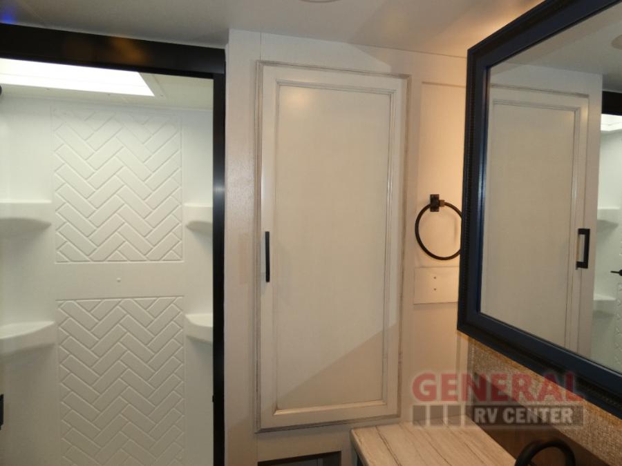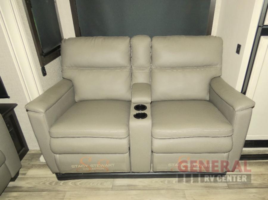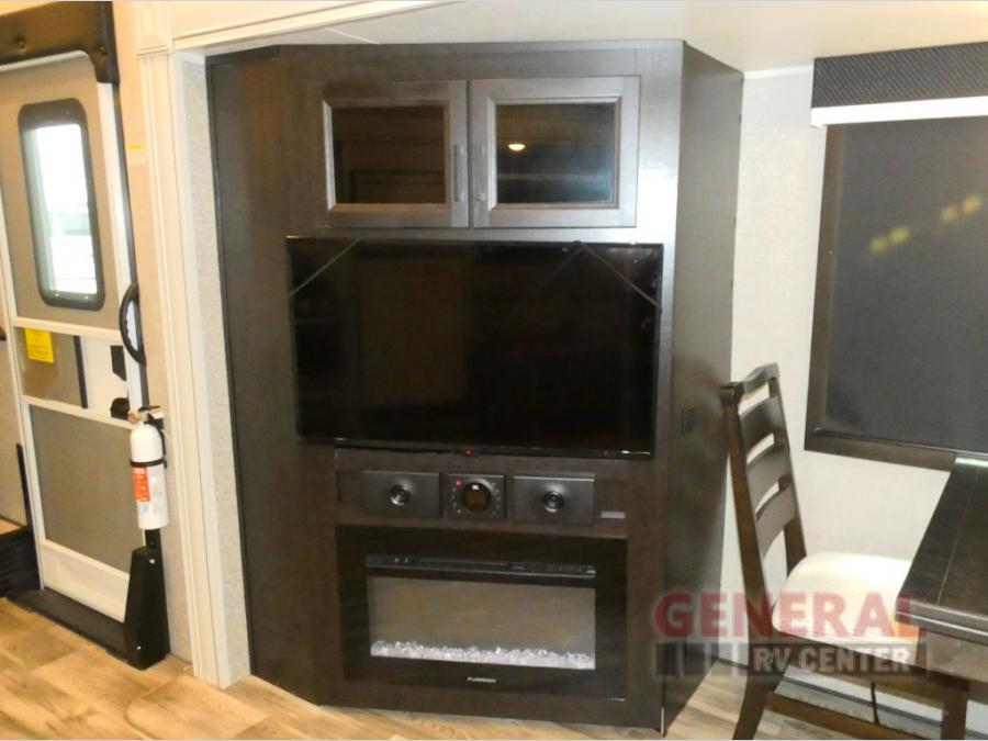 Experience comfort and convenience all throughout this fifth wheel from the queen bed in the front private bedroom to the two rear recliners and walk-in pantry! There is also a hinged entertainment center with a fireplace for those chilly evenings. There is plenty of countertop space in the kitchen for you to prepare your best meals and a free standing table and chairs to enjoy them at then play a card game. The tri-fold sofa is not only a comfortable place to take an afternoon nap, but also for transforming into an extra sleeping space for a guest or two. Everyone can freshen up in the full bathroom with the 30" x 36" shower each morning too!