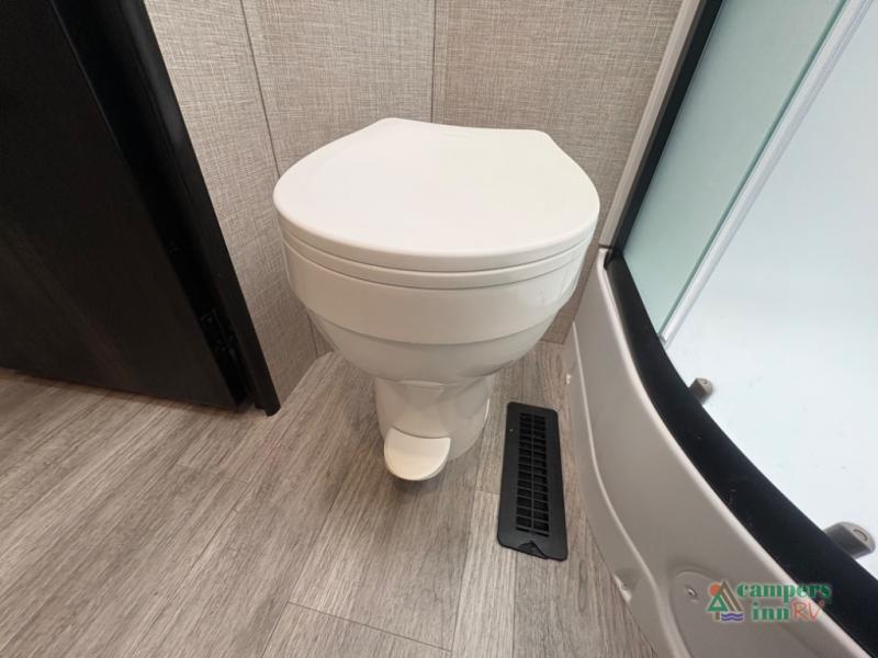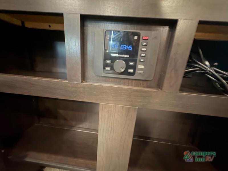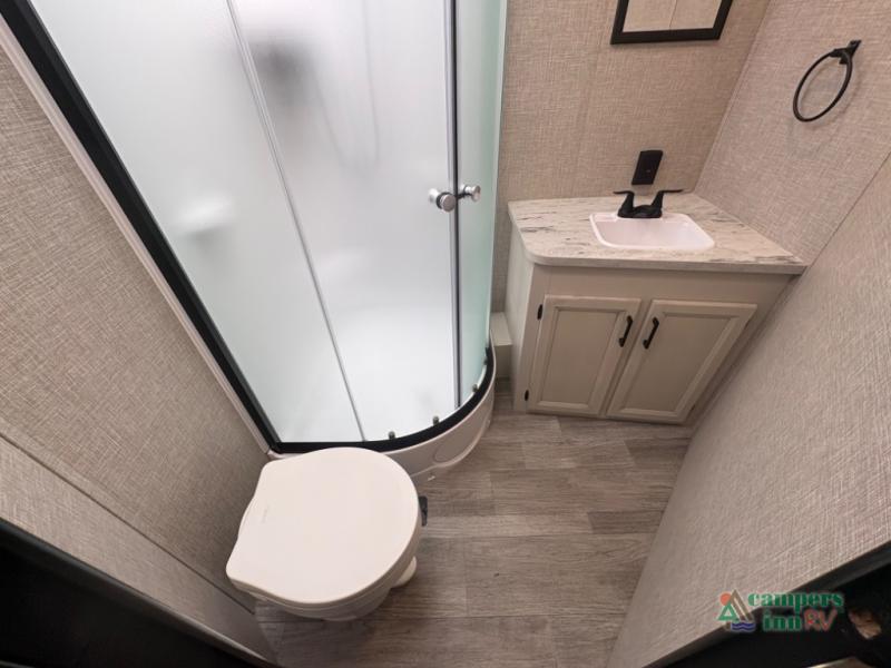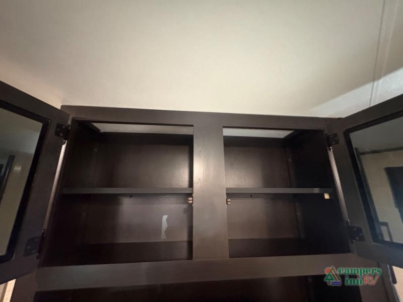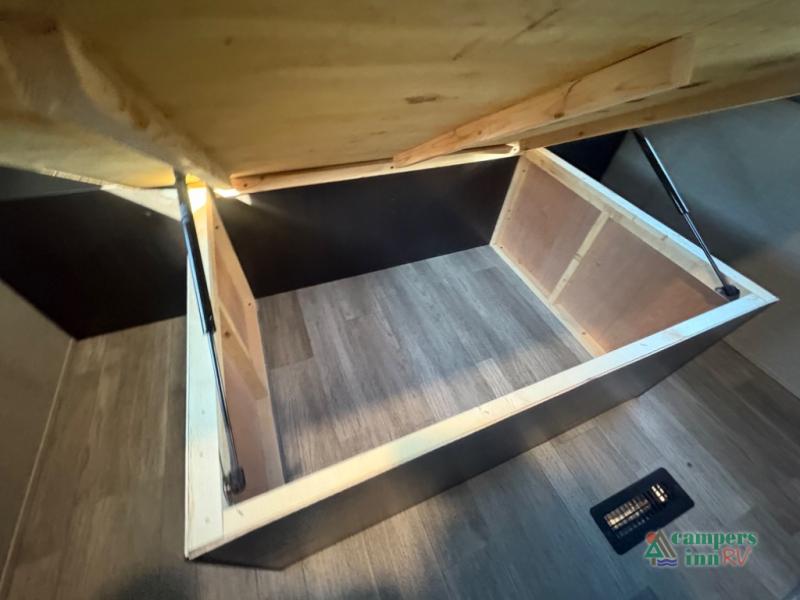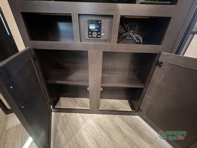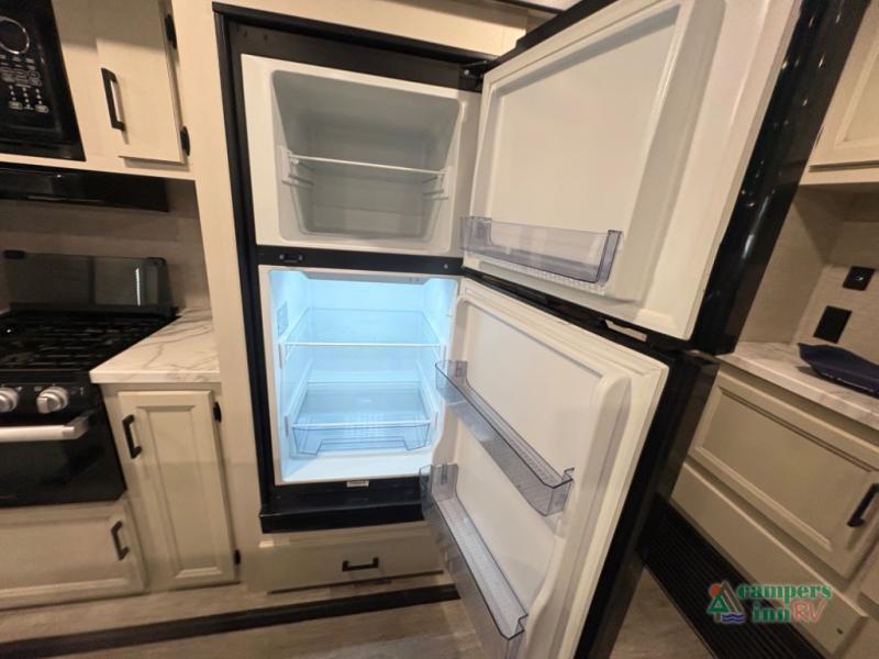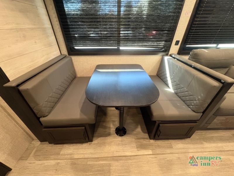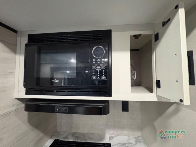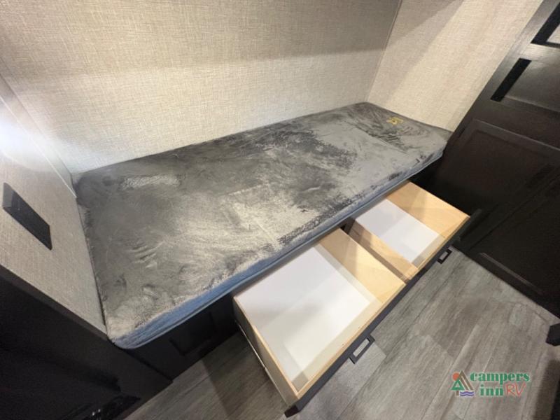 Take the whole crew with you in this travel trailer! The rear private bunkhouse is big enough to house all of the kiddos with a set of 38" x 73" bunk beds, a 27" x 74" bunk above a booth dinette, and an entertainment center. You will have your own privacy with the front private bedroom with a queen bed that has wardrobes on either side for your clothes. Keep everyone squeaky clean with the radius shower in the full bathroom, and their bellies full with the fully equipped kitchen which has a three burner cooktop, kitchen island, hutch, and a gas/electric refrigerator. Enjoy your meals and games at the booth dinette then transform it into an extra sleeping space, plus you can transform the jackknife sofa into one too!