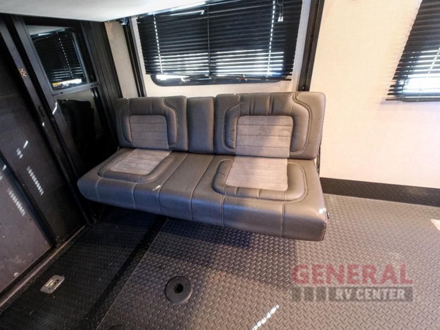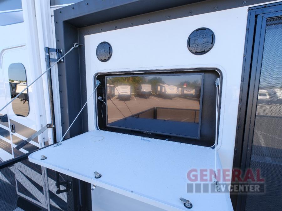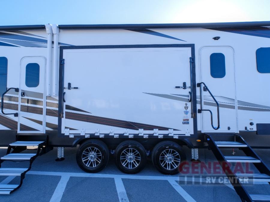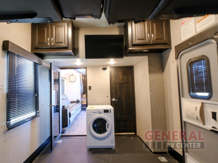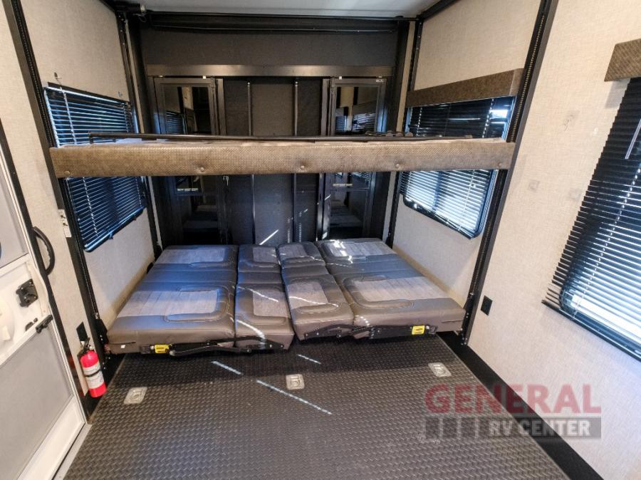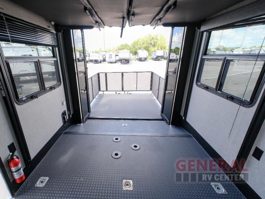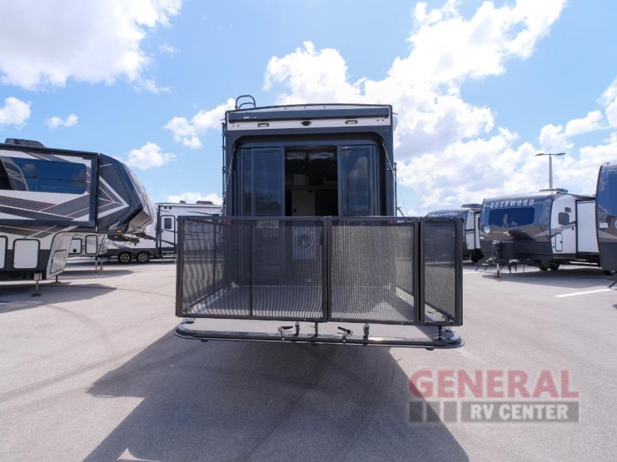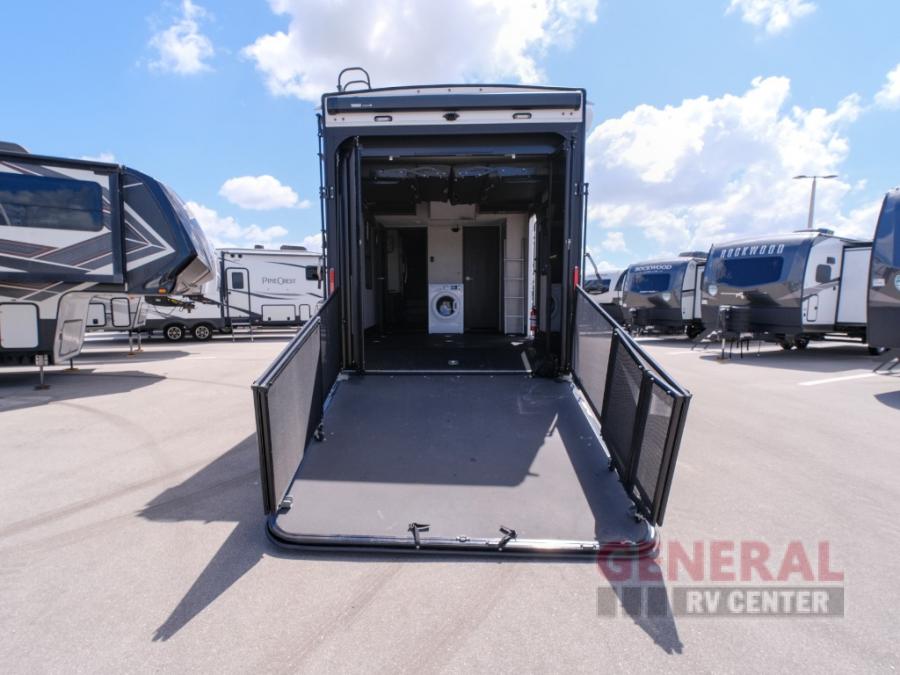 It's time to enjoy your toys and outdoor fun in this toy hauler! This separate garage offers an electric queen bed above rear convertible sofas, a second entry door, a half bath plus a place to add a washer/dryer option if you like. Your friends can have their own space when they join you. And the party deck will be a popular hangout everywhere you go! The separate living and kitchen area offers patio doors to get to the side patio party deck with an exterior TV so you can relax above ground while outdoors. Back inside you will have a SuperSofa with heat, massage, recliners, cupholders and LED lighting to enjoy while watching the Smart LED HDTV with a fireplace below. The chef will have a U-shaped countertop with all the kitchen amenities such as a 30" residential microwave, and the refrigerator is just a few steps away. Everyone can take turns getting cleaned up in the inventive side-aisle bath with a walk-in shower. The front master bedroom has a walk-around king bed for all-around comfort, plus a slide out with a dresser and two wardrobes that stretches into the hallway.