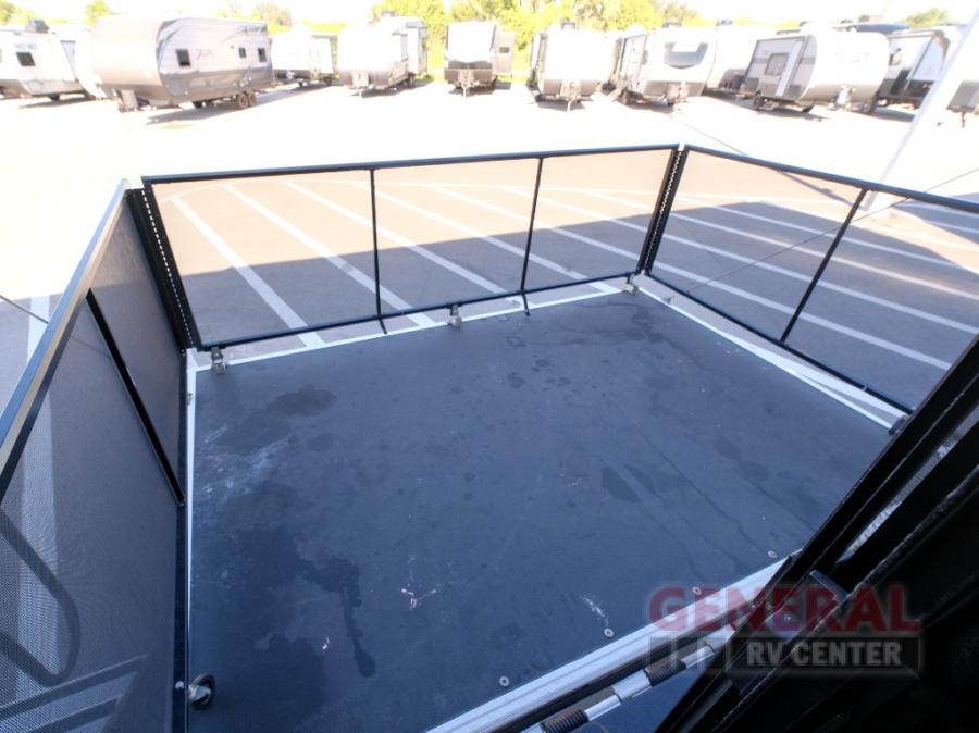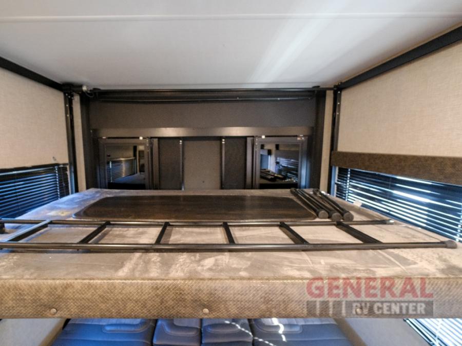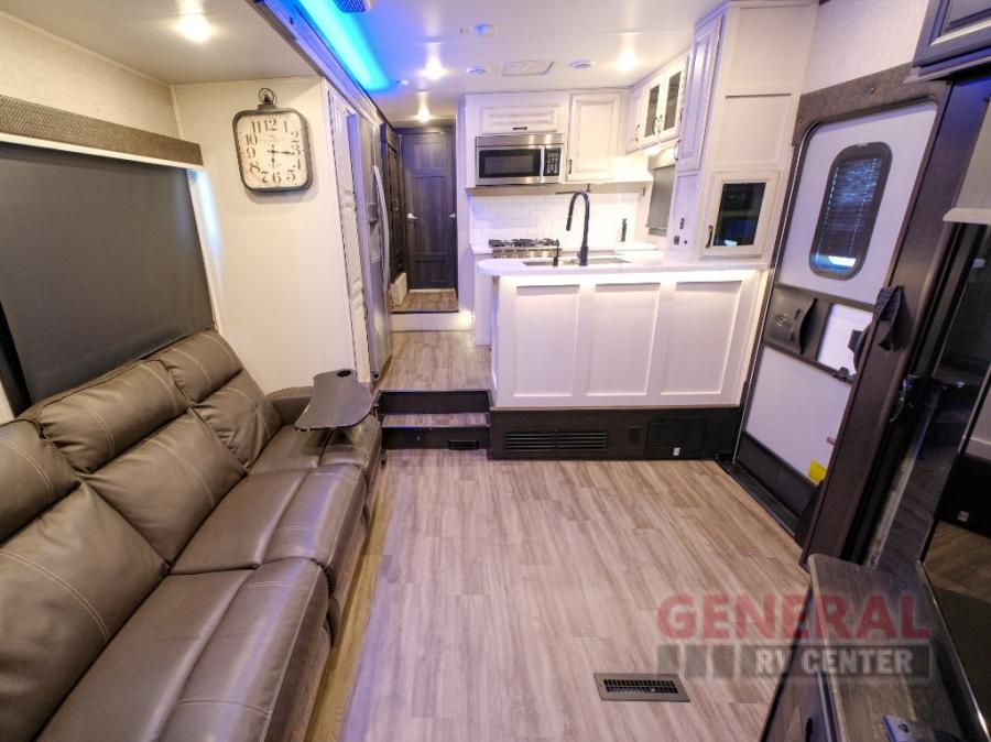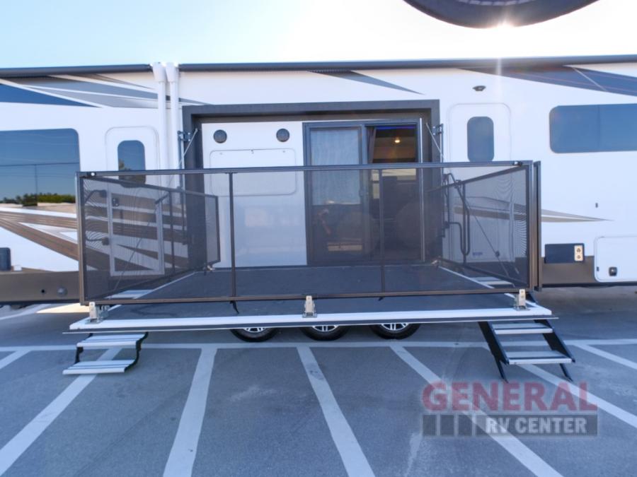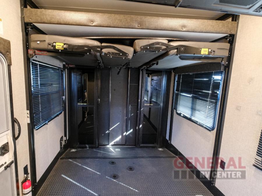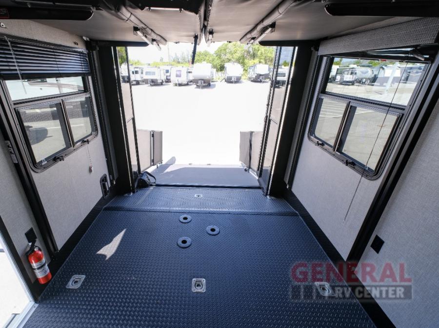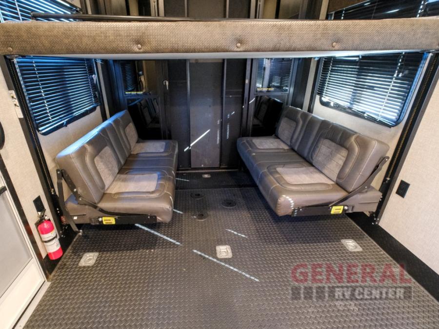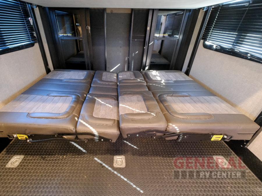 It's time to enjoy your toys and outdoor fun in this toy hauler! This separate garage offers an electric queen bed above rear convertible sofas, a second entry door, a half bath plus a place to add a washer/dryer option if you like. Your friends can have their own space when they join you. And the party deck will be a popular hangout everywhere you go! The separate living and kitchen area offers patio doors to get to the side patio party deck with an exterior TV so you can relax above ground while outdoors. Back inside you will have a SuperSofa with heat, massage, recliners, cupholders and LED lighting to enjoy while watching the Smart LED HDTV with a fireplace below. The chef will have a U-shaped countertop with all the kitchen amenities such as a 30" residential microwave, and the refrigerator is just a few steps away. Everyone can take turns getting cleaned up in the inventive side-aisle bath with a walk-in shower. The front master bedroom has a walk-around king bed for all-around comfort, plus a slide out with a dresser and two wardrobes that stretches into the hallway.