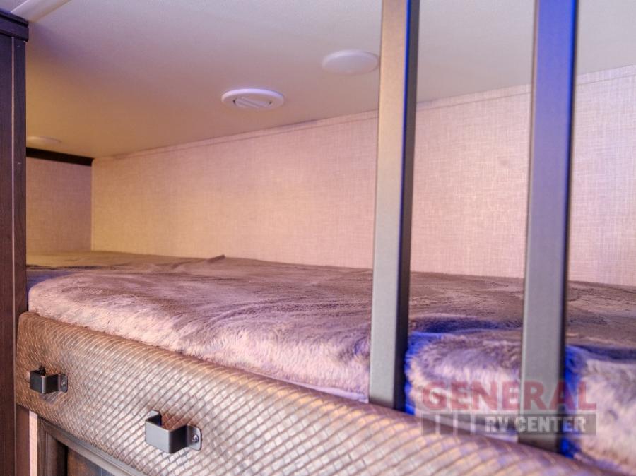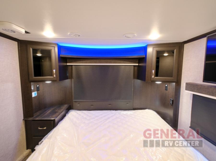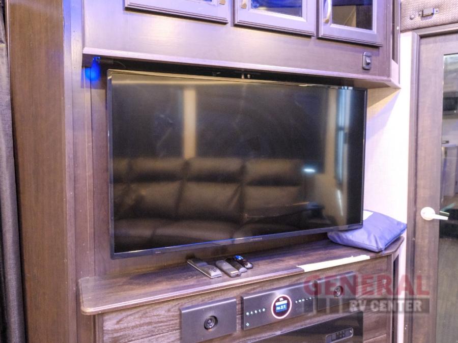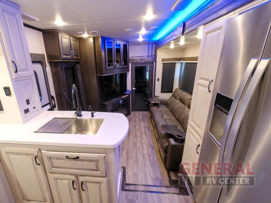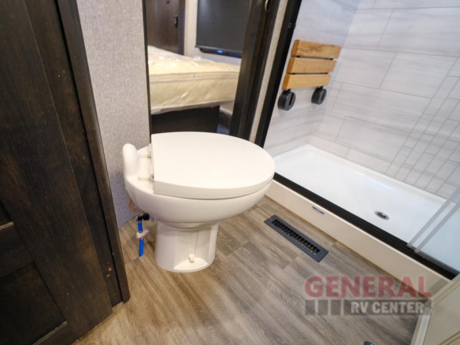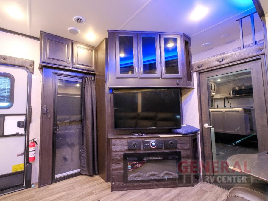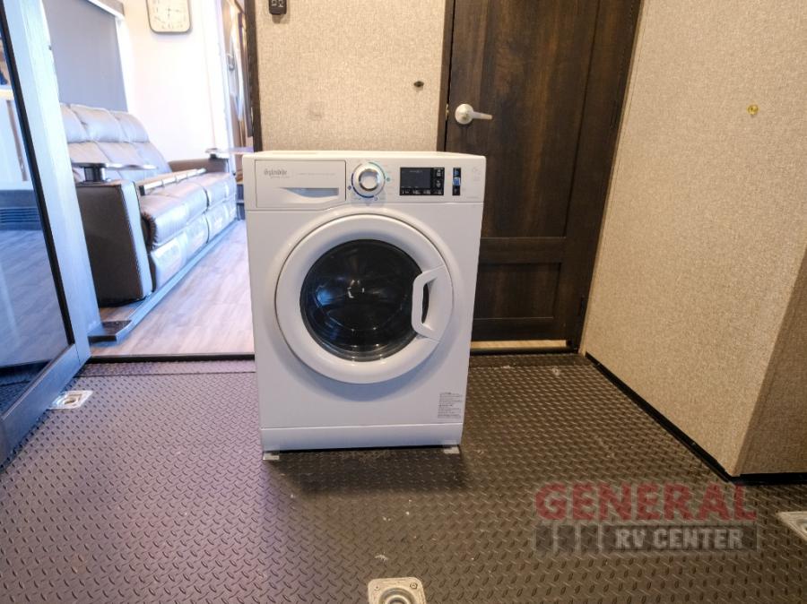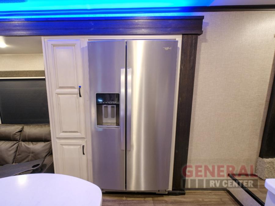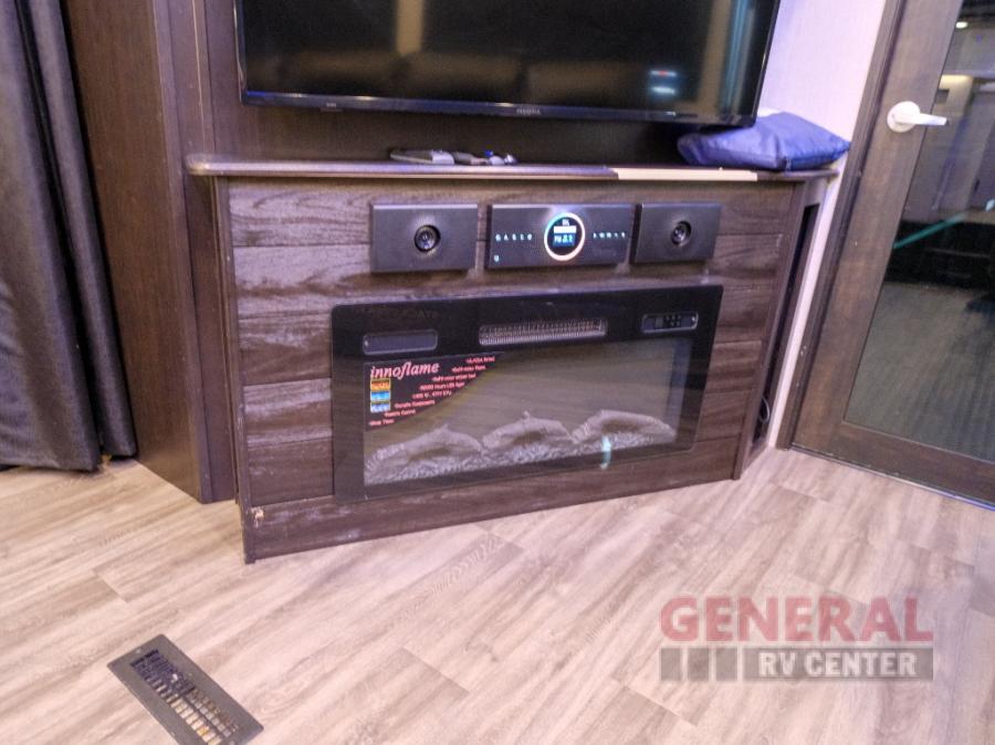 It's time to enjoy your toys and outdoor fun in this toy hauler! This separate garage offers an electric queen bed above rear convertible sofas, a second entry door, a half bath plus a place to add a washer/dryer option if you like. Your friends can have their own space when they join you. And the party deck will be a popular hangout everywhere you go! The separate living and kitchen area offers patio doors to get to the side patio party deck with an exterior TV so you can relax above ground while outdoors. Back inside you will have a SuperSofa with heat, massage, recliners, cupholders and LED lighting to enjoy while watching the Smart LED HDTV with a fireplace below. The chef will have a U-shaped countertop with all the kitchen amenities such as a 30" residential microwave, and the refrigerator is just a few steps away. Everyone can take turns getting cleaned up in the inventive side-aisle bath with a walk-in shower. The front master bedroom has a walk-around king bed for all-around comfort, plus a slide out with a dresser and two wardrobes that stretches into the hallway.