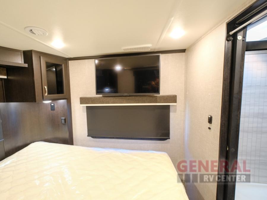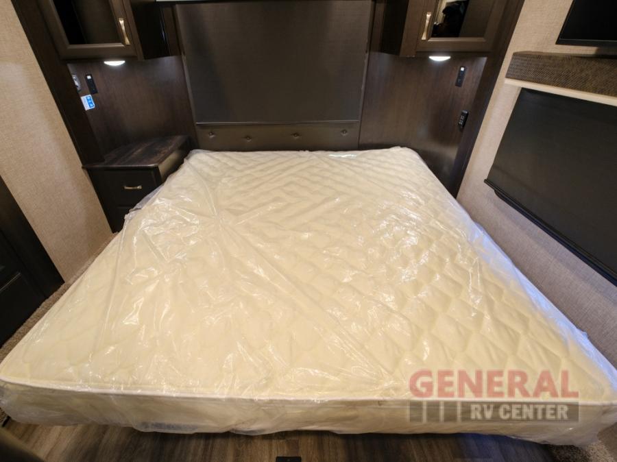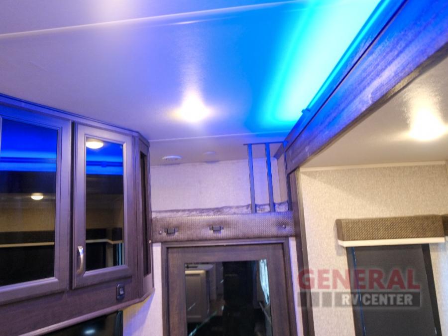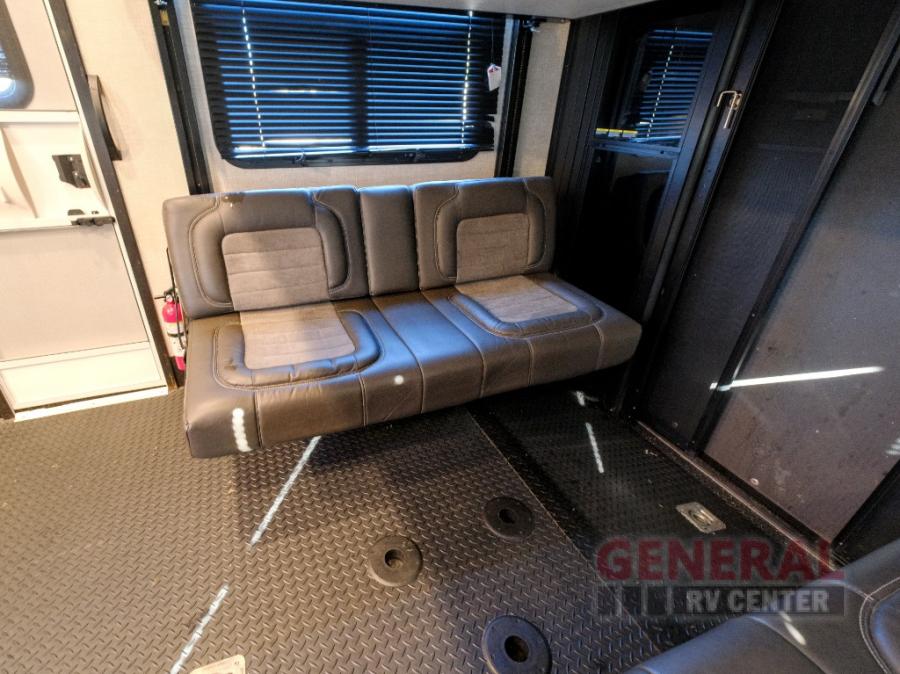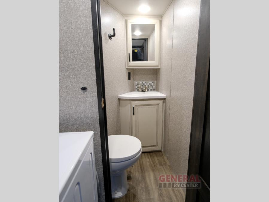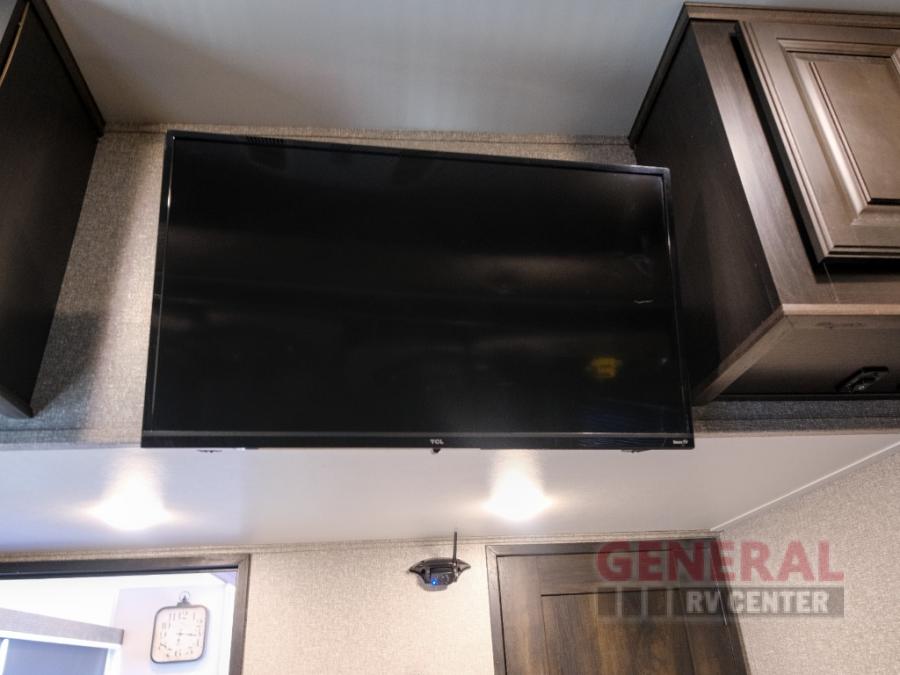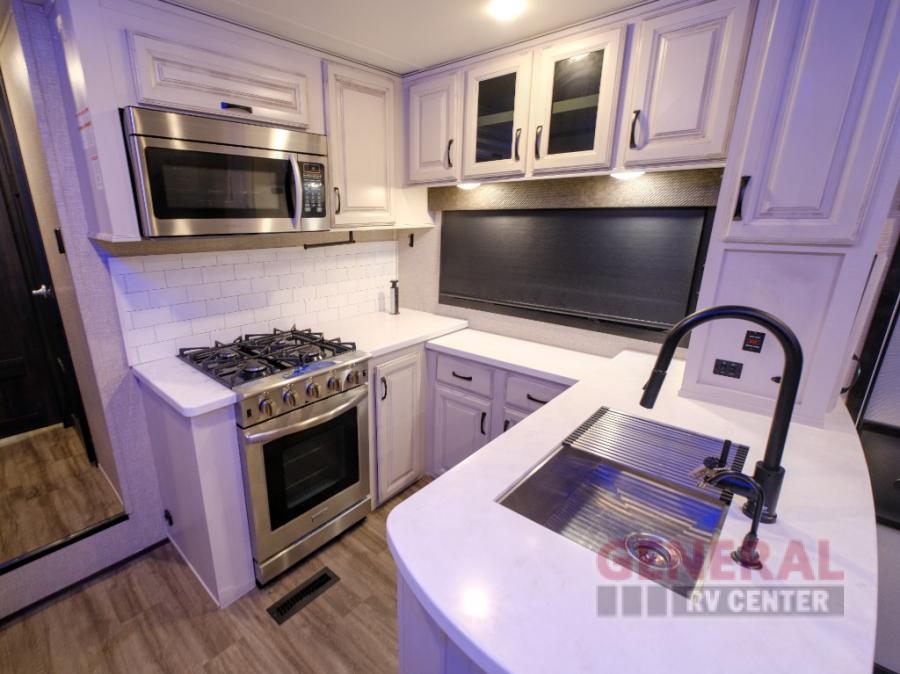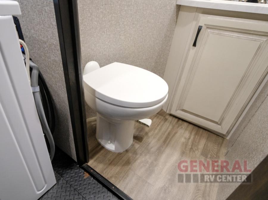 It's time to enjoy your toys and outdoor fun in this toy hauler! This separate garage offers an electric queen bed above rear convertible sofas, a second entry door, a half bath plus a place to add a washer/dryer option if you like. Your friends can have their own space when they join you. And the party deck will be a popular hangout everywhere you go! The separate living and kitchen area offers patio doors to get to the side patio party deck with an exterior TV so you can relax above ground while outdoors. Back inside you will have a SuperSofa with heat, massage, recliners, cupholders and LED lighting to enjoy while watching the Smart LED HDTV with a fireplace below. The chef will have a U-shaped countertop with all the kitchen amenities such as a 30" residential microwave, and the refrigerator is just a few steps away. Everyone can take turns getting cleaned up in the inventive side-aisle bath with a walk-in shower. The front master bedroom has a walk-around king bed for all-around comfort, plus a slide out with a dresser and two wardrobes that stretches into the hallway.