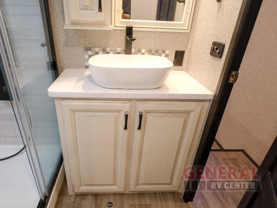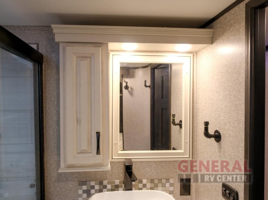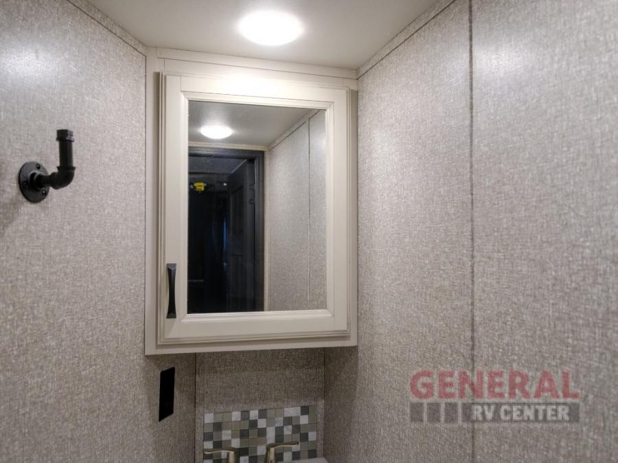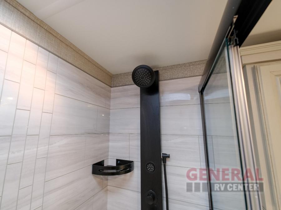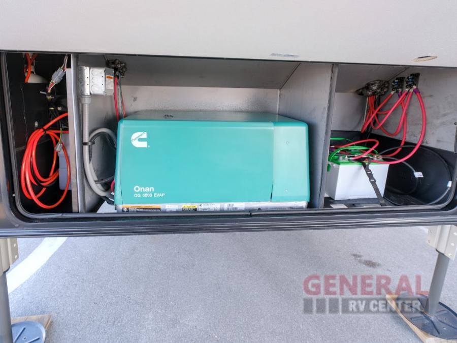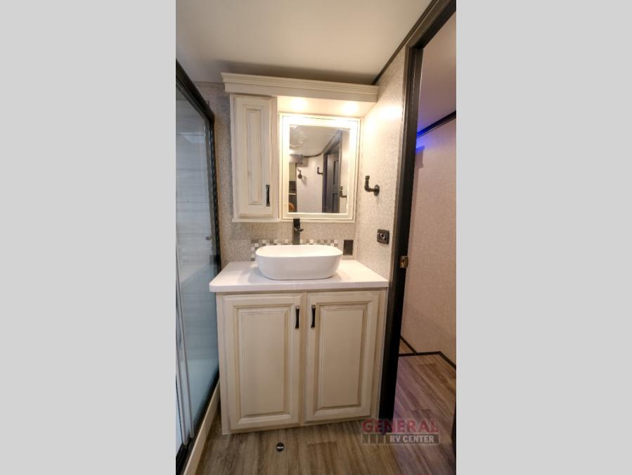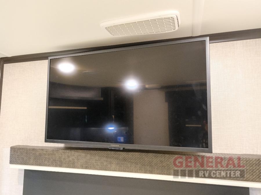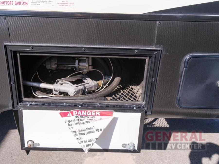 It's time to enjoy your toys and outdoor fun in this toy hauler! This separate garage offers an electric queen bed above rear convertible sofas, a second entry door, a half bath plus a place to add a washer/dryer option if you like. Your friends can have their own space when they join you. And the party deck will be a popular hangout everywhere you go! The separate living and kitchen area offers patio doors to get to the side patio party deck with an exterior TV so you can relax above ground while outdoors. Back inside you will have a SuperSofa with heat, massage, recliners, cupholders and LED lighting to enjoy while watching the Smart LED HDTV with a fireplace below. The chef will have a U-shaped countertop with all the kitchen amenities such as a 30" residential microwave, and the refrigerator is just a few steps away. Everyone can take turns getting cleaned up in the inventive side-aisle bath with a walk-in shower. The front master bedroom has a walk-around king bed for all-around comfort, plus a slide out with a dresser and two wardrobes that stretches into the hallway.