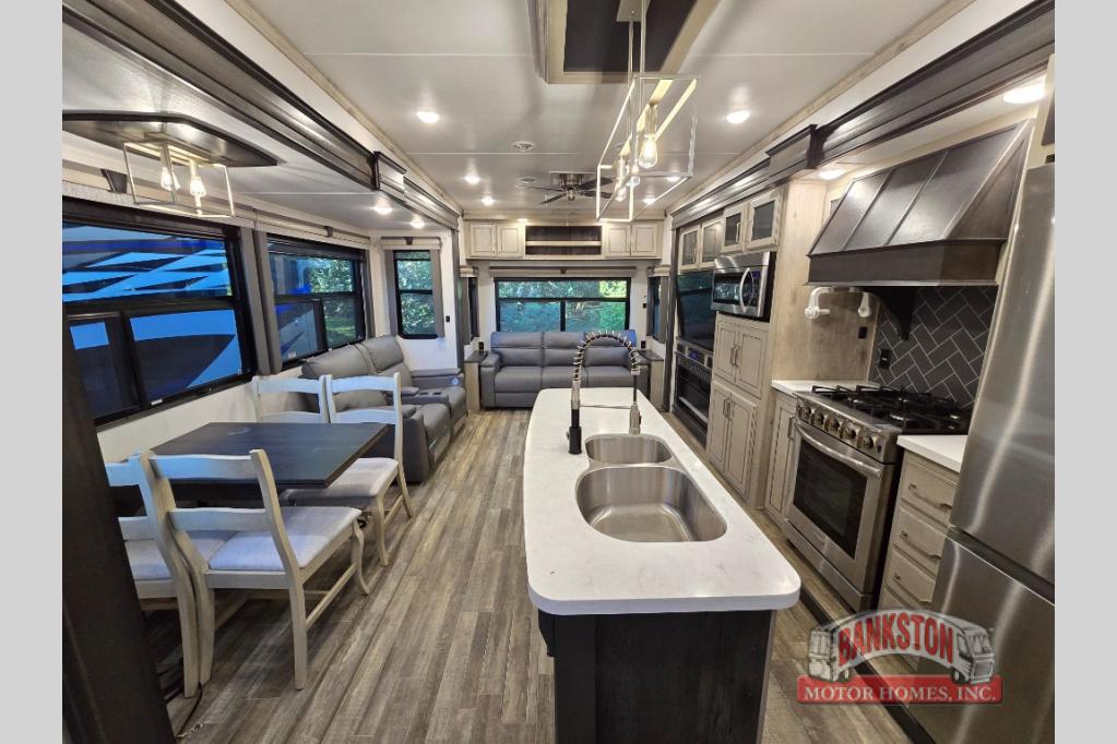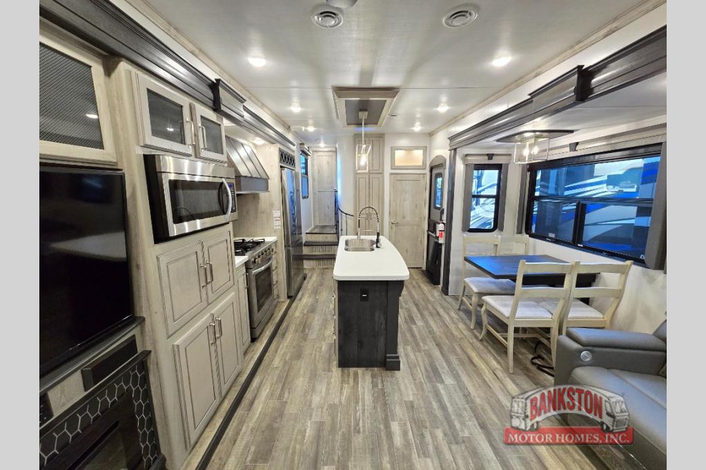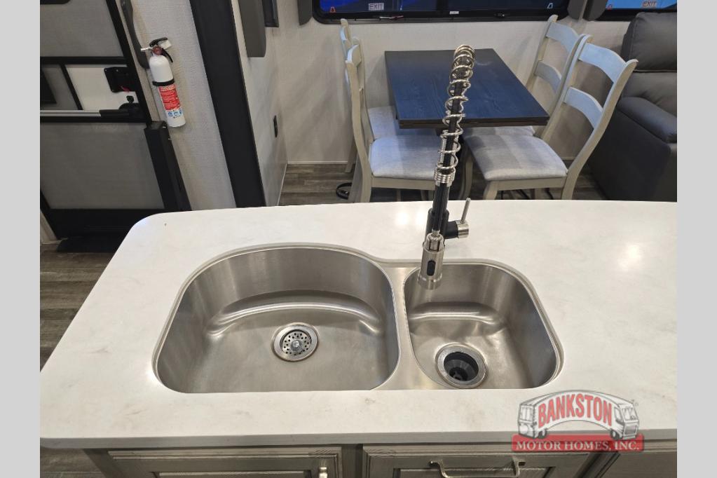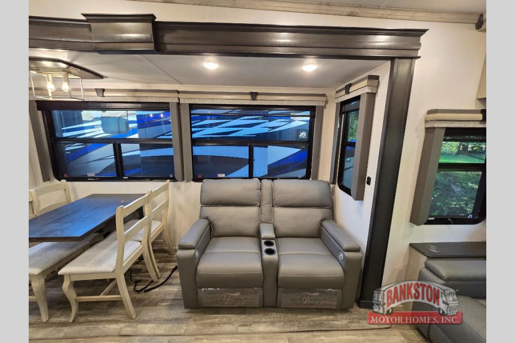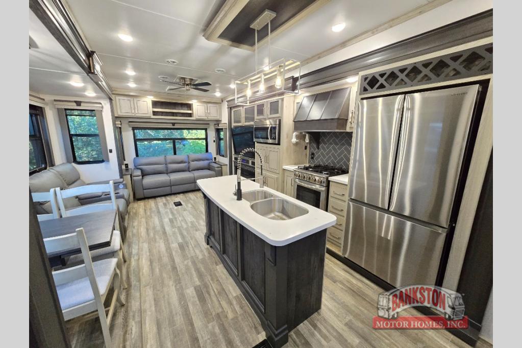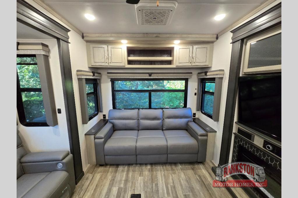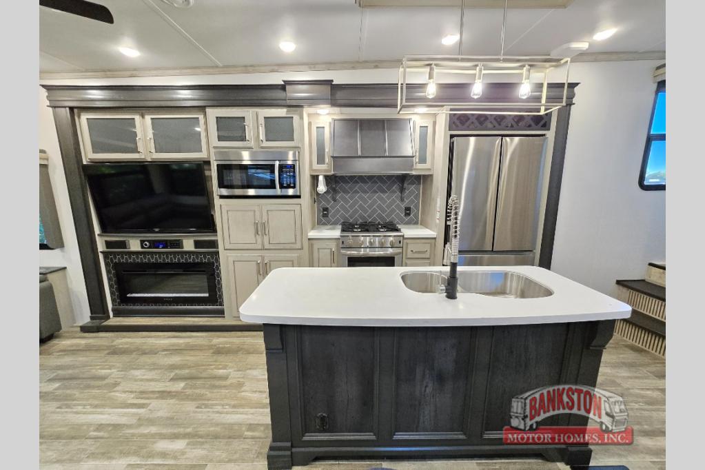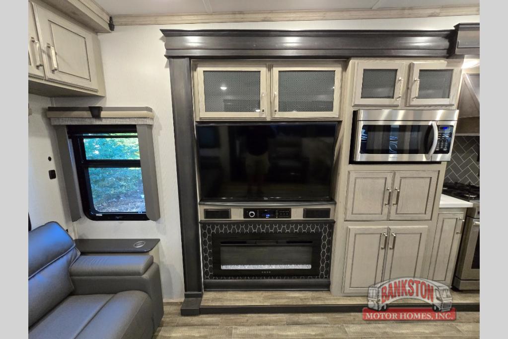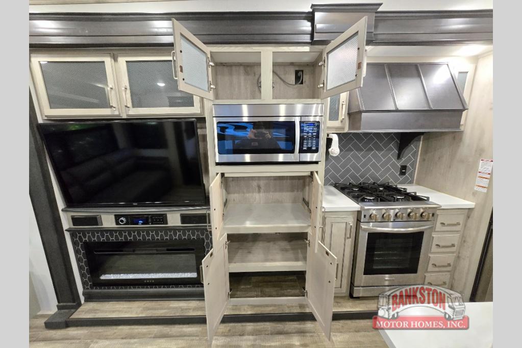 Start camping in true luxury with this fifth wheel! The rear living area has a tri-fold sofa sleeper, Thomas Payne theater seating with heat, massage, LED Lights, and a USB charging station across from an entertainment center with a 40" fireplace and 50" TV for a comfortable place to socialize and relax after a fun day. The kitchen is decked out in features you will appreciate like the appliance garage below the convection microwave, the range hood above the three burner cooktop, the 18 cu. ft. gas/electric refrigerator, an island with two sinks for easy clean up, and the pantry next to an area prepped to add an optional stackable washer and dryer. The front private bedroom has a king bed slide with storage underneath across from a bench and chest with TV, a front chest with wardrobes on either side, and an entrance into the dual entry bathroom which will come in handy at night!