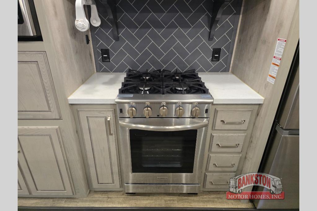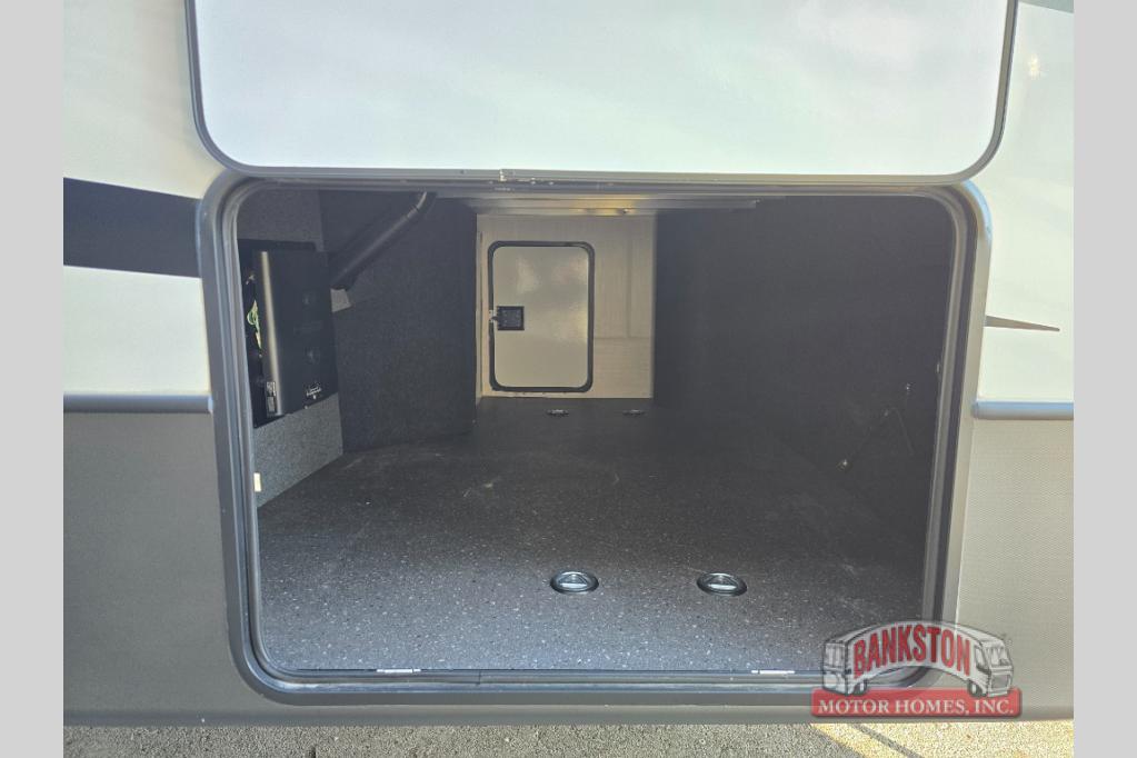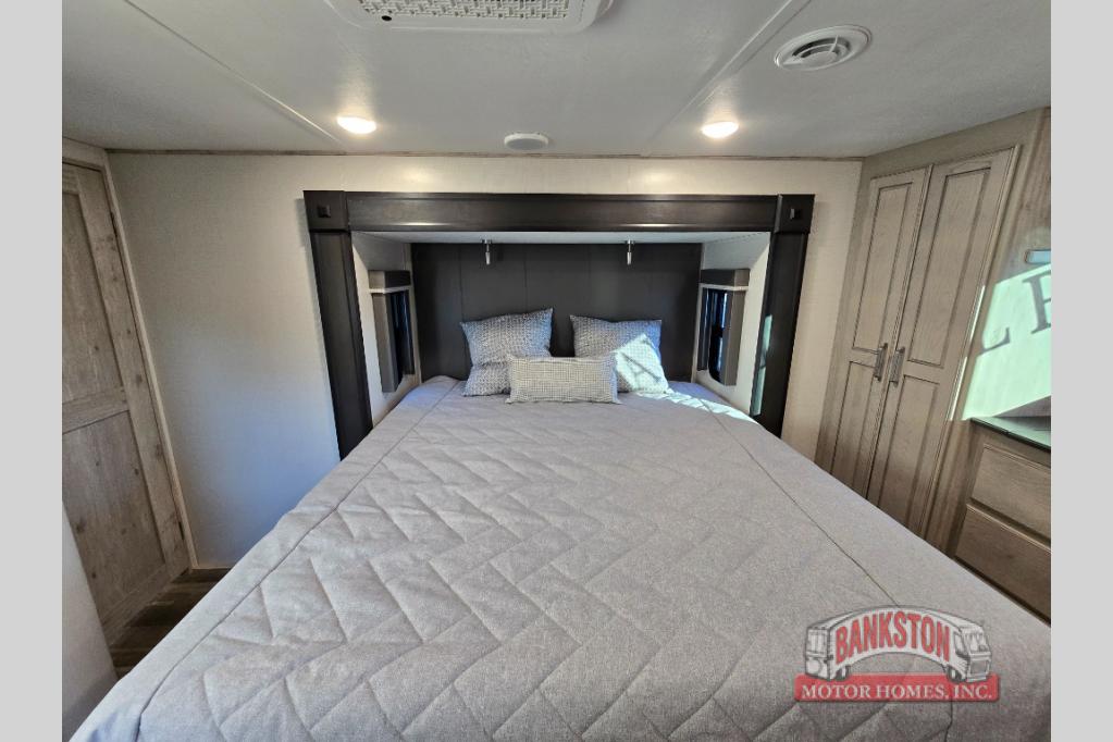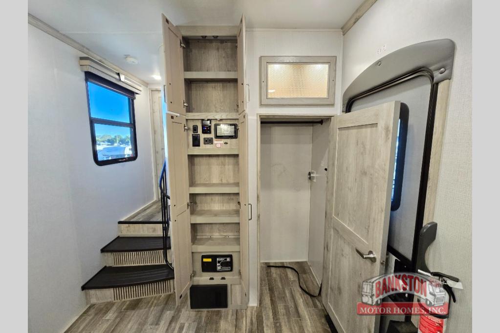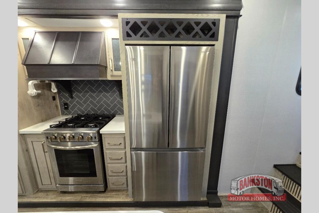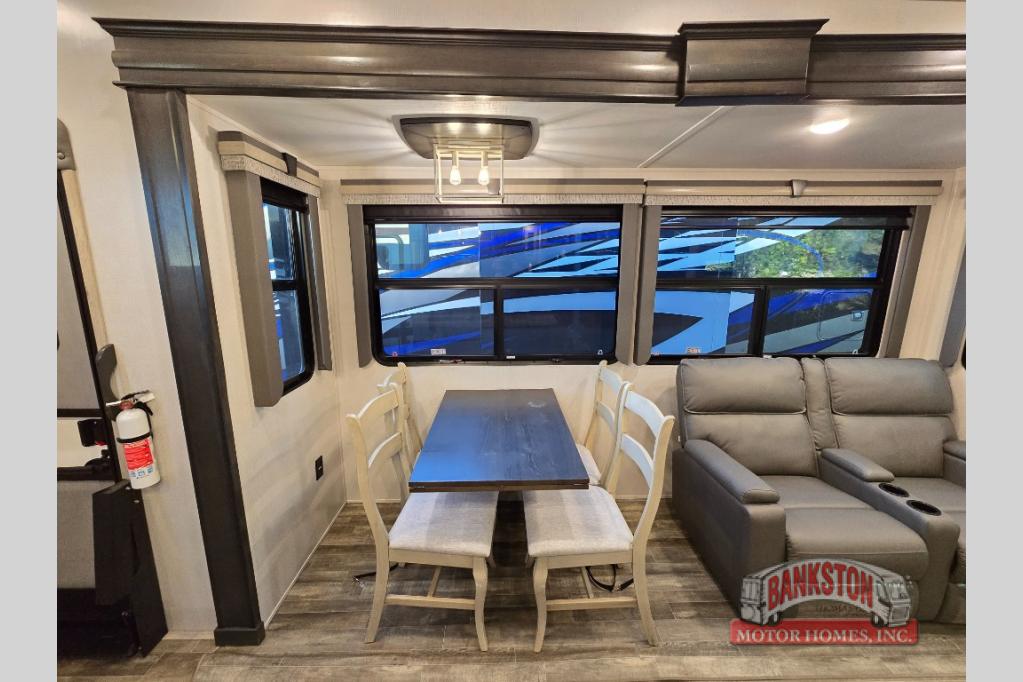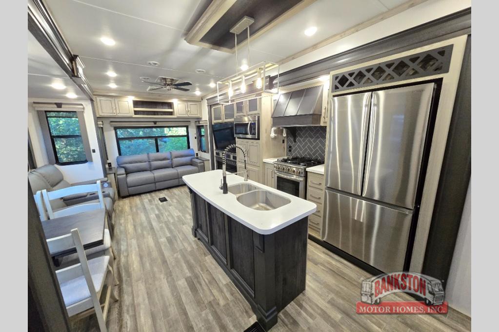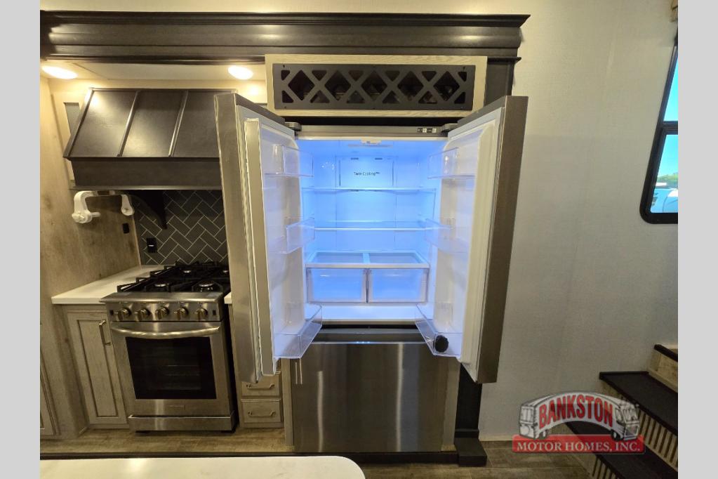 Start camping in true luxury with this fifth wheel! The rear living area has a tri-fold sofa sleeper, Thomas Payne theater seating with heat, massage, LED Lights, and a USB charging station across from an entertainment center with a 40" fireplace and 50" TV for a comfortable place to socialize and relax after a fun day. The kitchen is decked out in features you will appreciate like the appliance garage below the convection microwave, the range hood above the three burner cooktop, the 18 cu. ft. gas/electric refrigerator, an island with two sinks for easy clean up, and the pantry next to an area prepped to add an optional stackable washer and dryer. The front private bedroom has a king bed slide with storage underneath across from a bench and chest with TV, a front chest with wardrobes on either side, and an entrance into the dual entry bathroom which will come in handy at night!