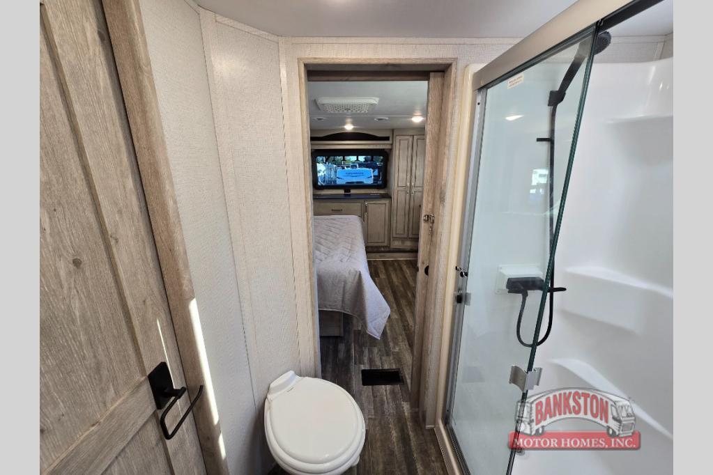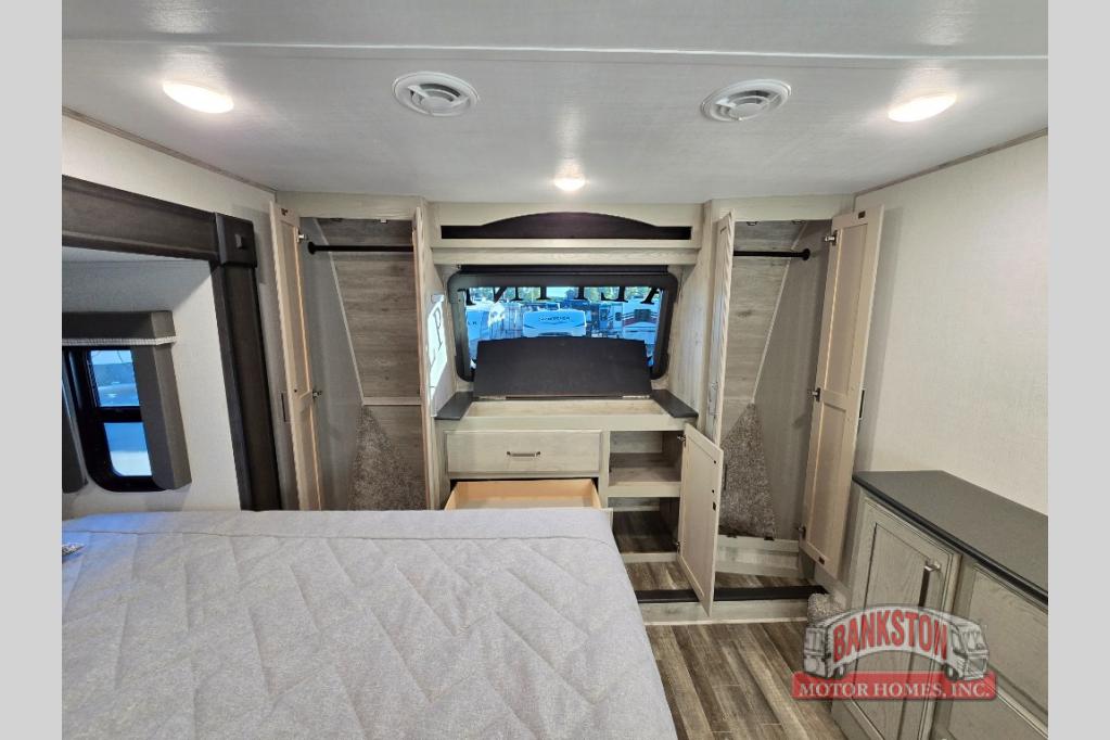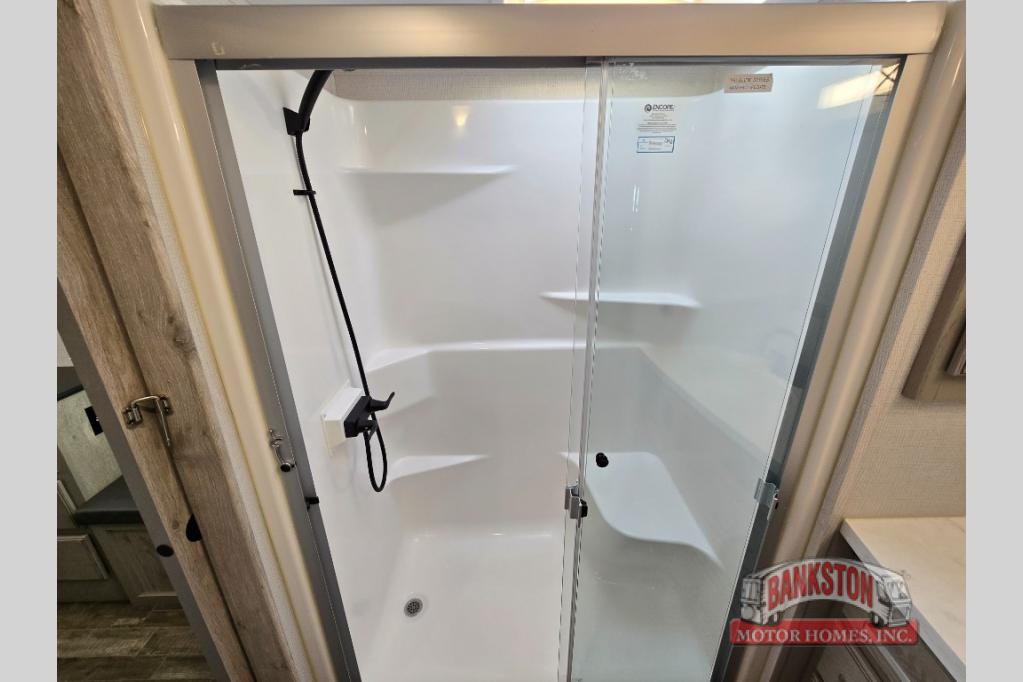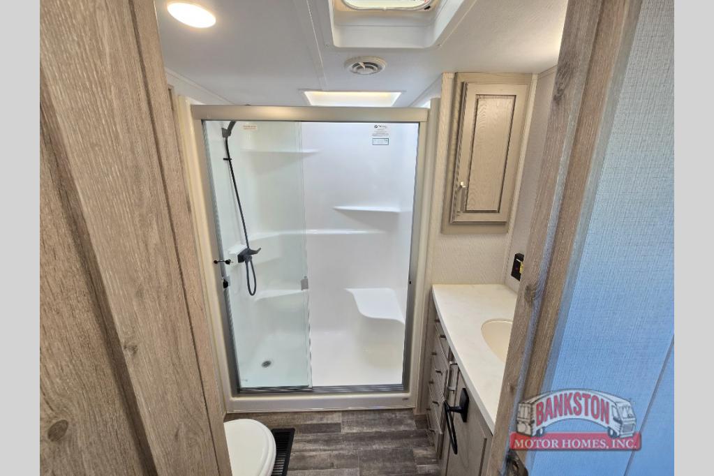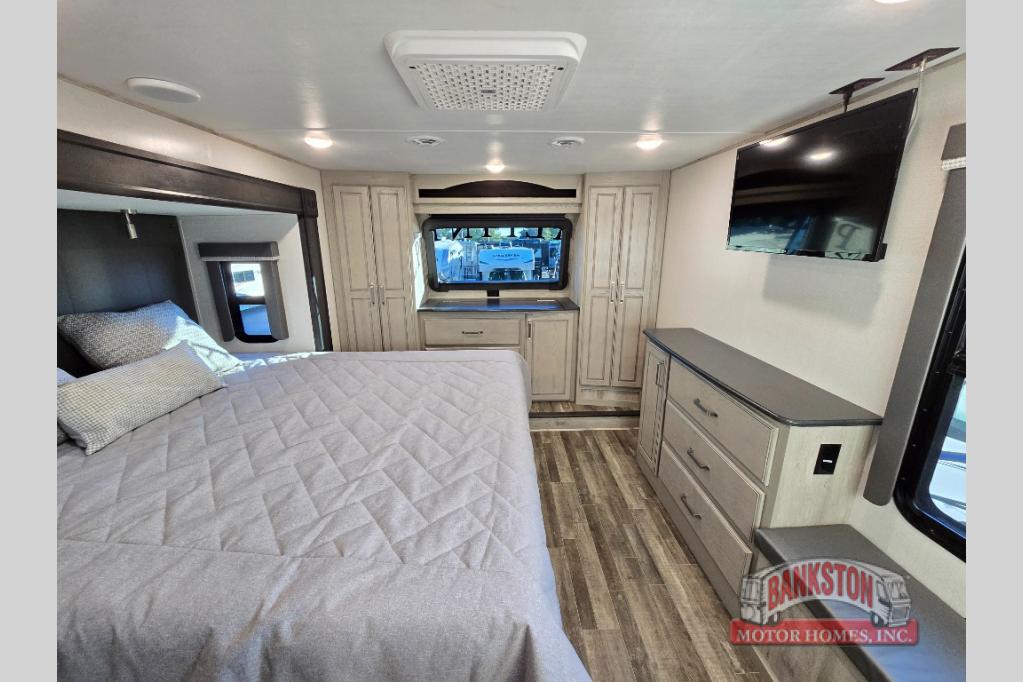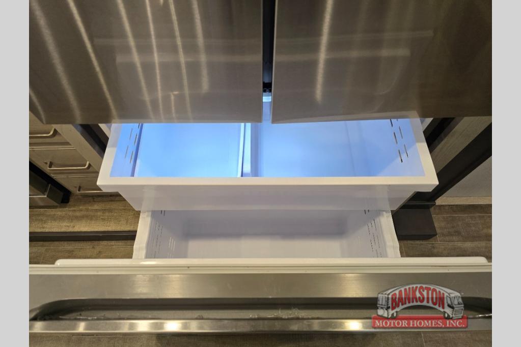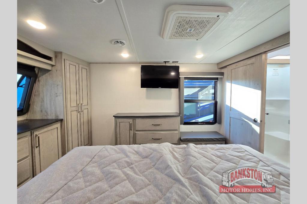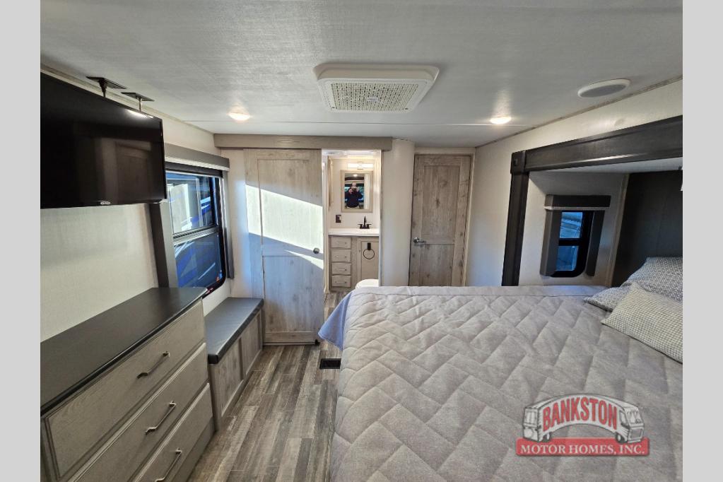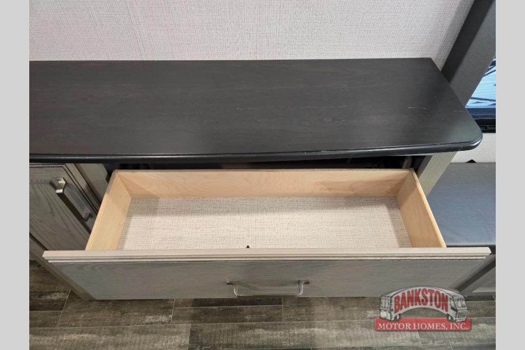 Start camping in true luxury with this fifth wheel! The rear living area has a tri-fold sofa sleeper, Thomas Payne theater seating with heat, massage, LED Lights, and a USB charging station across from an entertainment center with a 40" fireplace and 50" TV for a comfortable place to socialize and relax after a fun day. The kitchen is decked out in features you will appreciate like the appliance garage below the convection microwave, the range hood above the three burner cooktop, the 18 cu. ft. gas/electric refrigerator, an island with two sinks for easy clean up, and the pantry next to an area prepped to add an optional stackable washer and dryer. The front private bedroom has a king bed slide with storage underneath across from a bench and chest with TV, a front chest with wardrobes on either side, and an entrance into the dual entry bathroom which will come in handy at night!