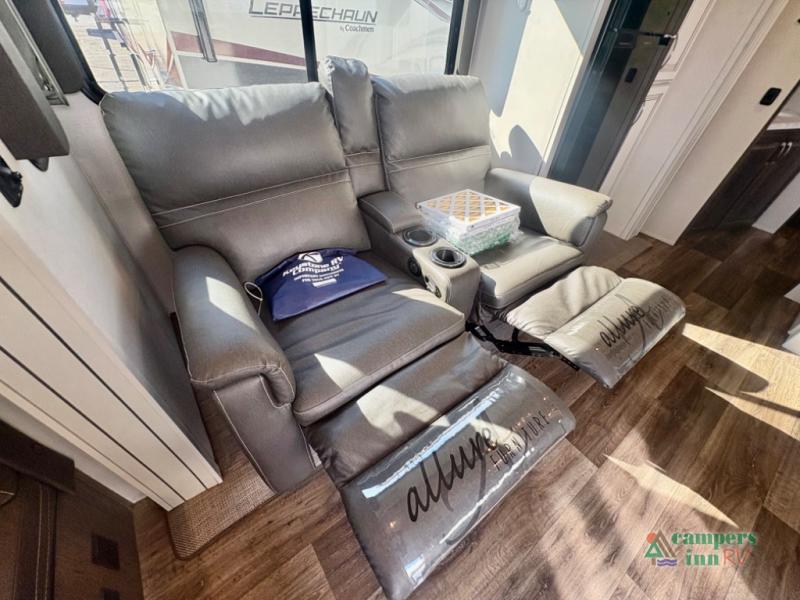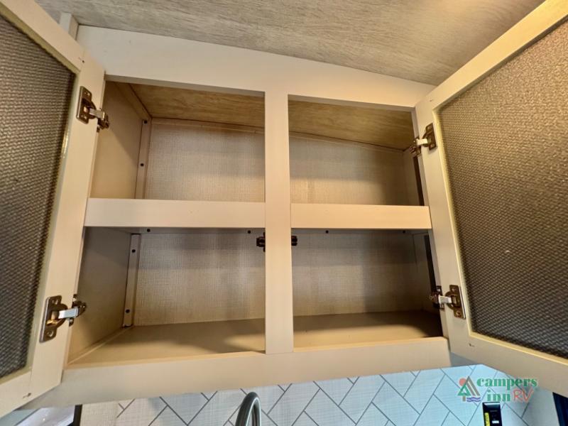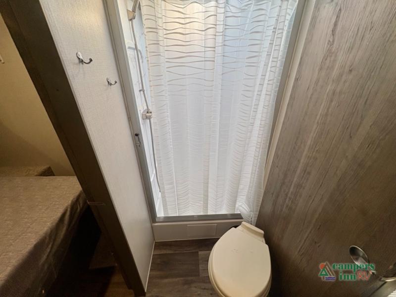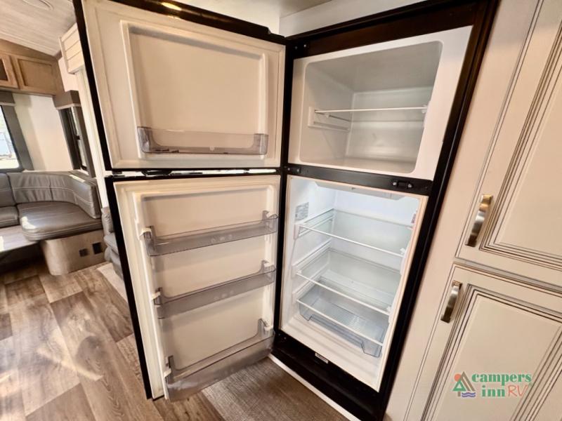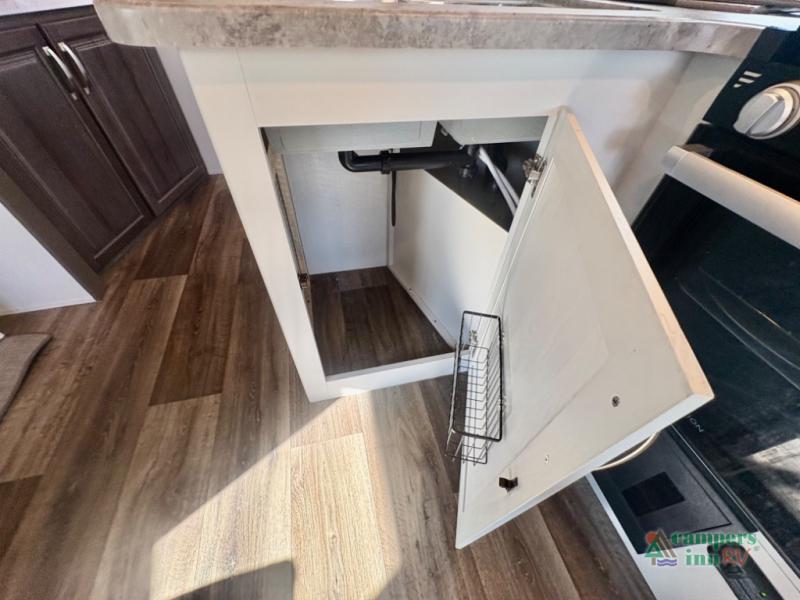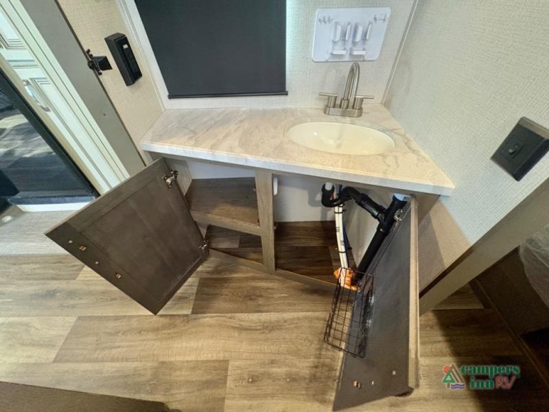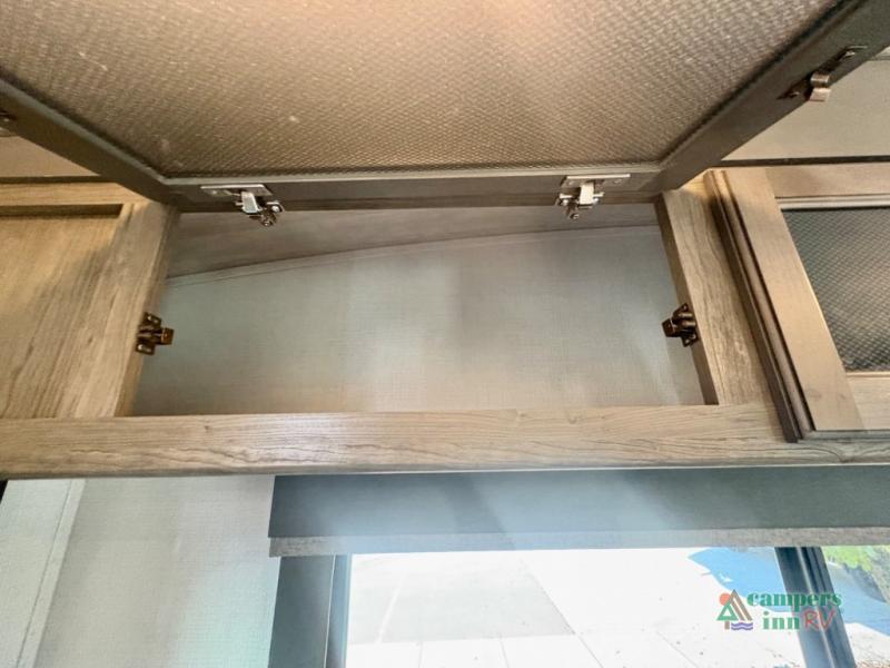 This Cougar Half-Ton travel trailer has an excellent dining area with its huge rear U-shaped dinette! Right next to the dinette is a large slide out that holds the 68" tri-fold sleeper sofa, 10.4 cu. ft. refrigerator, and a pantry. The kitchen has been excellently appointed with a Furrion range, foil-wrapped seamless countertops, a stainless steel undermount sink, and a microwave, and you will be grateful that you can access both sides of the walk-through bathroom. The private bedroom is ultra convenient with its exterior entrance, king-size bed, and wardrobe/nightstands on either side of the bed.