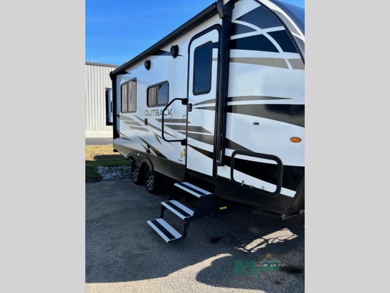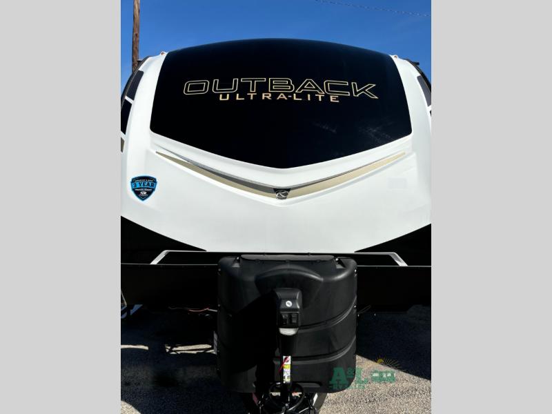 With any Outback Ultra Lite travel trailer or toy hauler by Keystone, you begin with a BAL Norco huck bolted "Z" channel frame, and there is a pinch rolled laminated gel-coated fiberglass exterior, a leaf spring suspension system, large panoramic black framed tinted safety glass windows, plus a power tongue jack and LCI power stabilizing jacks for easy setup. The interior offers pre-drilled and screwed hand-glazed modern cabinetry, extra tall slide height for maximum space, in-floor heating ducts, a Dream dinette with max-store for more storage space, and an On Demand hot water heater to mention a few highlights. Make your lightweight towing decision today, choose a comfortable and stylish Outback Ultra Lite today!