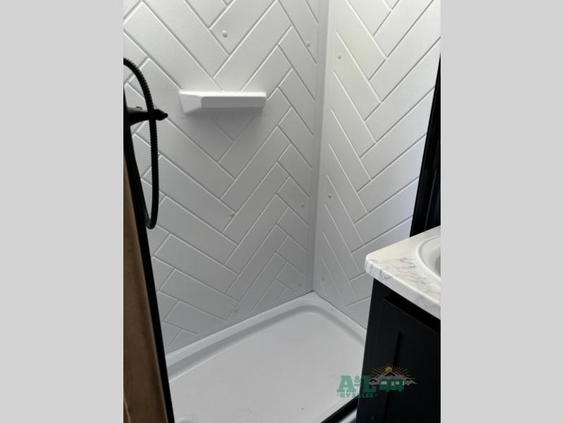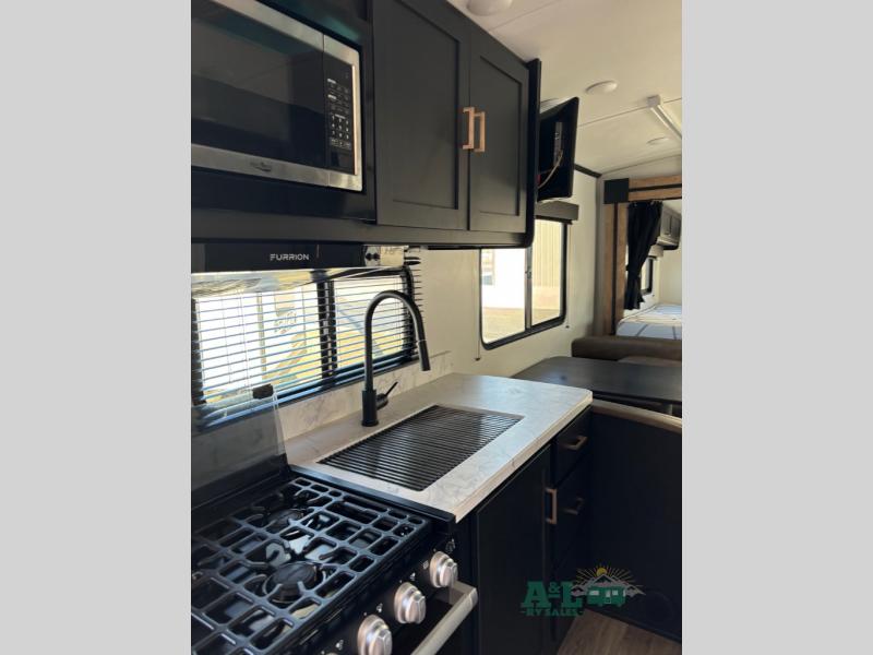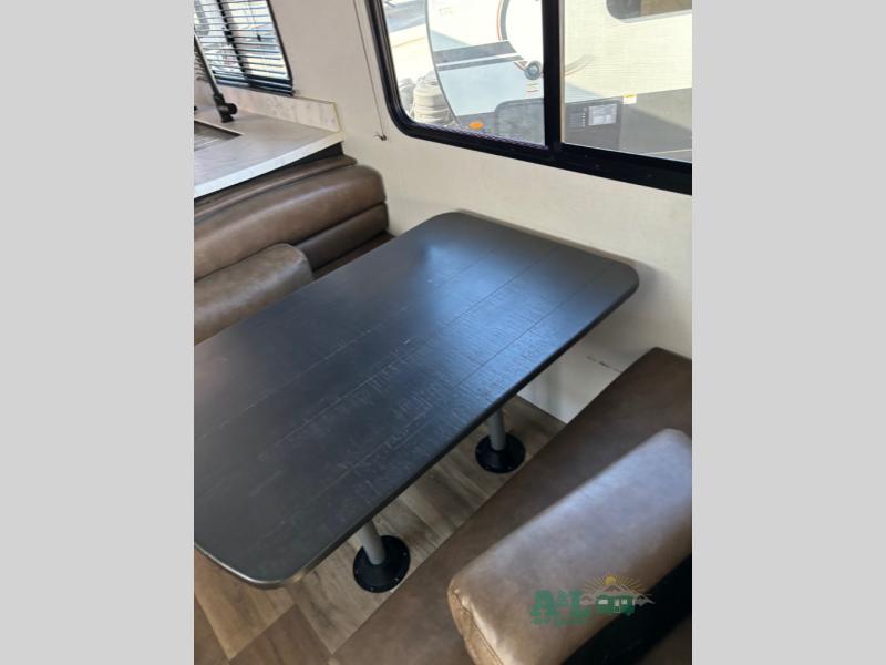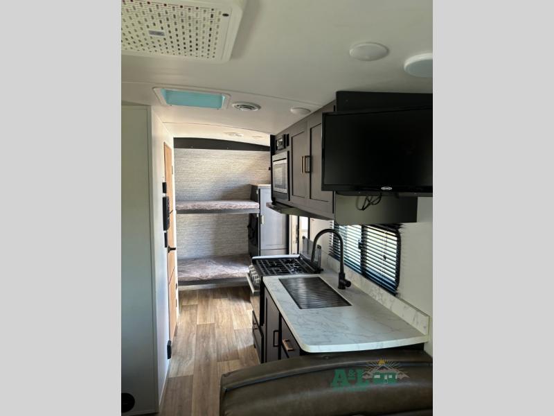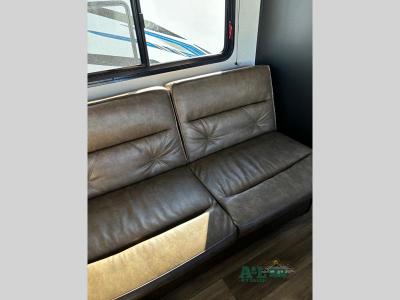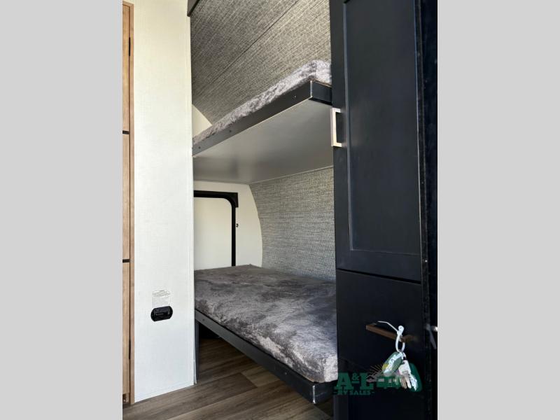 Looking to sleep like a king after hiking, biking or relaxing around the campsite? This trailer provides a rear slide king bed giving you more interior floor space and a comfortable place to sleep each night. Your friends can sleep on the front flip-down bunk beds and/or the sofa sleeper and booth dinette. The cook will have full kitchen amenities to whip up meals including a 10 cu. ft. refrigerator unless you would prefer the 8 cu. ft. option. There is an LCD TV to watch while sitting on the furniture while you take turns getting cleaned up in the full bathroom which also includes linen storage.