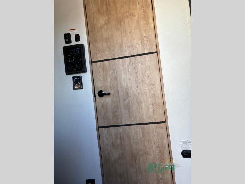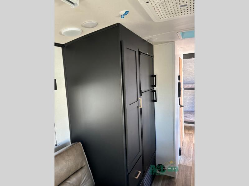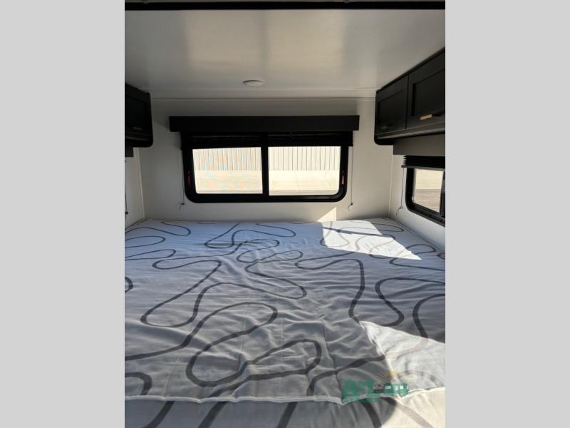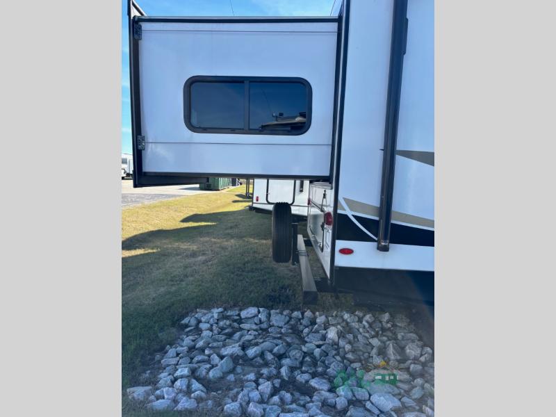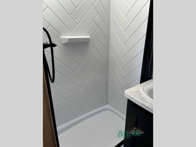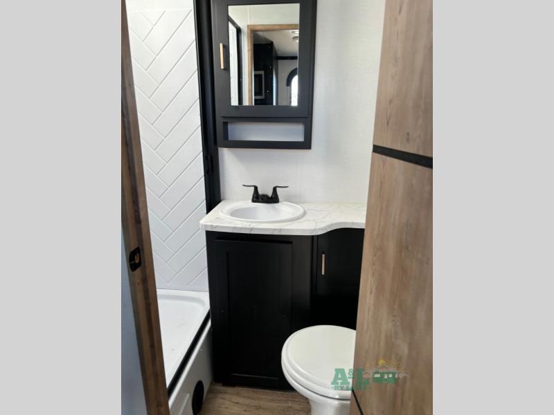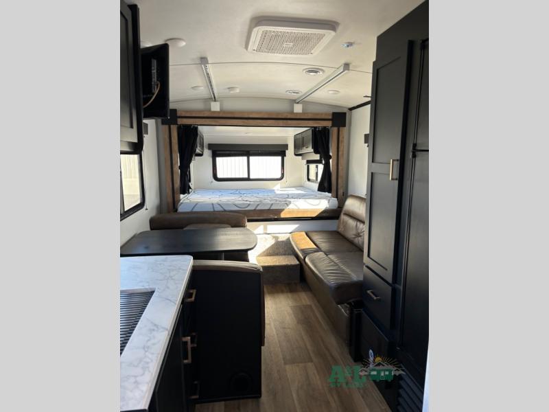 Looking to sleep like a king after hiking, biking or relaxing around the campsite? This trailer provides a rear slide king bed giving you more interior floor space and a comfortable place to sleep each night. Your friends can sleep on the front flip-down bunk beds and/or the sofa sleeper and booth dinette. The cook will have full kitchen amenities to whip up meals including a 10 cu. ft. refrigerator unless you would prefer the 8 cu. ft. option. There is an LCD TV to watch while sitting on the furniture while you take turns getting cleaned up in the full bathroom which also includes linen storage.