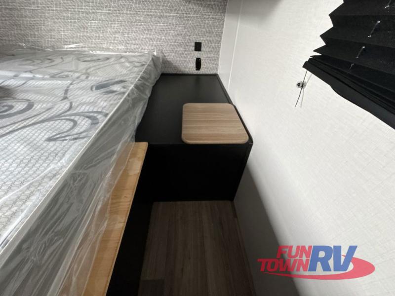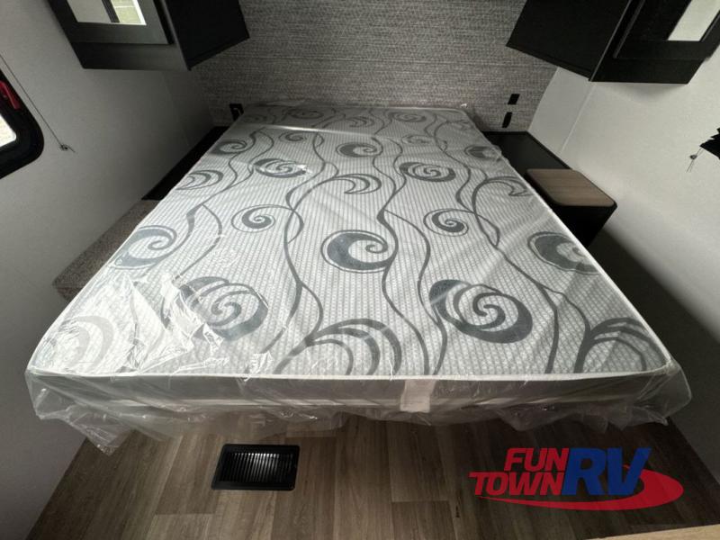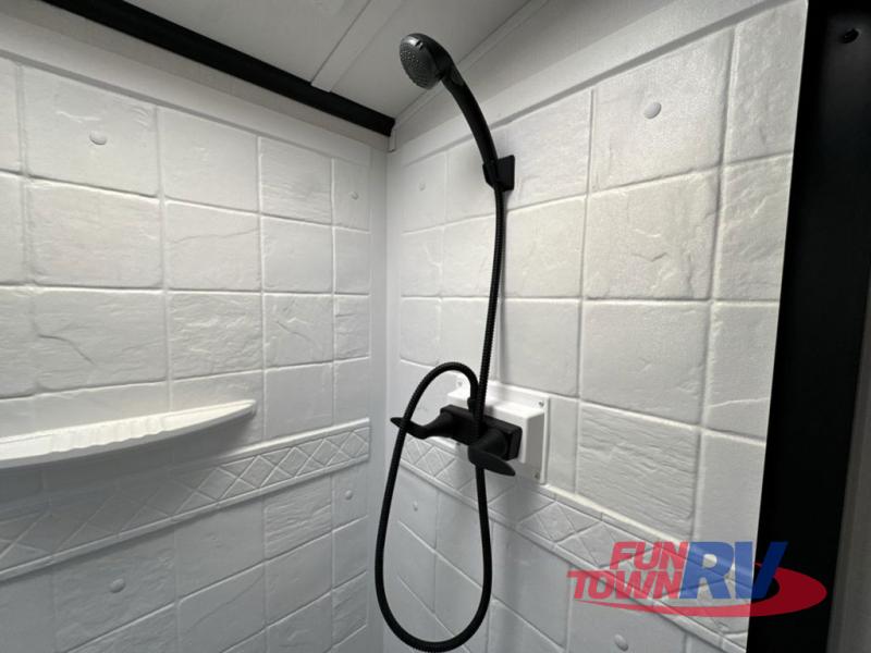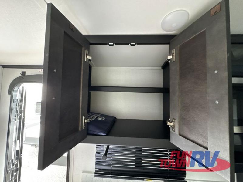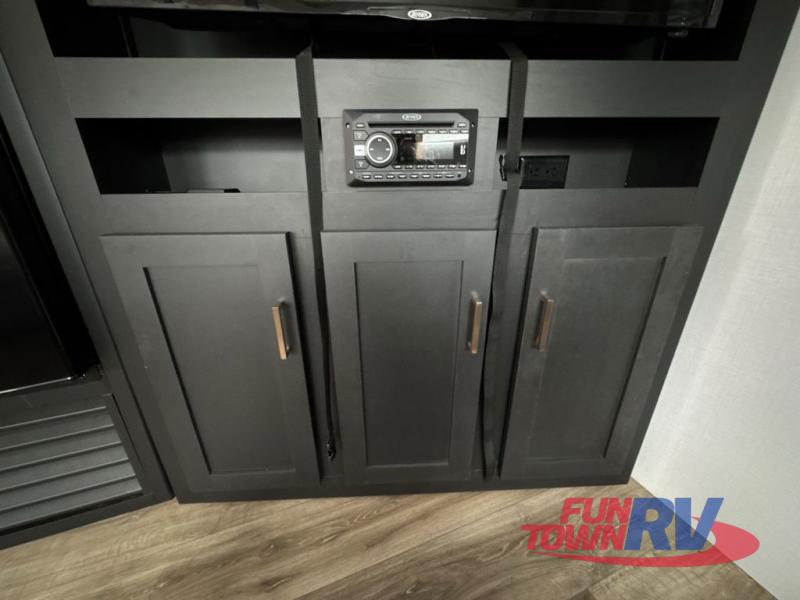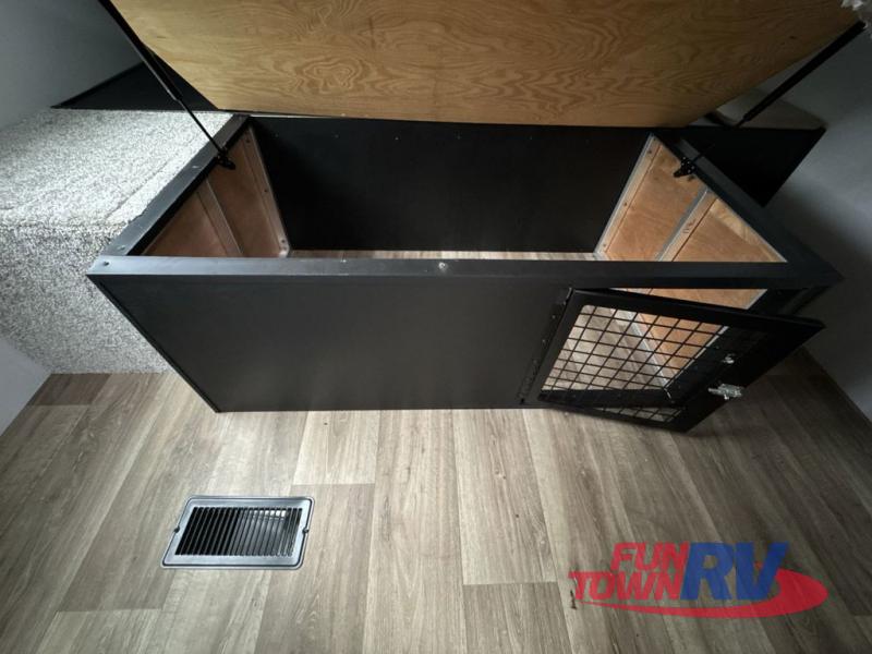 Get out and explore, hike, and camp in comfort! This trailer offers a private bunkhouse with double-size bunks and a wardrobe, a private front bedroom with a walk-around queen bed with a built-in pet kennel for your family's best friend, a laundry chute to keep everything tidy, and dual wardrobes for your clothing. You can access the walk-through bathroom from the bedroom and the main living and kitchen area through barn slider doors. Your guests can sleep on the sofa sleeper and booth dinette slide out while watching the 40" TV with entertainment center after grabbing some snacks from the hidden pantry. There are full kitchen amenities inside, plus there is an outside kitchen to use, a 21' awning offers protection from the elements, and a pass-through storage to carry your larger gear like fishing poles, an outdoor table, and camping chairs.