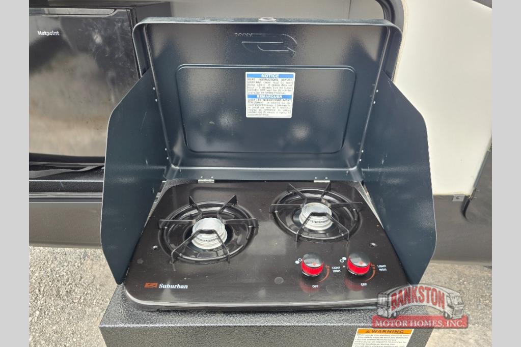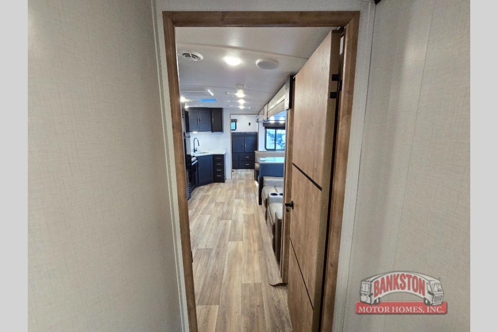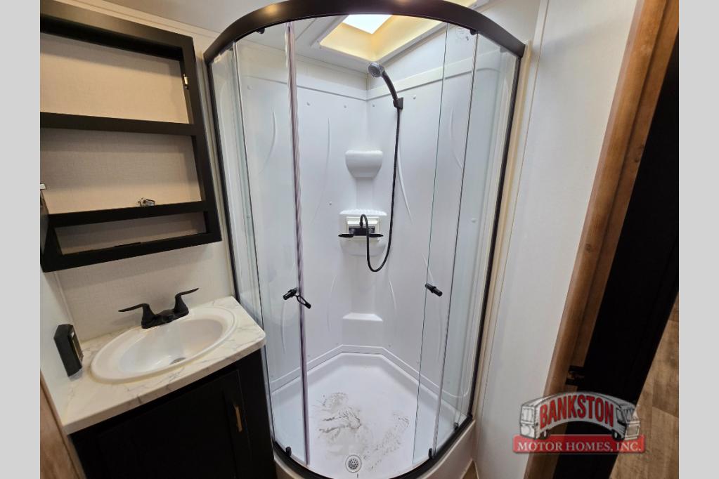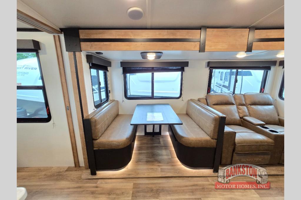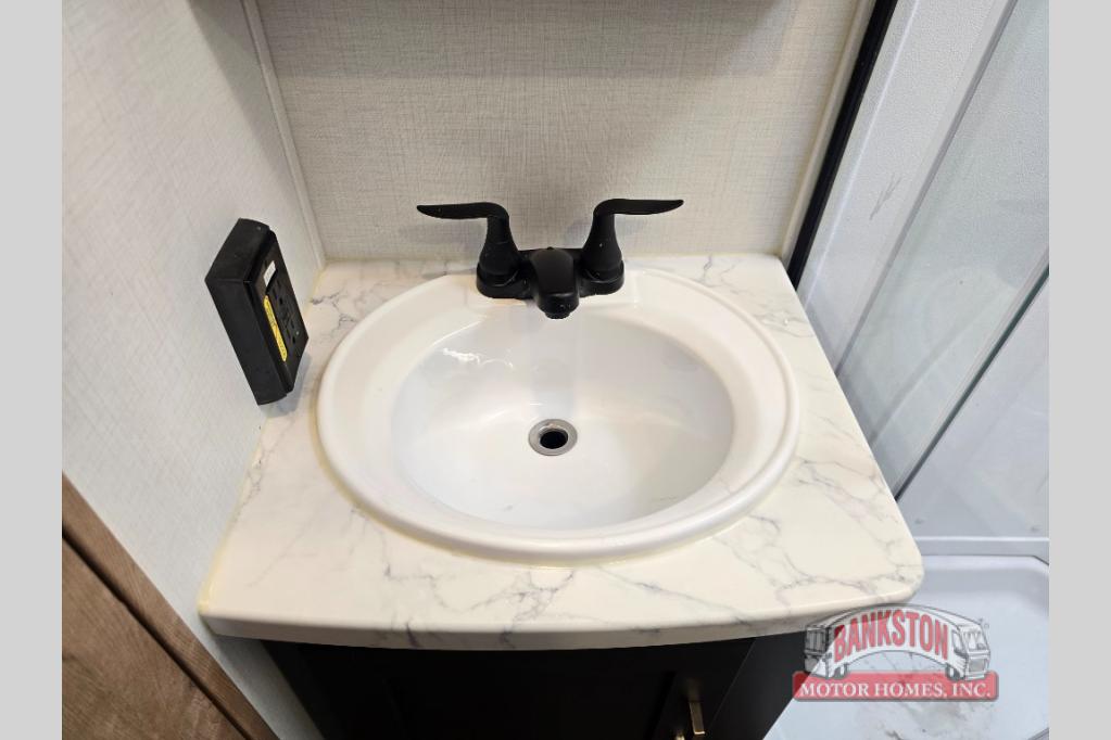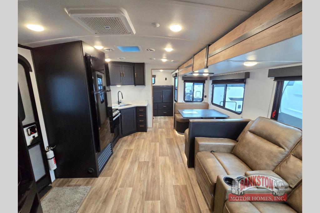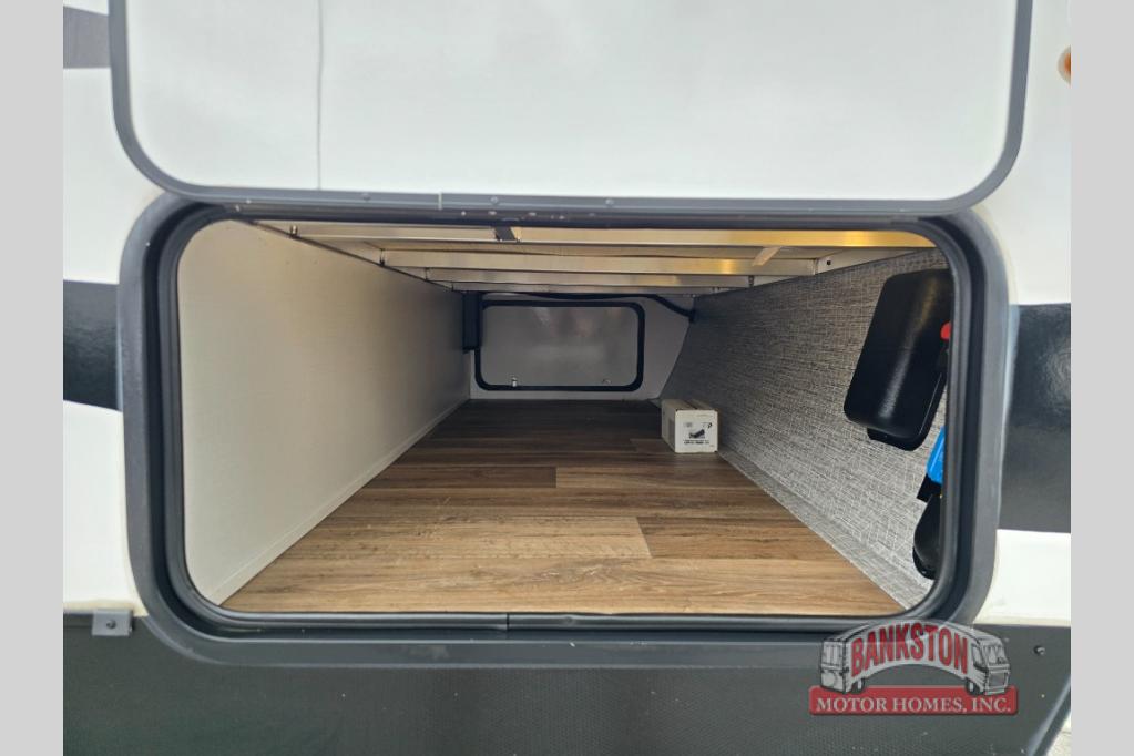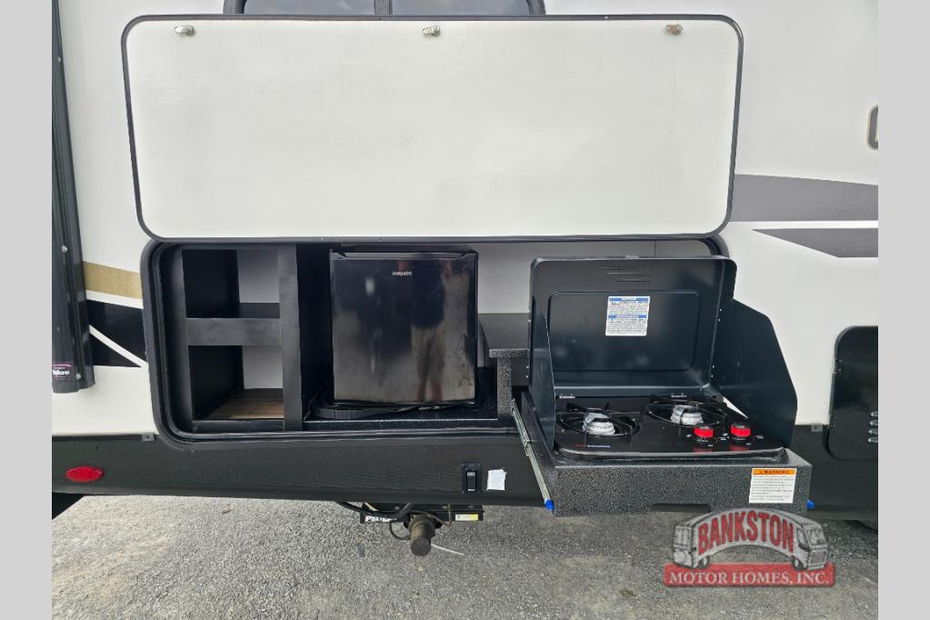 Loaded with features, you are sure to enjoy each and every camping trip in this trailer with your family and friends every chance you get! You can load up the pass-through storage with the larger camping gear like camp chairs, folding tables, charcoal and even fishing poles. The 21' awning offers an outdoor living area with some protection, the outside kitchen gives the cook choices when feeding everyone, and the LCI Solid Step entry allows a safe entrance and exit. There is a private rear bunkhouse with triple bunk beds, a sliding door for privacy and a window for views. The main living and kitchen area is spacious with a slide out booth dinette and sofa sleeper or choose the theater seating option. Everyone can gather to watch the 40" TV and enjoy the fireplace. You will also find a double entry bathroom, and a private front bedroom to sleep like a queen with your pet.