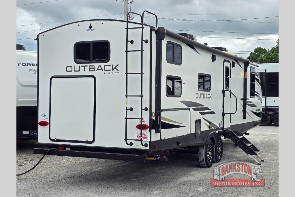 With any Outback Ultra Lite travel trailer or toy hauler by Keystone, you begin with a BAL Norco huck bolted "Z" channel frame, and there is a pinch rolled laminated gel-coated fiberglass exterior, a leaf spring suspension system, large panoramic black framed tinted safety glass windows, plus a power tongue jack and LCI power stabilizing jacks for easy setup. The interior offers pre-drilled and screwed hand-glazed modern cabinetry, extra tall slide height for maximum space, in-floor heating ducts, a Dream dinette with max-store for more storage space, and an On Demand hot water heater to mention a few highlights. Make your lightweight towing decision today, choose a comfortable and stylish Outback Ultra Lite today!