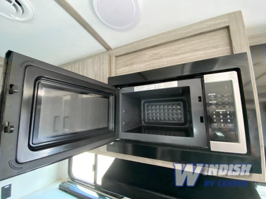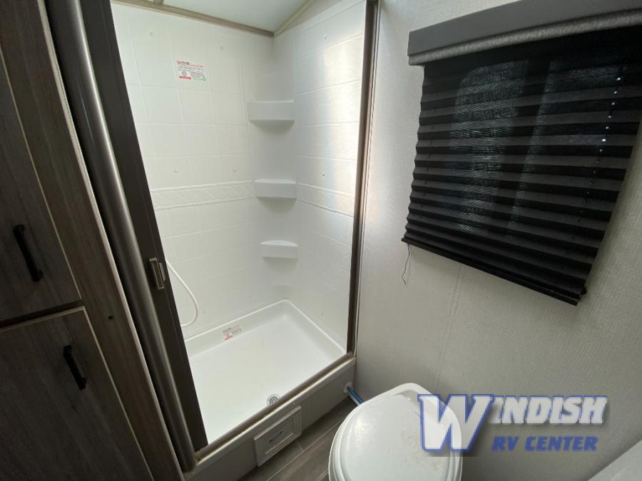 You won't even feel like you're camping in the woods with this travel trailer! It features a front private bedroom with a queen bed to lay your head on at night and wardrobes/nightstands on either side of it for your items. Prepare your best home cooked meals with the three burner cooktop and flip-up countertop, then enjoy them at the U-shaped dinette with the refrigerator right next to it so you don't have to go far for a drink refill. The dinette is also across from the entertainment center with a fireplace for a cozy evening indoors, plus you can switch out the dinette for an optional theater dinette. The full rear bathroom has a dual sink vanity for two to get ready at once and an area prepped to add an optional washer and dryer for clean clothes the whole trip!