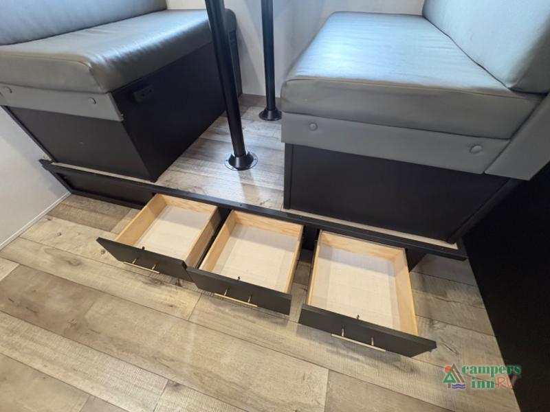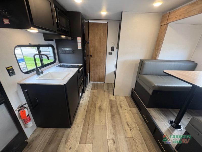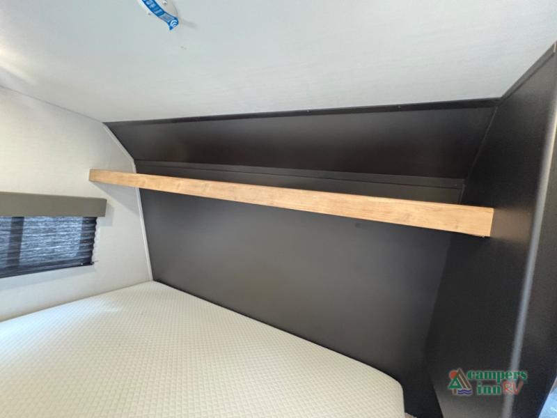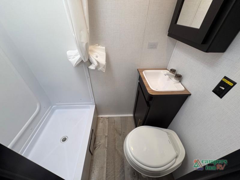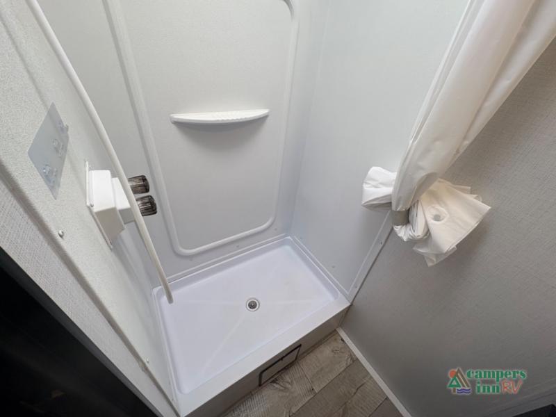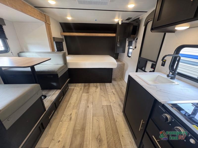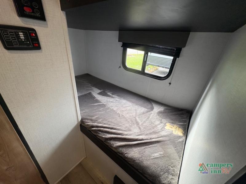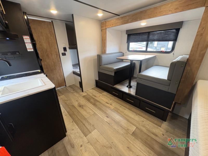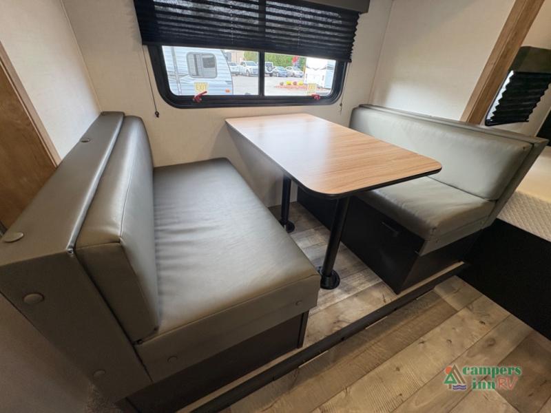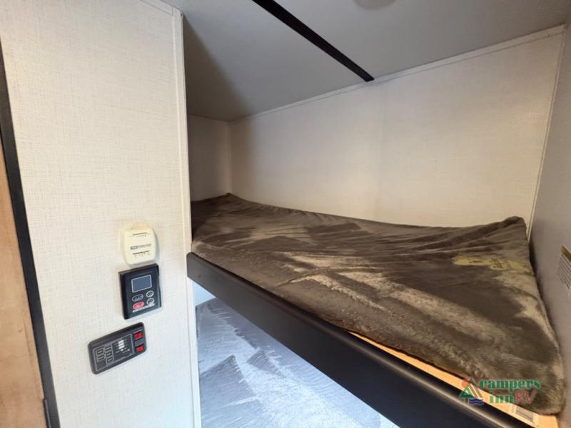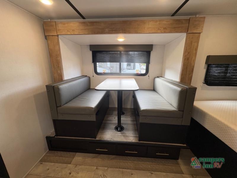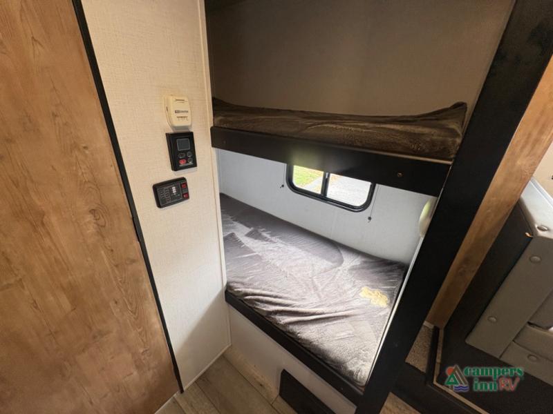 When you say "Camping" your kids will immediately think about sleeping on the bunk beds and playing outdoors! There is something about planning the trip that gets everyone excited, and once at your campsite, the excitement grows. You will have your own bed up front as well as a closet and nightstand for your things. The booth dinette doubles as sleeping space and includes drawers for storage, plus the slide provides more floor space. The cook can make warm meals in the galley kitchen, and the full bathroom will keep everyone refreshed and ready for the next day.