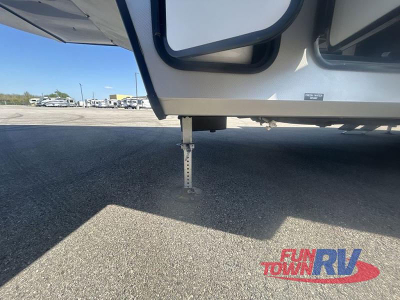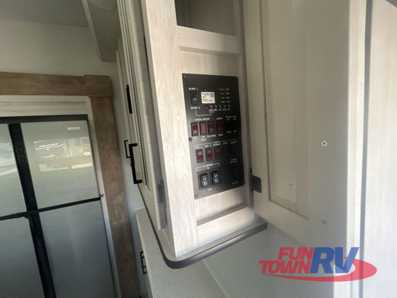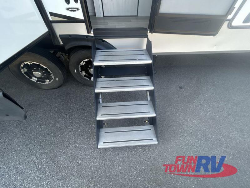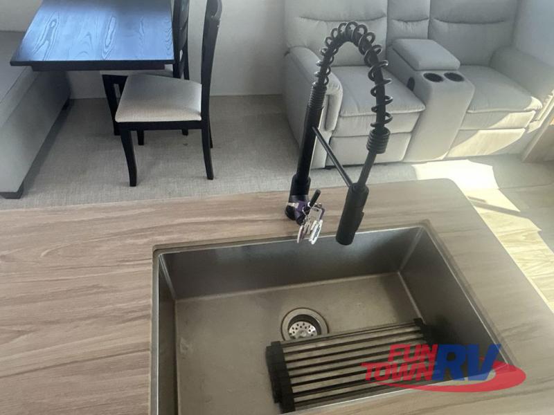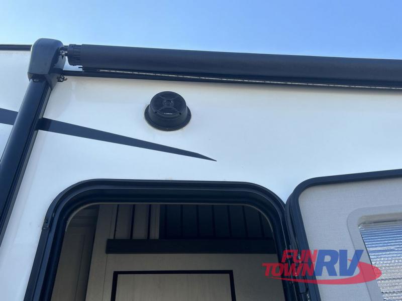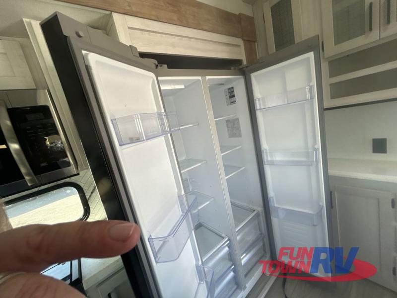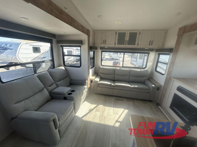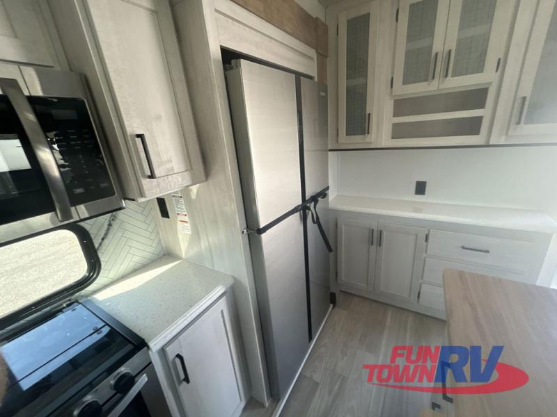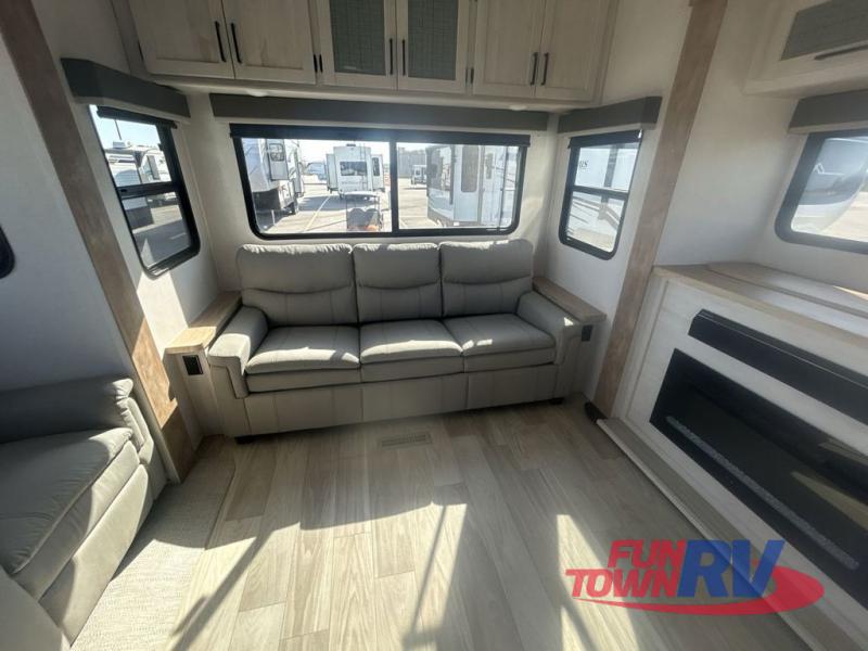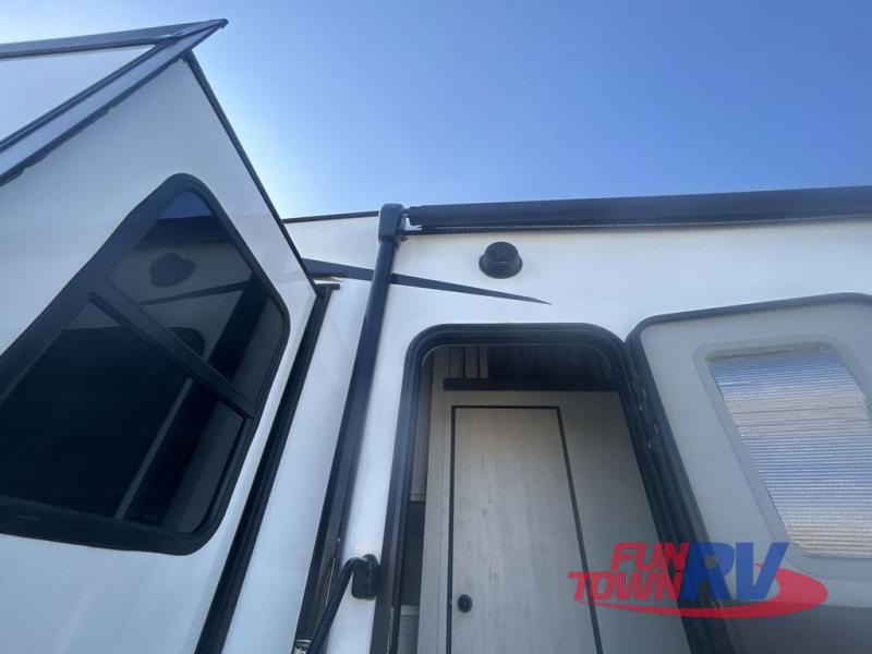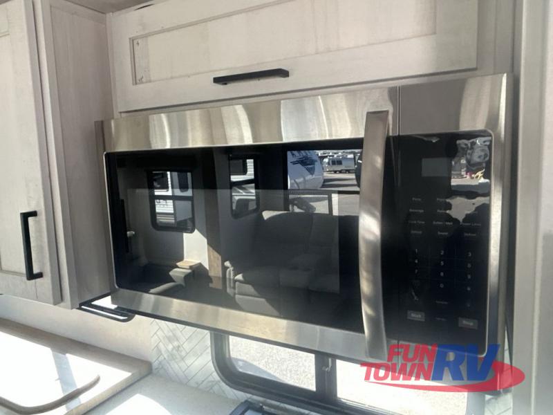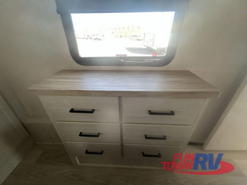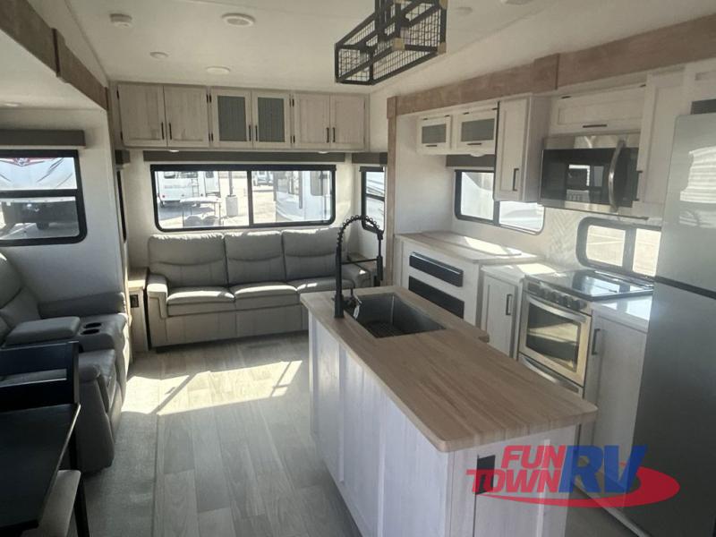 This fifth wheel is one your whole crew will love thanks to the middle bunkroom with a "Sleep & Play" sofa and an upper bunk! You will enjoy the front private bedroom all to yourselves with a king bed slide out, a large closet with washer and dryer prep, plus a dresser for more storage. When you're not outdoors relaxing under the 19' electric awning with LED lights, head to the rear living area to sit back on the theater seating or the hide-a-bed sofa. You'll also find an LED TV here and a booth dinette for game night. The chef will love the outside kitchen just as much as the indoor kitchen with a butcher block top, two pantries, plus a 30" residential style microwave!