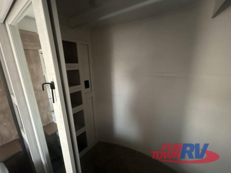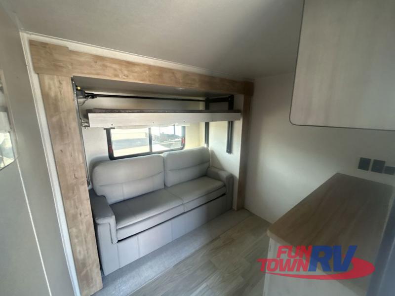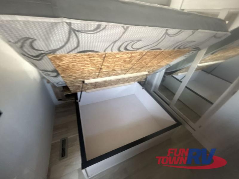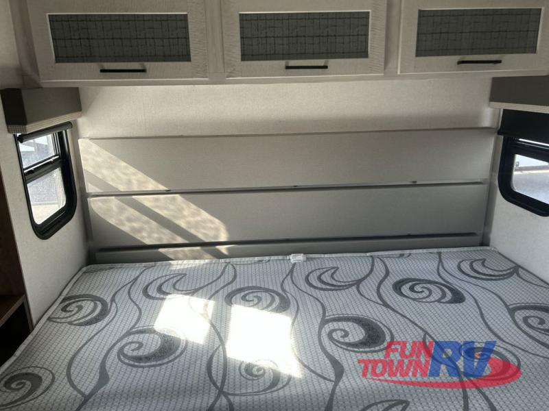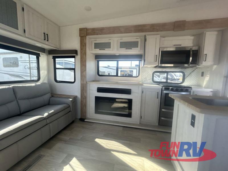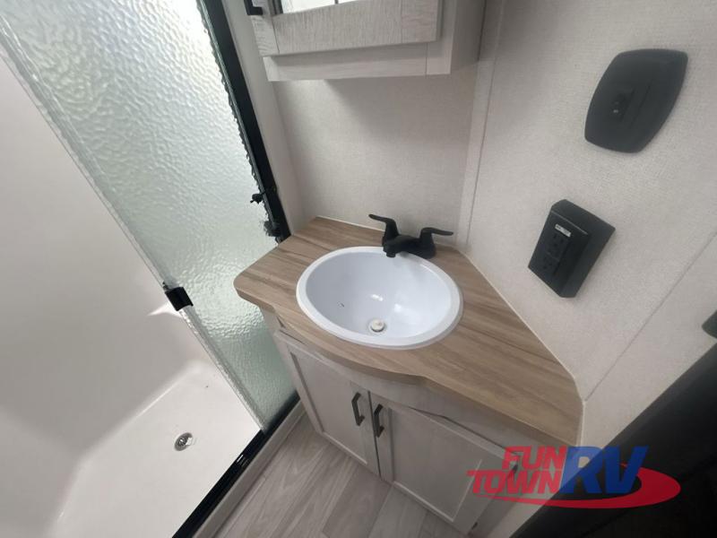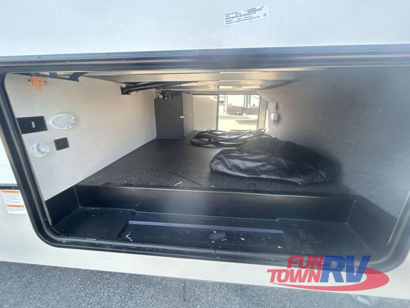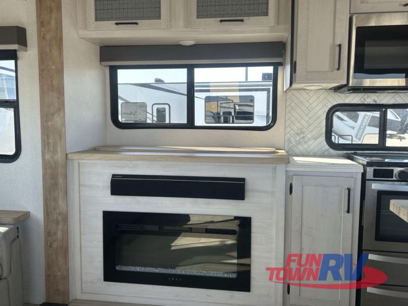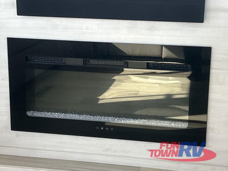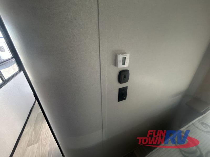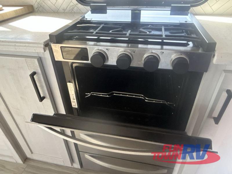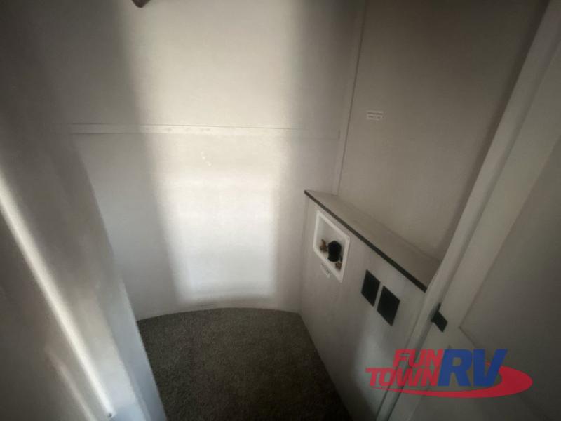This fifth wheel is one your whole crew will love thanks to the middle bunkroom with a "Sleep & Play" sofa and an upper bunk! You will enjoy the front private bedroom all to yourselves with a king bed slide out, a large closet with washer and dryer prep, plus a dresser for more storage. When you're not outdoors relaxing under the 19' electric awning with LED lights, head to the rear living area to sit back on the theater seating or the hide-a-bed sofa. You'll also find an LED TV here and a booth dinette for game night. The chef will love the outside kitchen just as much as the indoor kitchen with a butcher block top, two pantries, plus a 30" residential style microwave!