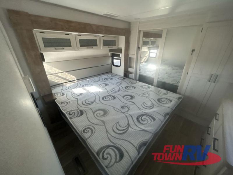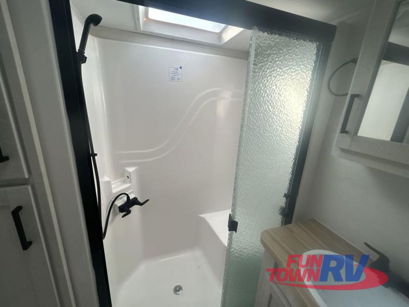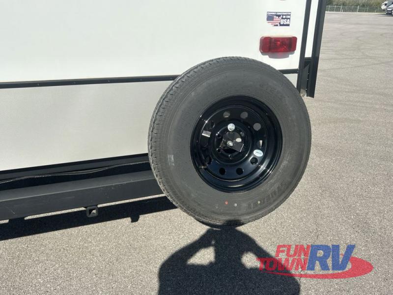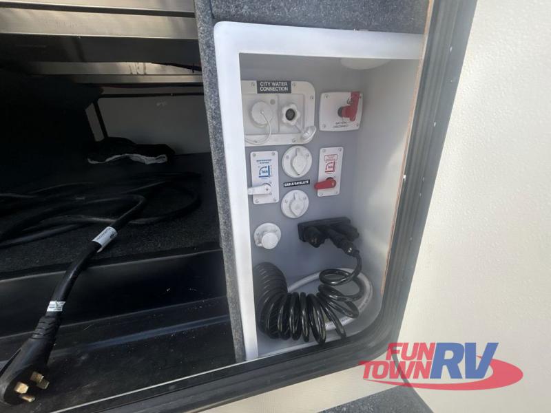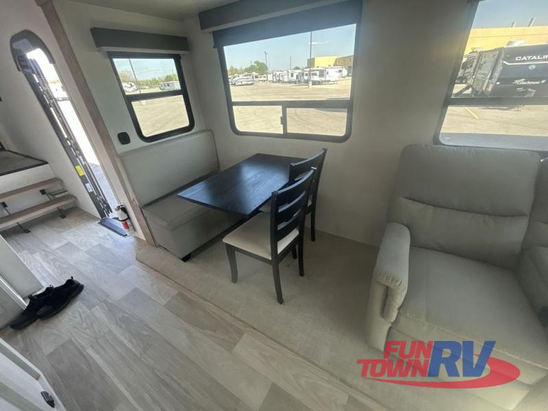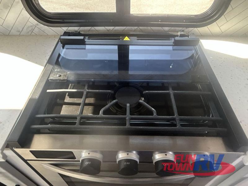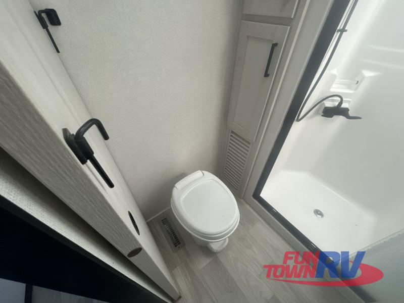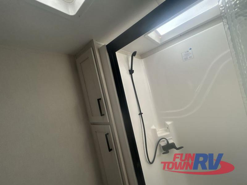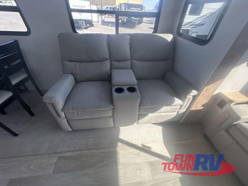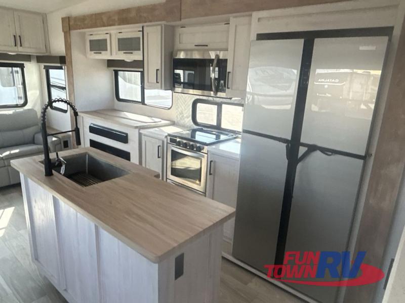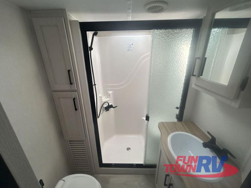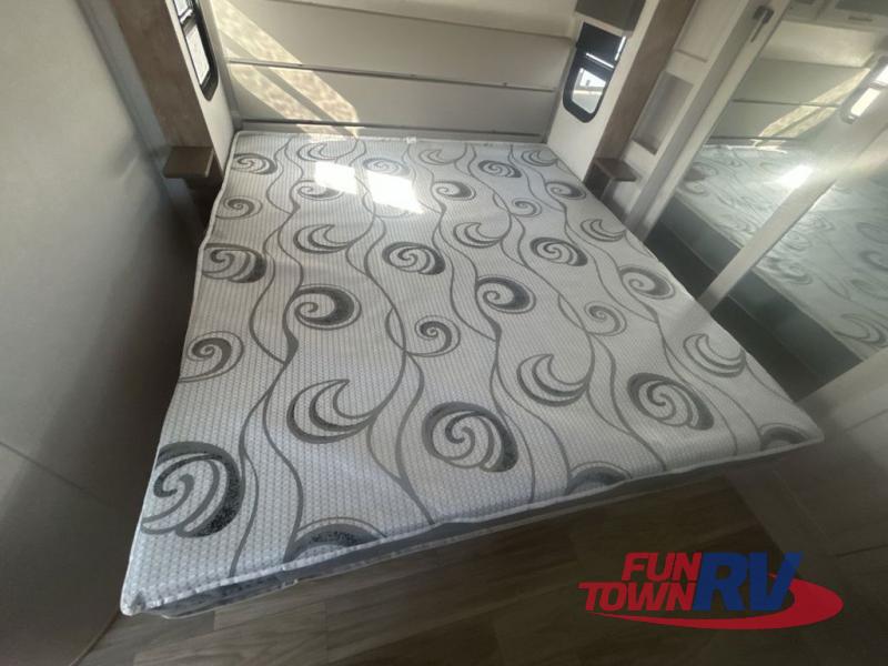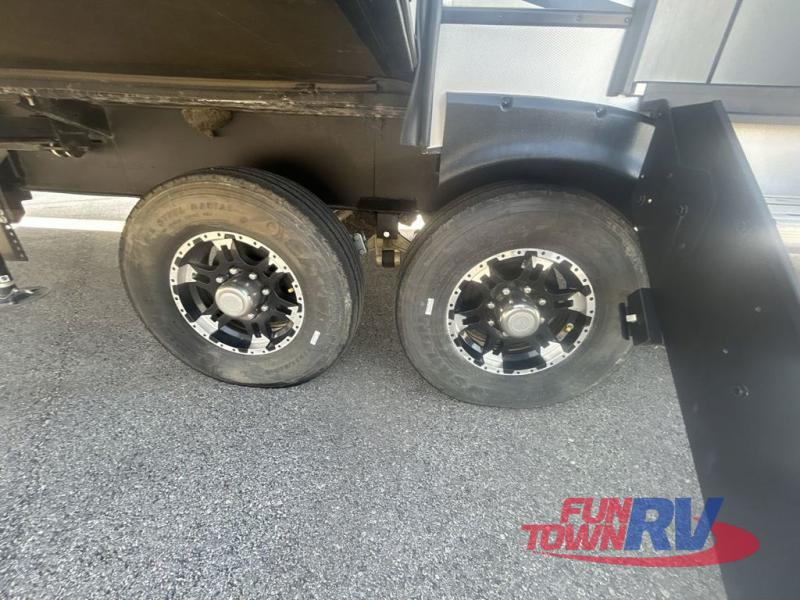 This fifth wheel is one your whole crew will love thanks to the middle bunkroom with a "Sleep & Play" sofa and an upper bunk! You will enjoy the front private bedroom all to yourselves with a king bed slide out, a large closet with washer and dryer prep, plus a dresser for more storage. When you're not outdoors relaxing under the 19' electric awning with LED lights, head to the rear living area to sit back on the theater seating or the hide-a-bed sofa. You'll also find an LED TV here and a booth dinette for game night. The chef will love the outside kitchen just as much as the indoor kitchen with a butcher block top, two pantries, plus a 30" residential style microwave!