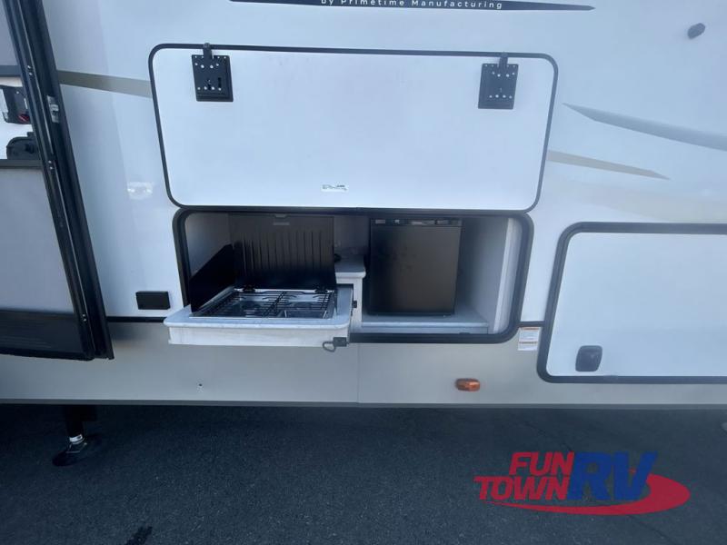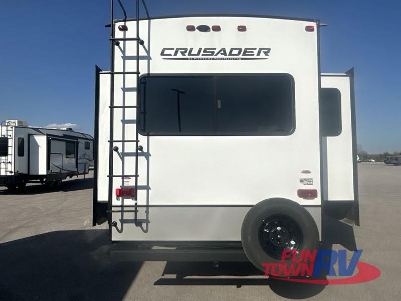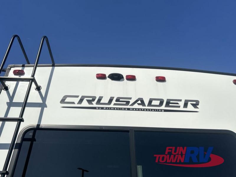 The Crusader fifth wheels by Prime Time RV are a step above the rest and it's not hard to see why. Each model has been constructed to last with its exclusive Eternabond construction, a one-piece TPO roof, and high gloss gel coat fiberglass exterior. The auto leveling system and the comprehensive universal docking center will have you set up to camp in no-time, and there is a convenient bottle opener and Doggy D-ring for your furry companions. You will fall in love with the interior that includes solid surface countertops, designer Carefree linoleum with Scotchgard technology, hardwood cabinet doors, and many more residential comforts. The Crusader also comes standard with dual "Whisper Quiet" ducted A/C's, a 35,000 BTU high capacity gas furnace, and the Extreme Thermal Package Plus, making your camping season year-around!
