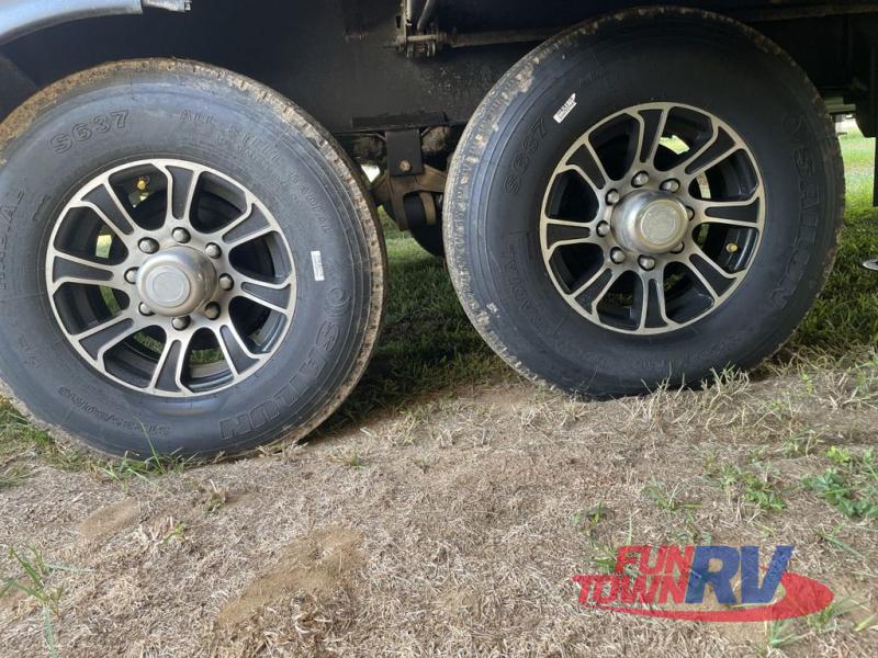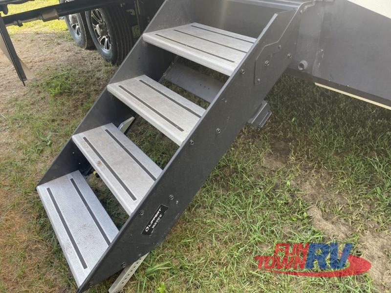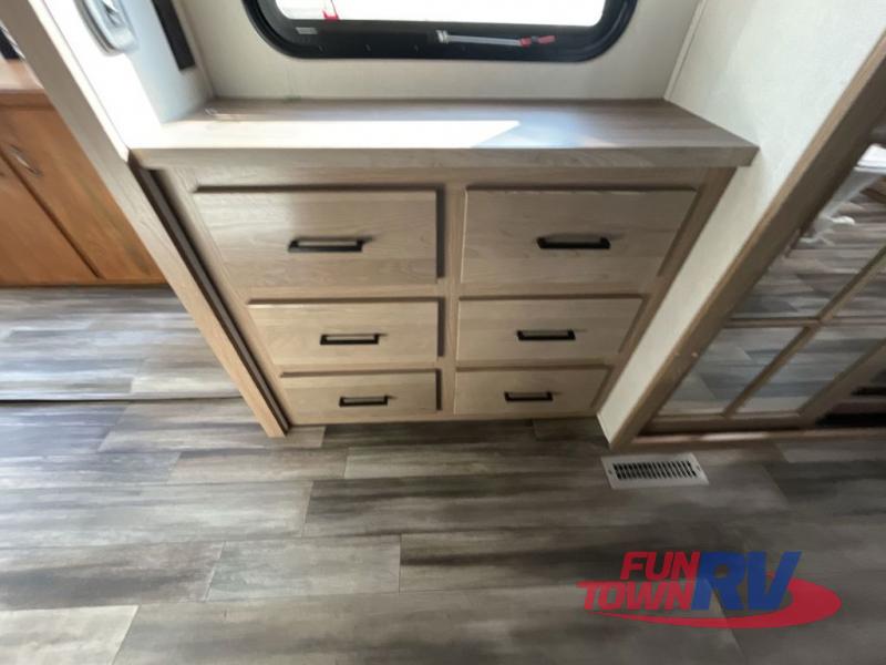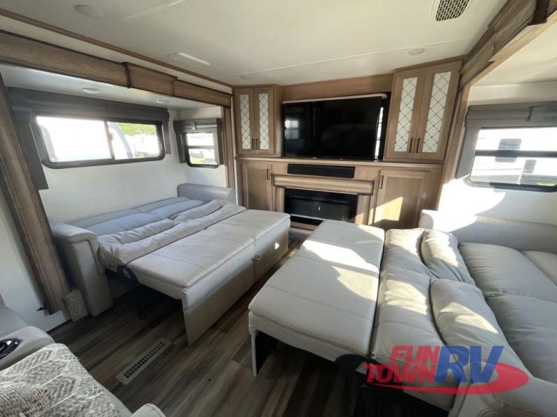 Experience a home away from home with this fifth wheel! The front living area has opposing EZ glide couches and 65" power theater seating across from the front entertainment center with a fireplace and 50" LED pop-up TV to watch your favorite movies. Just grab a snack from the walk-in pantry, pop a bag of popcorn in the microwave, and grab a cold drink from the 15 cu. ft. residential refrigerator then you're all set. The private bedroom has a 72" x 80" king bed slide for more walking around space and a dresser with wardrobes on either side to keep your clothes looking nice, plus it leads directly into the full rear bathroom. Two can get ready at once in the bathroom with the dual sink vanity and there is a linen closet for your towels, plus a second linen closet that is prepped to add an optional washer and dryer so you can extend your trip with clean clothes!