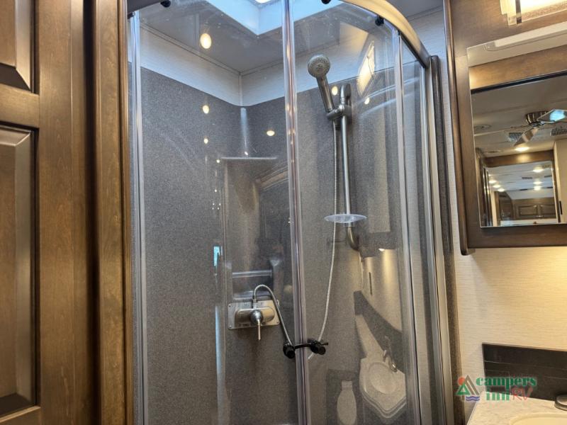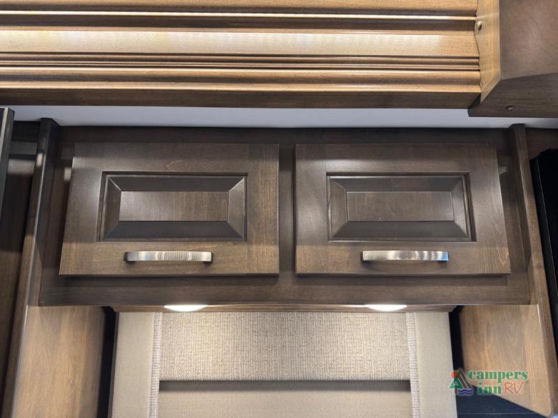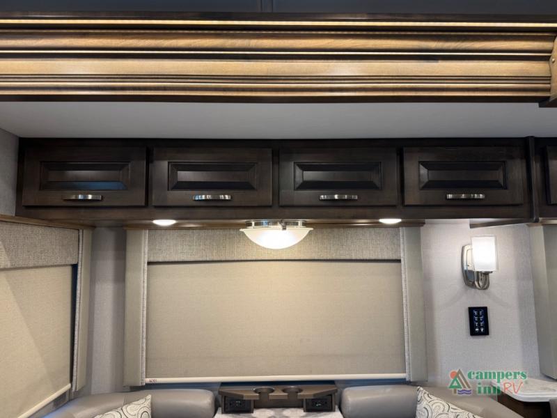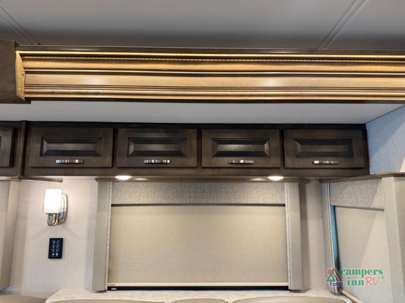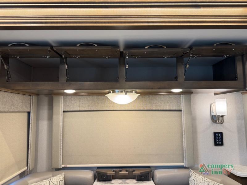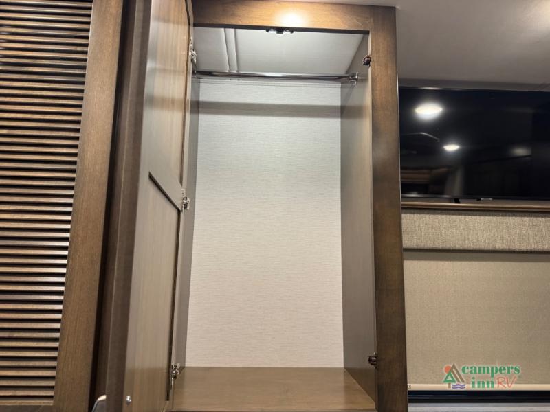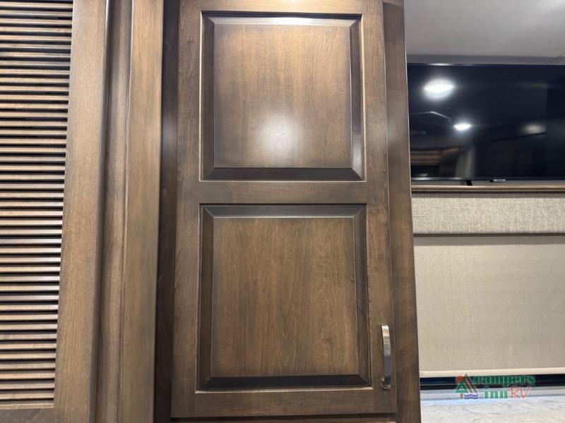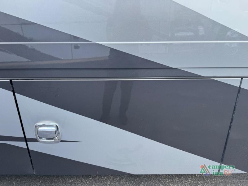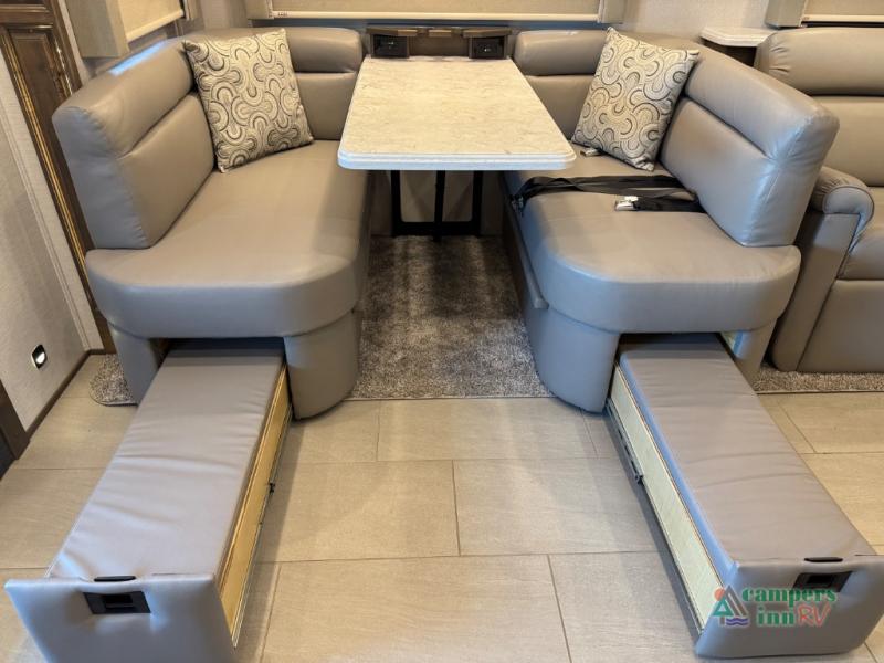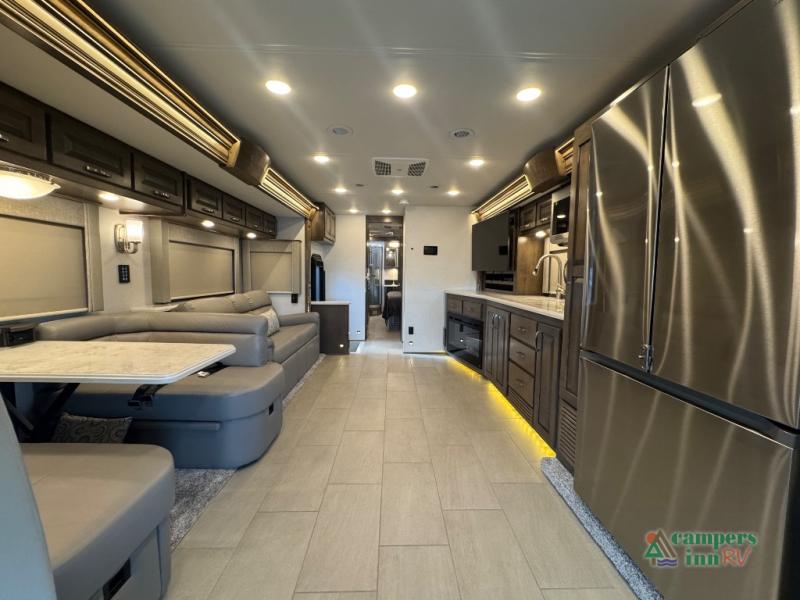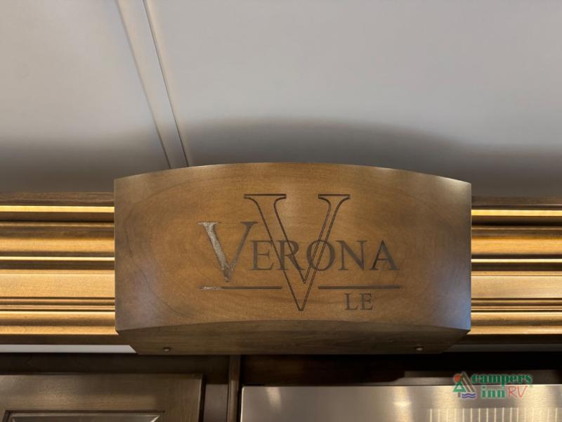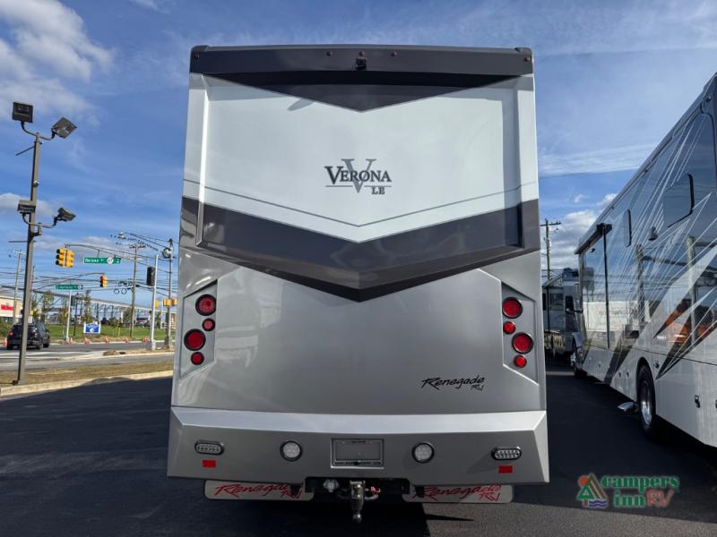 Renegade Verona LE Super C diesel motorhome 40LRB highlights: Bath and a Half Mid-Coach Entry Convertible Booth Dinette Master Suite Exterior 43" LED TV You and your spouse can dream about your next adventure while sleeping on your own iRelax memory foam mattress in the master suite with a full bathroom including a radius shower and linen storage. If you have overnight guests, they can sleep on the hide-a-bed sofa plus the dinette once converted for bedtime. And the mid-coach half bath will be all theirs. The chef-inspired kitchen offers a convection microwave, an induction cooktop and a residential refrigerator, plus more! You can entertain inside while watching the 50" 4K Smart LED TV or outside under the electric awning while enjoying the exterior 43" 4K LED TV with USB charging. There are so many more luxury and tech features to enjoy, plus a few options to add if you wish. Take a look at the list. Each Verona LE Super C diesel coach is built for the long haul from the end cap construction with a two-piece design allowing you to only replace the bottom half if chips and dings add up and the "Super Sandwich" floor construction to the Cummins 350 HP engine and Allision 3200TRV transmission allowing you to enjoy the drive as much as the destination. Other impressive features include the centralized command center with LED motion-activated lighting, the Aqua Hot hydronic heating system for radiant heating and continuous on-demand hot water, and the coach being all electric with one 3,000-watt magnum hybrid inverter. The Lambright Ultraleather furniture, the polished porcelain tile flooring, and the solid hardwood cabinetry are a few more reasons you will love the Verona LE you choose!
