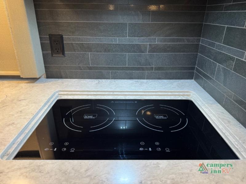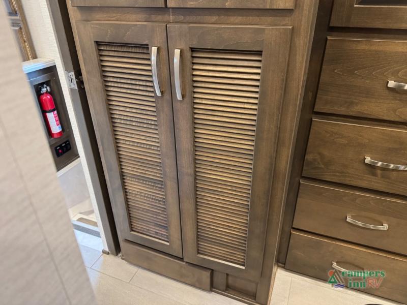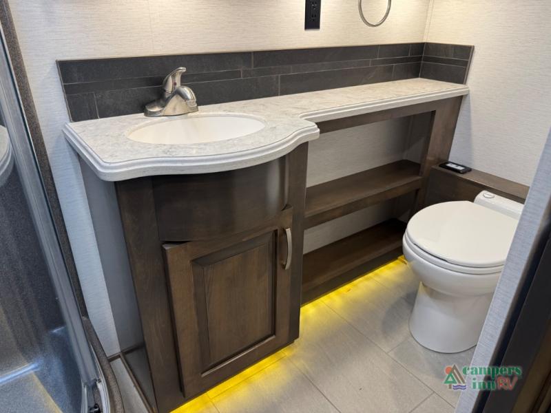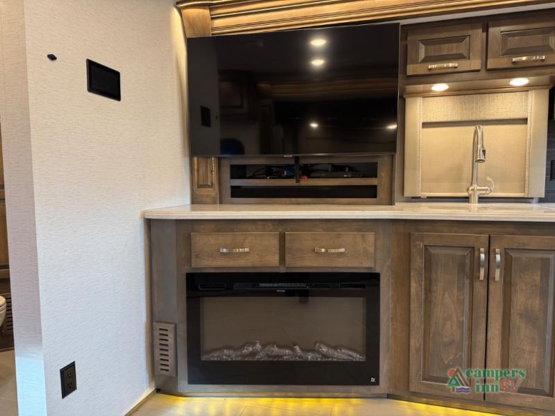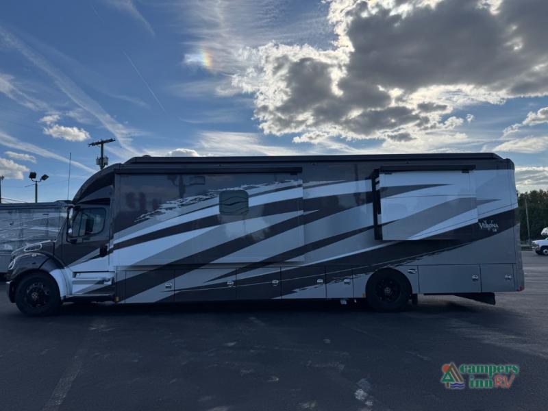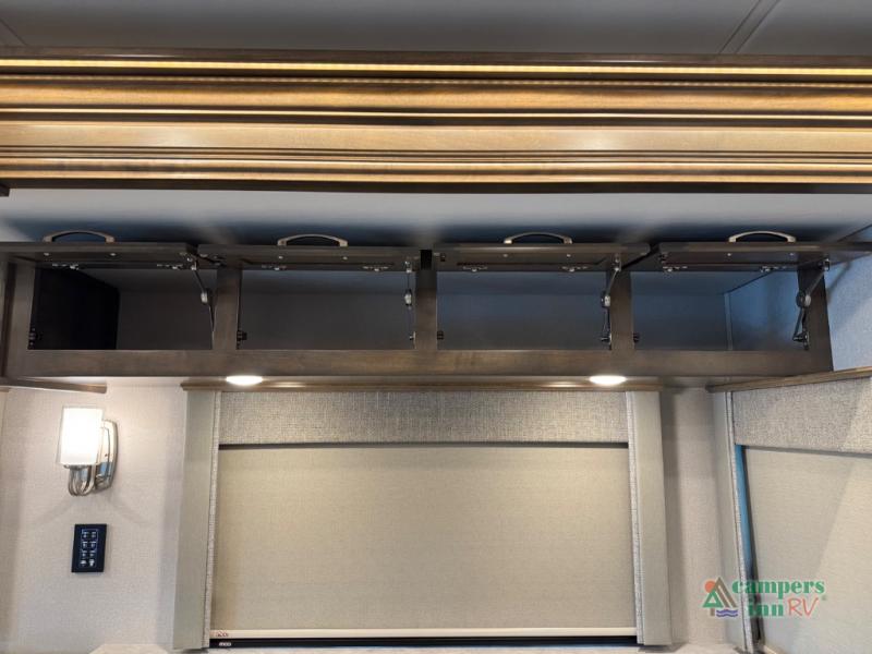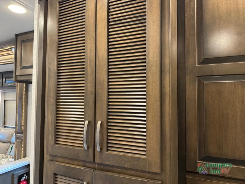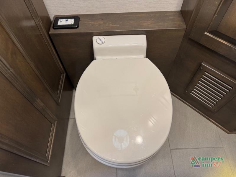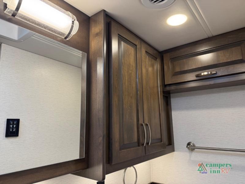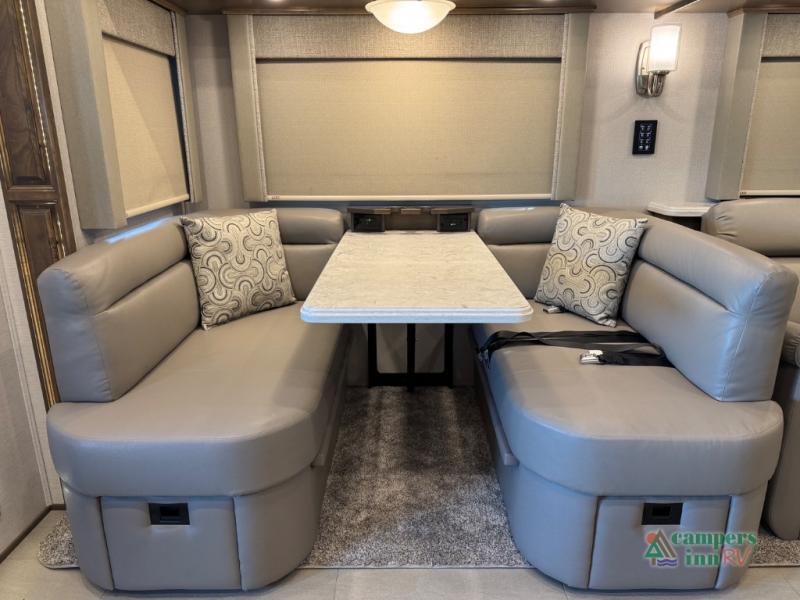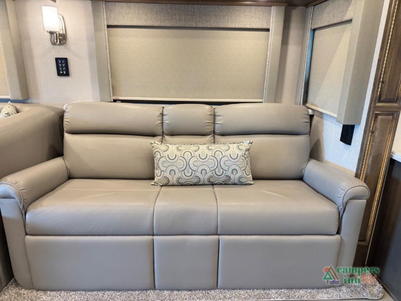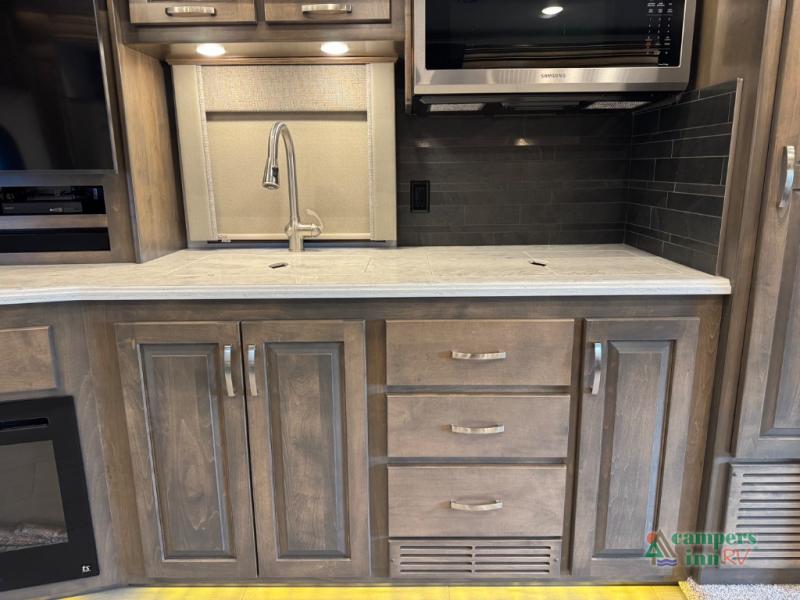 Renegade Verona LE Super C diesel motorhome 40LRB highlights: Bath and a Half Mid-Coach Entry Convertible Booth Dinette Master Suite Exterior 43" LED TV You and your spouse can dream about your next adventure while sleeping on your own iRelax memory foam mattress in the master suite with a full bathroom including a radius shower and linen storage. If you have overnight guests, they can sleep on the hide-a-bed sofa plus the dinette once converted for bedtime. And the mid-coach half bath will be all theirs. The chef-inspired kitchen offers a convection microwave, an induction cooktop and a residential refrigerator, plus more! You can entertain inside while watching the 50" 4K Smart LED TV or outside under the electric awning while enjoying the exterior 43" 4K LED TV with USB charging. There are so many more luxury and tech features to enjoy, plus a few options to add if you wish. Take a look at the list. Each Verona LE Super C diesel coach is built for the long haul from the end cap construction with a two-piece design allowing you to only replace the bottom half if chips and dings add up and the "Super Sandwich" floor construction to the Cummins 350 HP engine and Allision 3200TRV transmission allowing you to enjoy the drive as much as the destination. Other impressive features include the centralized command center with LED motion-activated lighting, the Aqua Hot hydronic heating system for radiant heating and continuous on-demand hot water, and the coach being all electric with one 3,000-watt magnum hybrid inverter. The Lambright Ultraleather furniture, the polished porcelain tile flooring, and the solid hardwood cabinetry are a few more reasons you will love the Verona LE you choose!