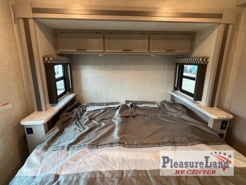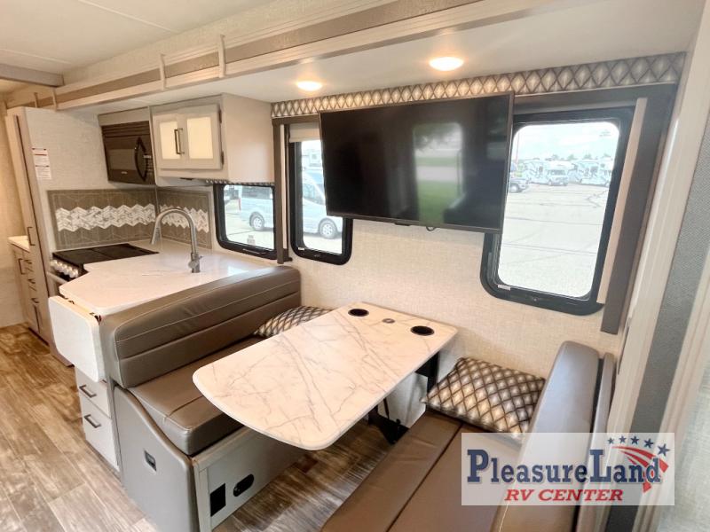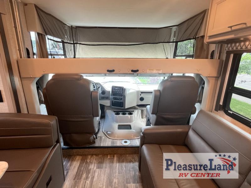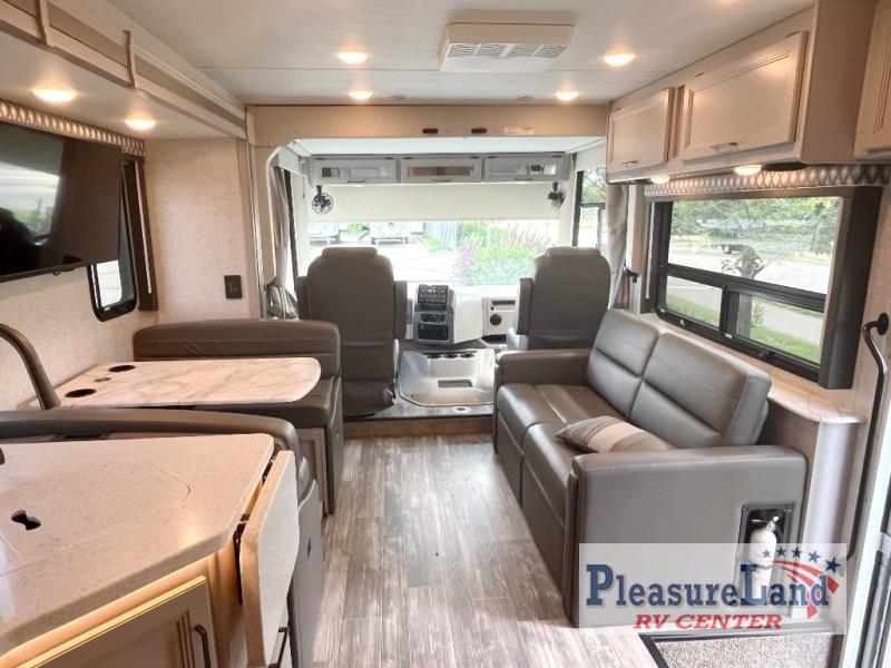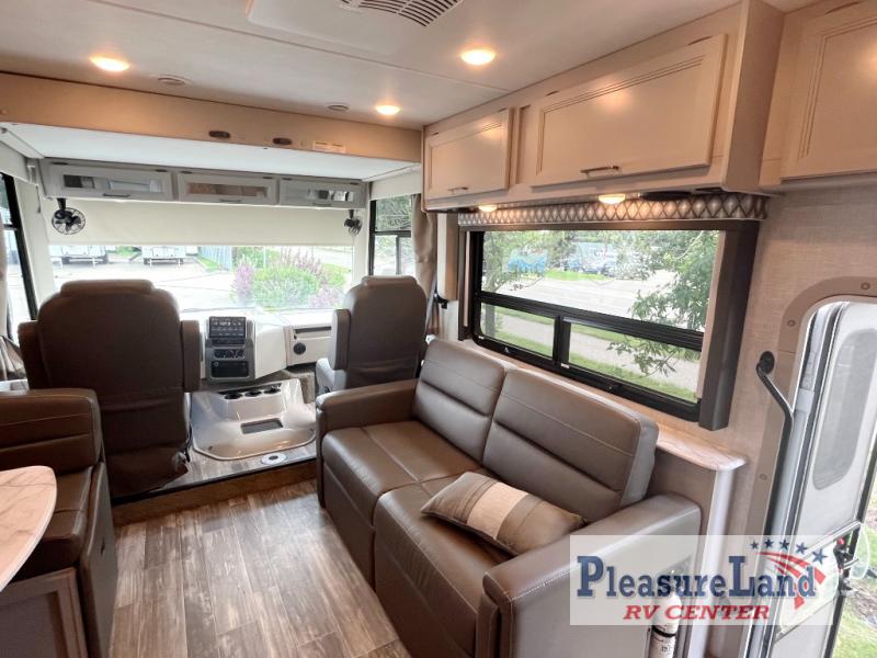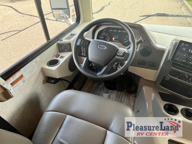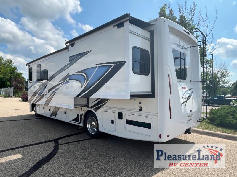 With any Hurricane Class A gas motorhome by Thor Motor Coach you will appreciate solid construction materials, like the welded tubular steel floor and the Vacu-Bond laminated roof, walls, and floor with block foam insulation. Each model sits on a Ford F-53 chassis with a 7.3L Triton V8 engine for power you can feel, plus there is an 8,000 lb. trailer hitch with a 7-pin round connector to pull your car along. The Rapid Camp+ multiplex system with Bluetooth will allow you to easily set up camp from the convenient 7" touchscreen provided, and the Winegard ConnecT WiFi extender +4G will let you catch up on work if needed. The Hurricane includes pressed laminated countertops inside, as well as residential vinyl flooring, decorative glass and tile backsplash in the kitchen, and many more at-home comforts.