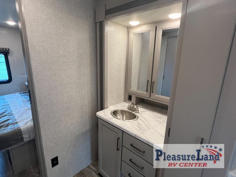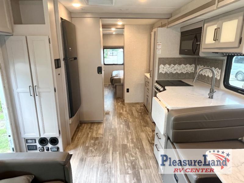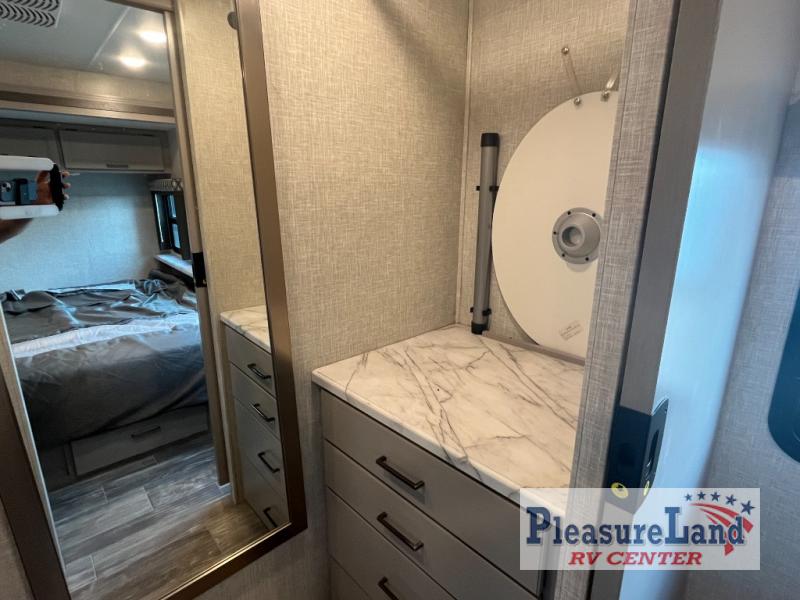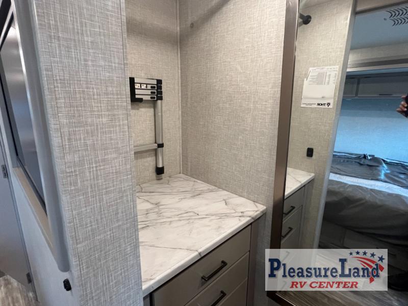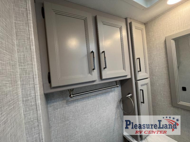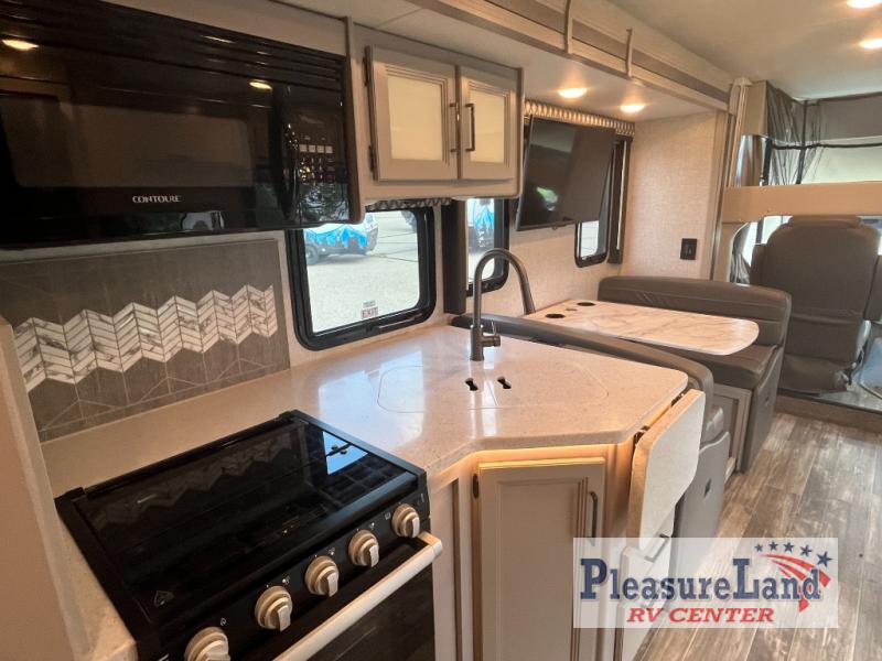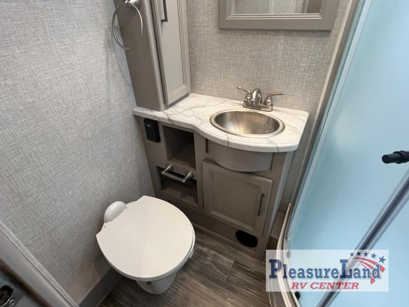 With any Hurricane Class A gas motorhome by Thor Motor Coach you will appreciate solid construction materials, like the welded tubular steel floor and the Vacu-Bond laminated roof, walls, and floor with block foam insulation. Each model sits on a Ford F-53 chassis with a 7.3L Triton V8 engine for power you can feel, plus there is an 8,000 lb. trailer hitch with a 7-pin round connector to pull your car along. The Rapid Camp+ multiplex system with Bluetooth will allow you to easily set up camp from the convenient 7" touchscreen provided, and the Winegard ConnecT WiFi extender +4G will let you catch up on work if needed. The Hurricane includes pressed laminated countertops inside, as well as residential vinyl flooring, decorative glass and tile backsplash in the kitchen, and many more at-home comforts.