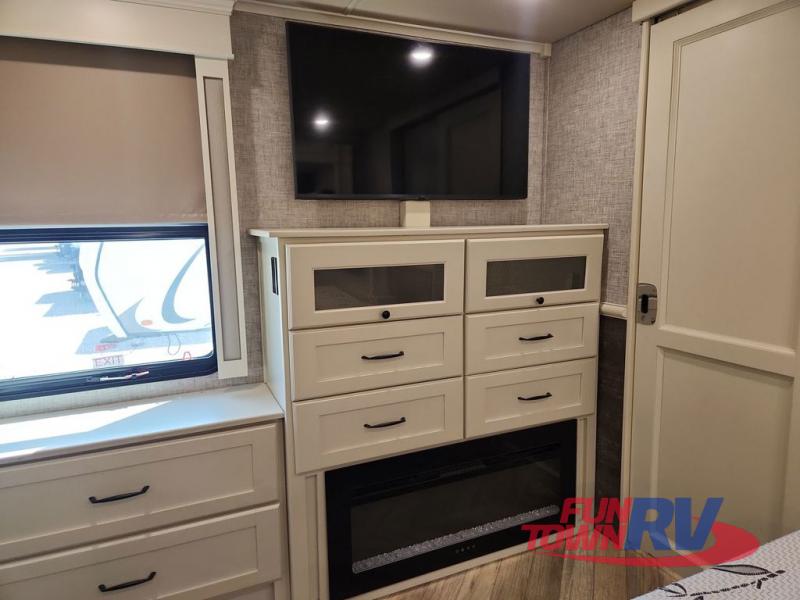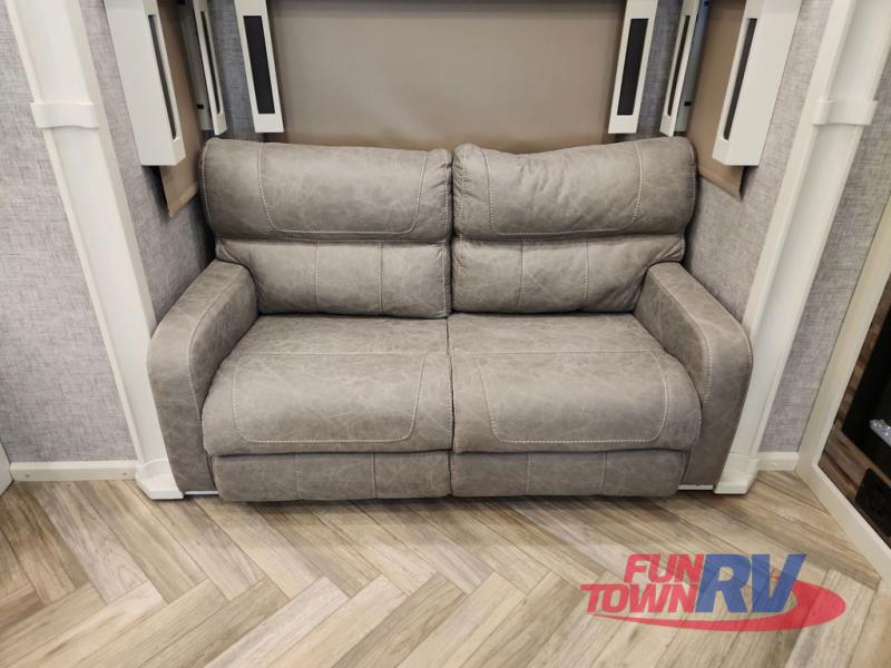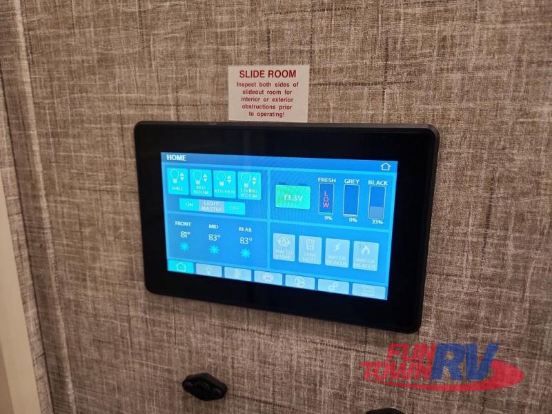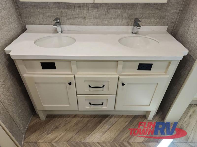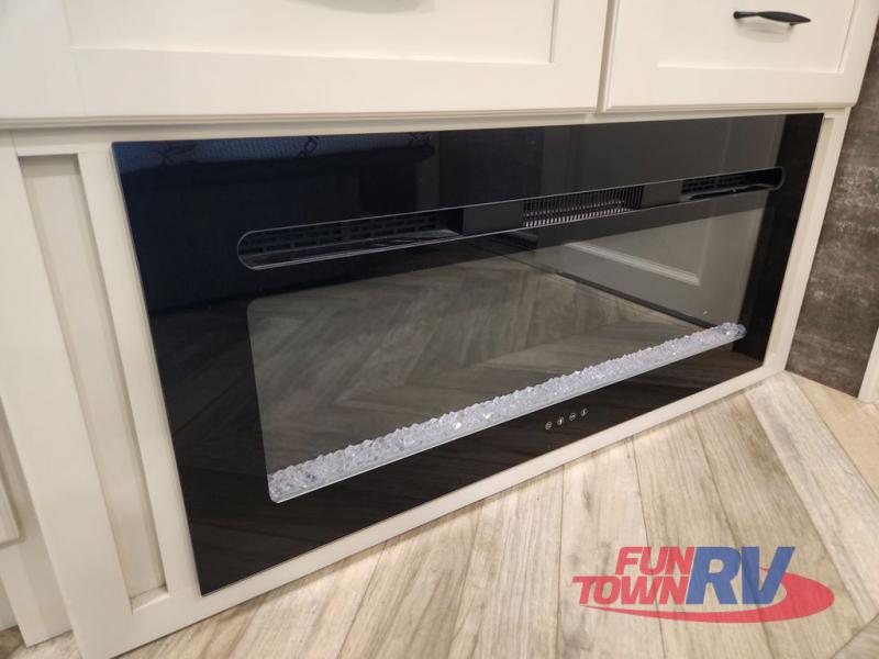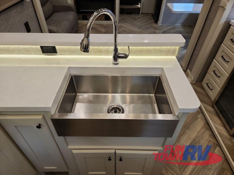 It won't take you long to fall in love with this luxurious fifth wheel. The rear kitchen is any chef's dream with its farmhouse sink without a divider, an Insignia oven and cooktop, and tons of counter space. After dinner, head to the middle living area that includes dual opposing slides for maximum space, and plenty of seating choices on the tri-fold sofa, the theater sofa, and the dinette with chairs. What could be better than a front full bath with dual bath sinks and a closet with shelves and shoe storage? A convenient half bath just for your guests! And don't forget about the master bedroom with a slide out king bed, sliding doors for more space, and your own fireplace.