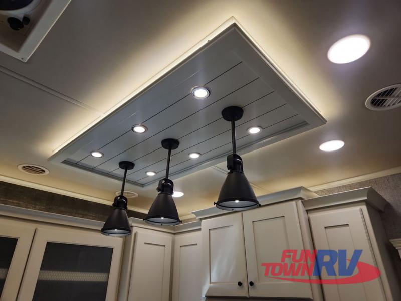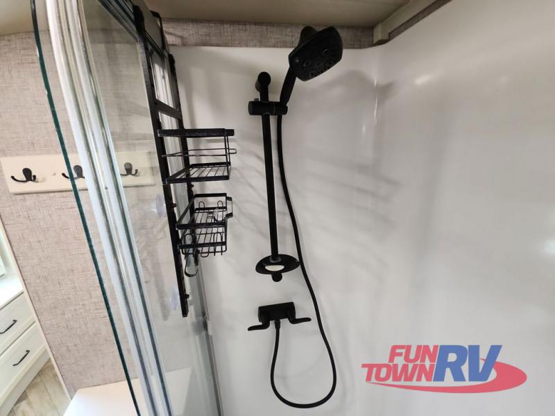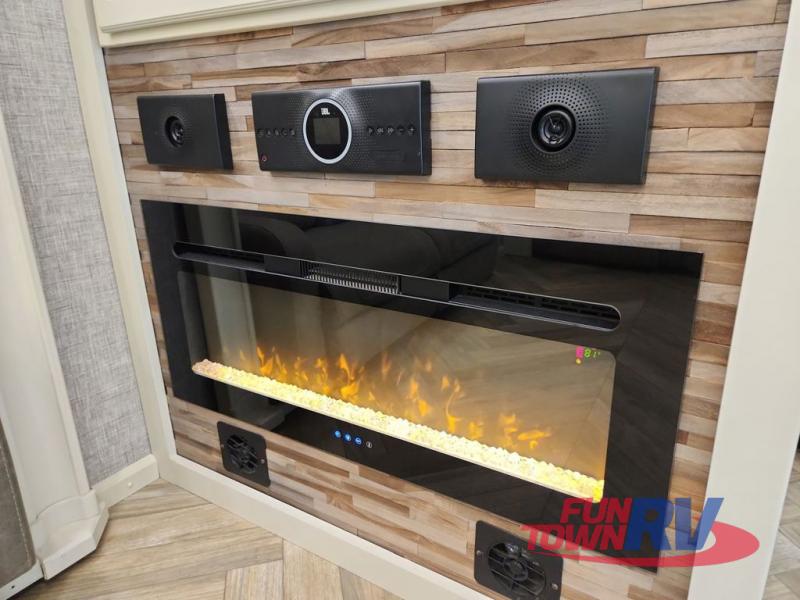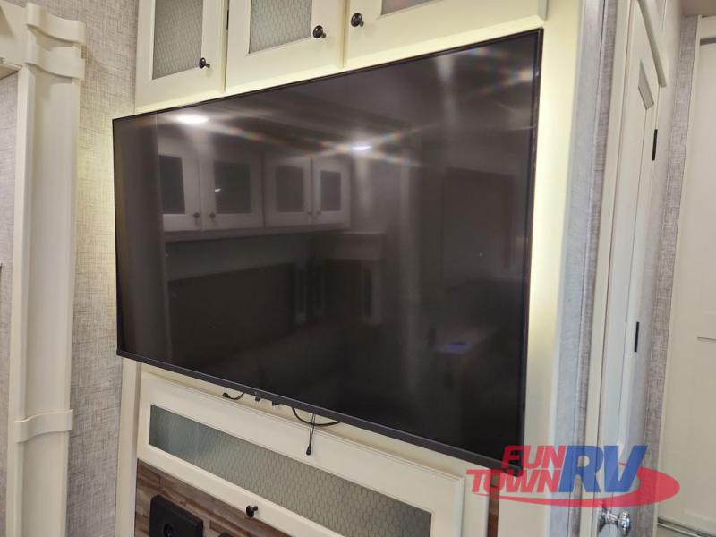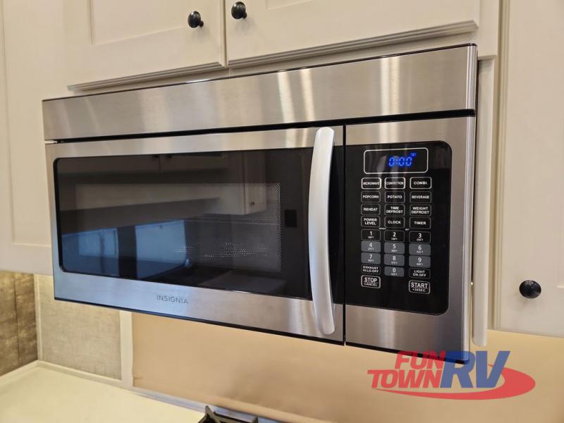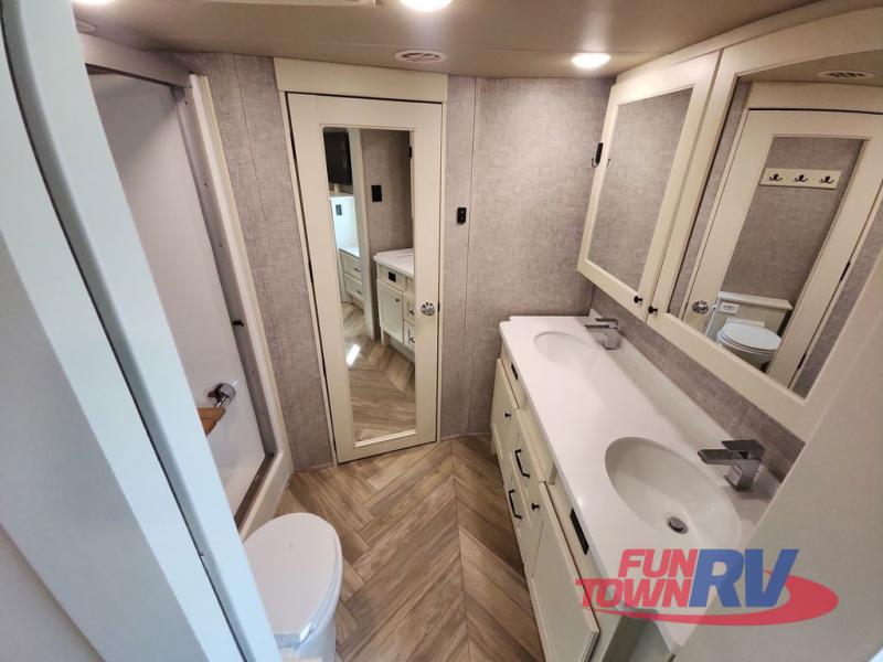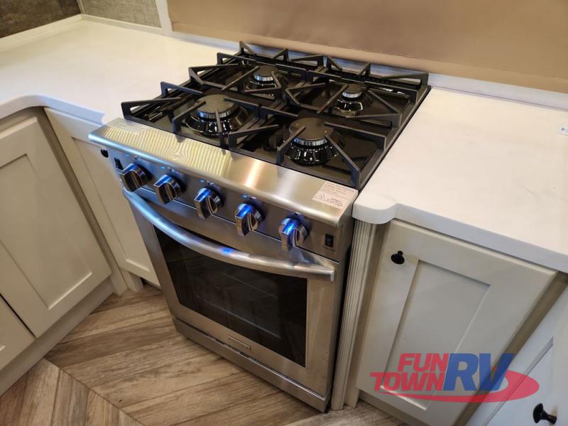 It won't take you long to fall in love with this luxurious fifth wheel. The rear kitchen is any chef's dream with its farmhouse sink without a divider, an Insignia oven and cooktop, and tons of counter space. After dinner, head to the middle living area that includes dual opposing slides for maximum space, and plenty of seating choices on the tri-fold sofa, the theater sofa, and the dinette with chairs. What could be better than a front full bath with dual bath sinks and a closet with shelves and shoe storage? A convenient half bath just for your guests! And don't forget about the master bedroom with a slide out king bed, sliding doors for more space, and your own fireplace.